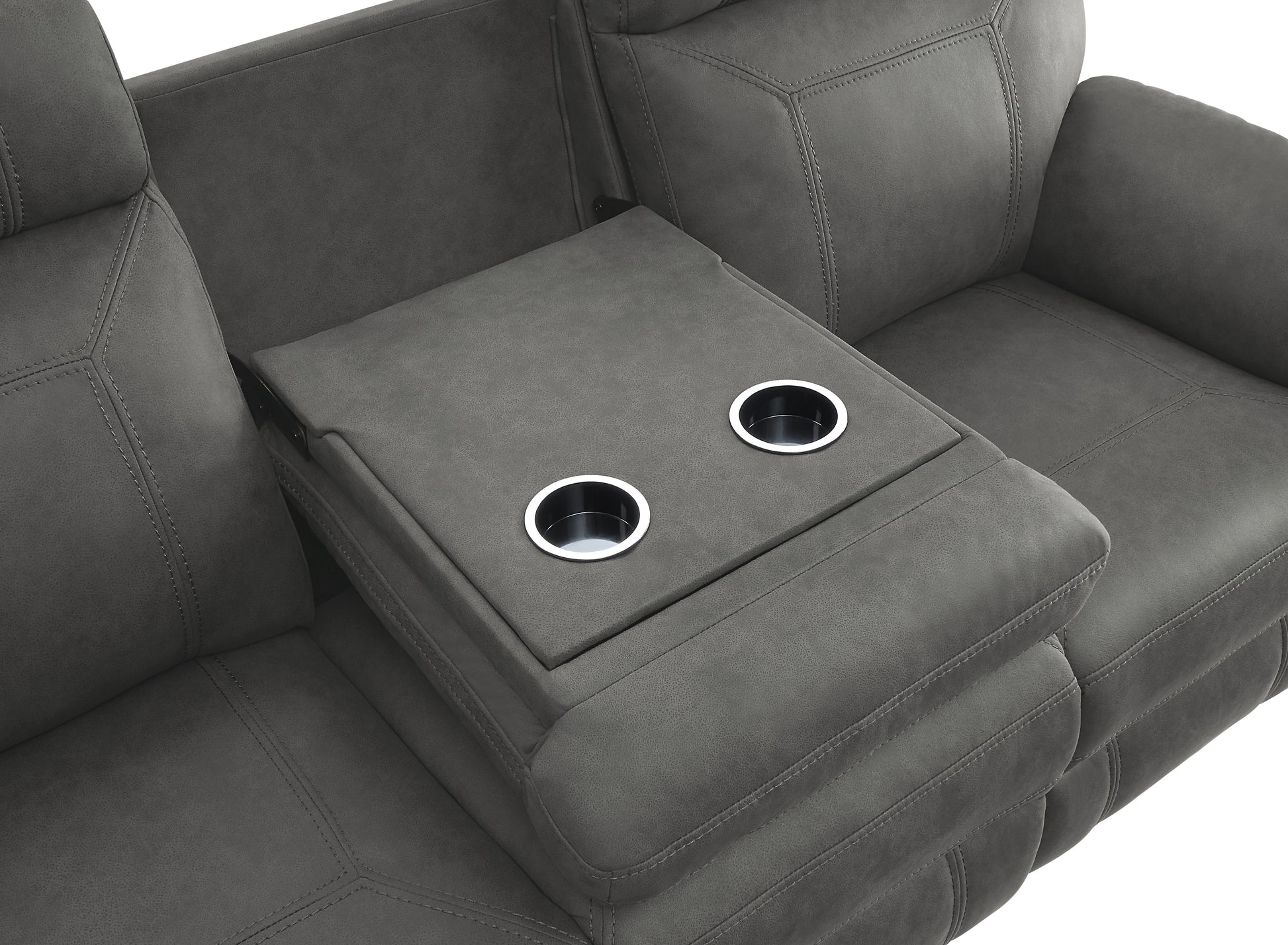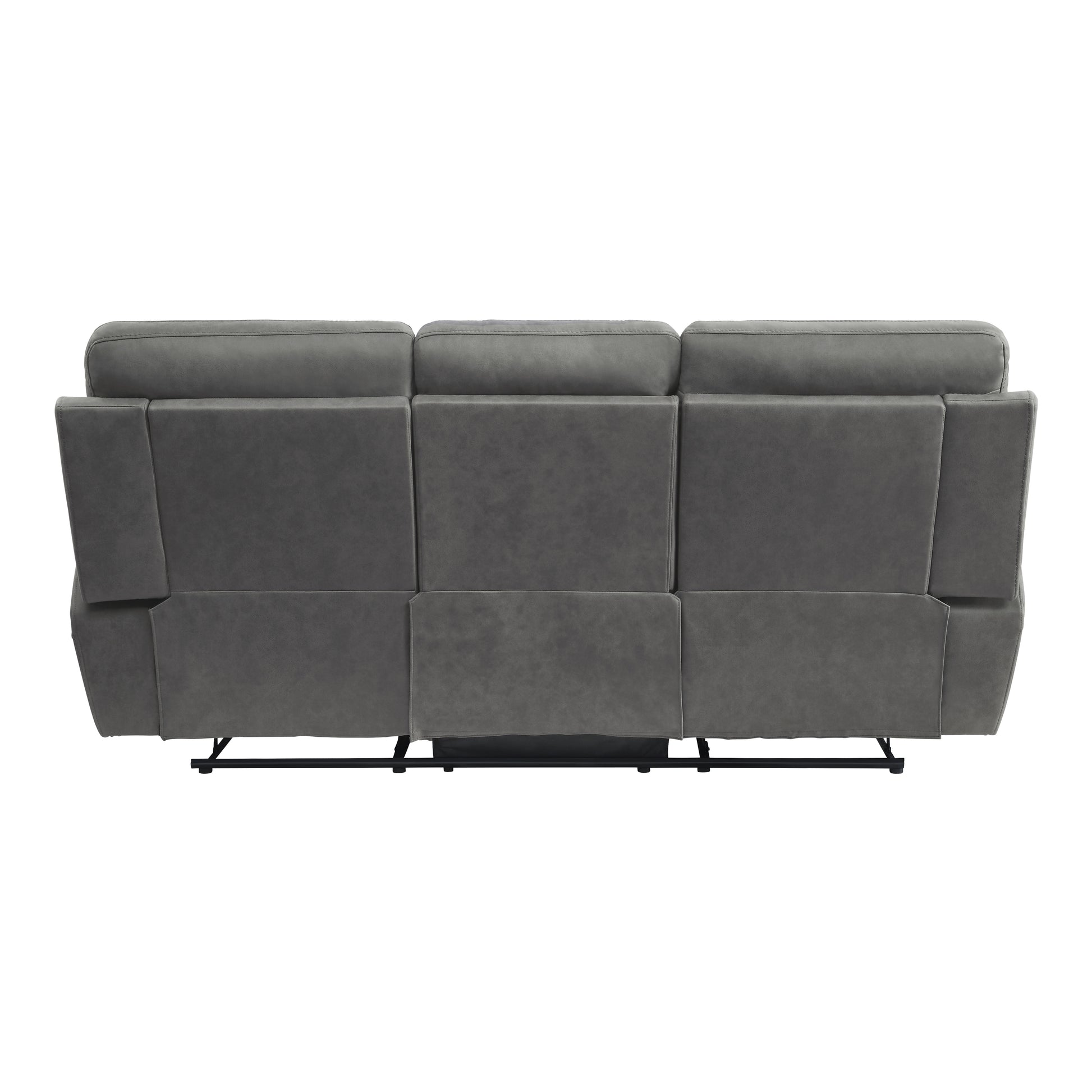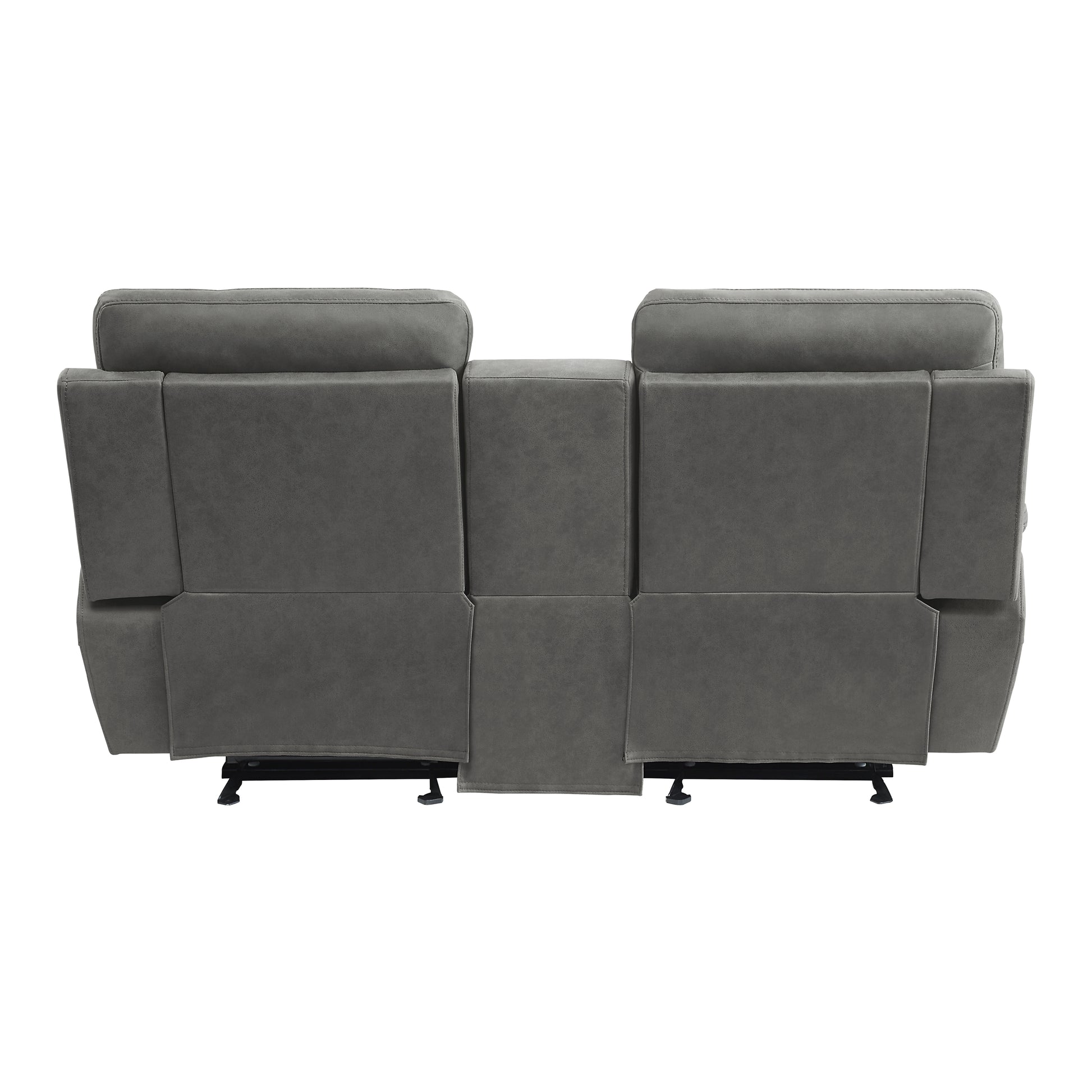 The modern profile of the Clifton Collection serves to provide comfort, function and style to your home’s casual living room. The gray polished microfiber that covers the plush arms and seating of the sofa, love seat and chair lends to the decorative versatility of the collection. The sofa features dual reclining ends and a drop down center seat back with cup-holders and tabletop, the dual glider reclining ends of the love seat – with center console featuring cupholders and storage – and the glider reclining chair all feature manual motion mechanisms operate with the pull of a side-mounted tab, that once engaged, take you from seated to reclined in an easy motion.