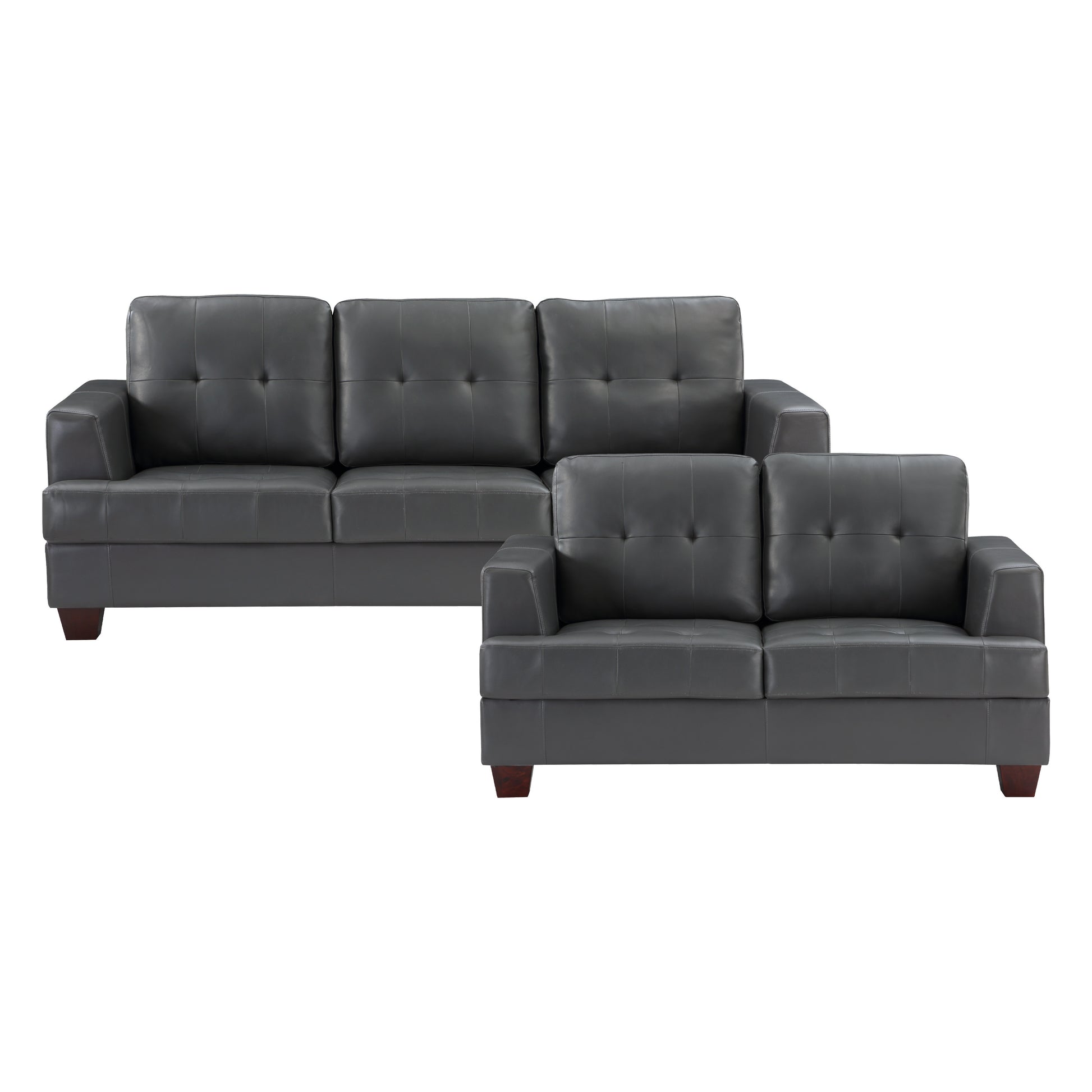 With a profile that hints at modern design and a color palette that serves as a neutral accent to your home, the Hinsall Collection will be a welcome and comfortable addition to your living room. Gray premium faux leather upholstery covers this seating group allowing for versatile decorative styling. Track arms and contour stitch tufting further lend to the modern look.