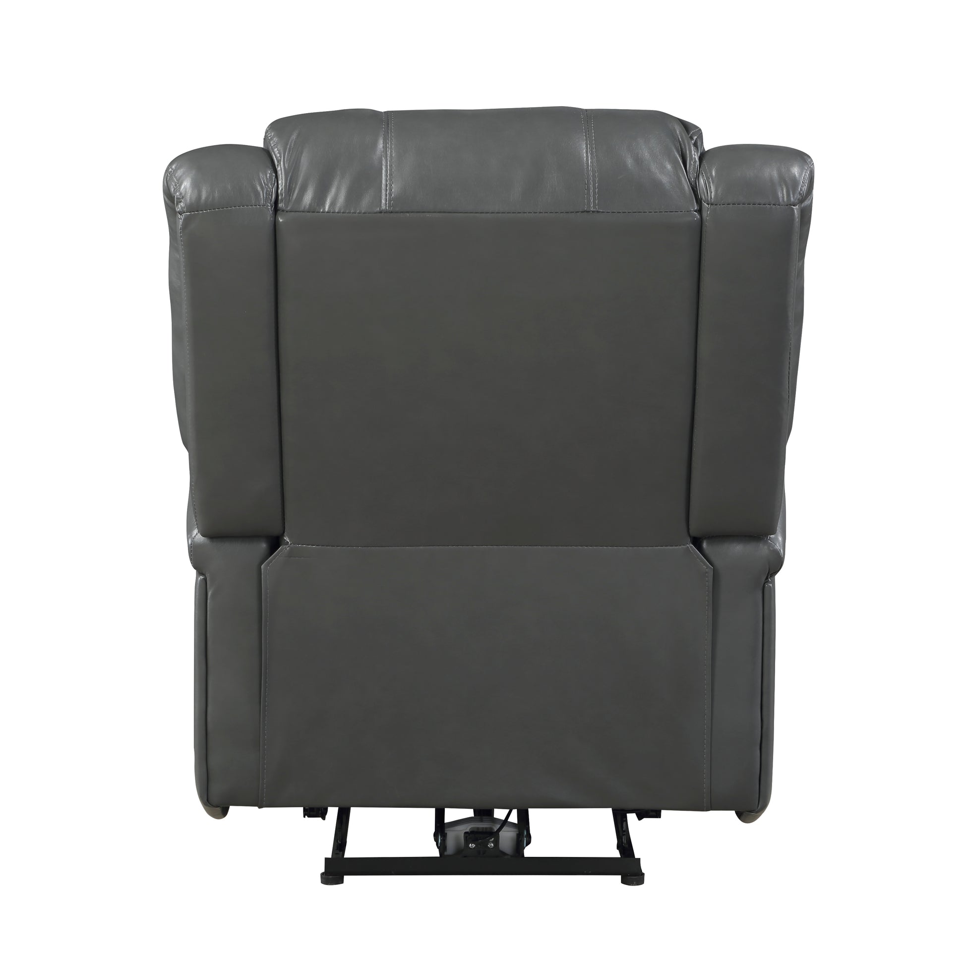 The contoured arms and plush seating of the Foxcroft Collection are covered in gray faux leather upholstery, combing to take your comfort to the next level. When the one-touch power reclining mechanism is activated you are taken from a seated to reclined position in one easy movement.