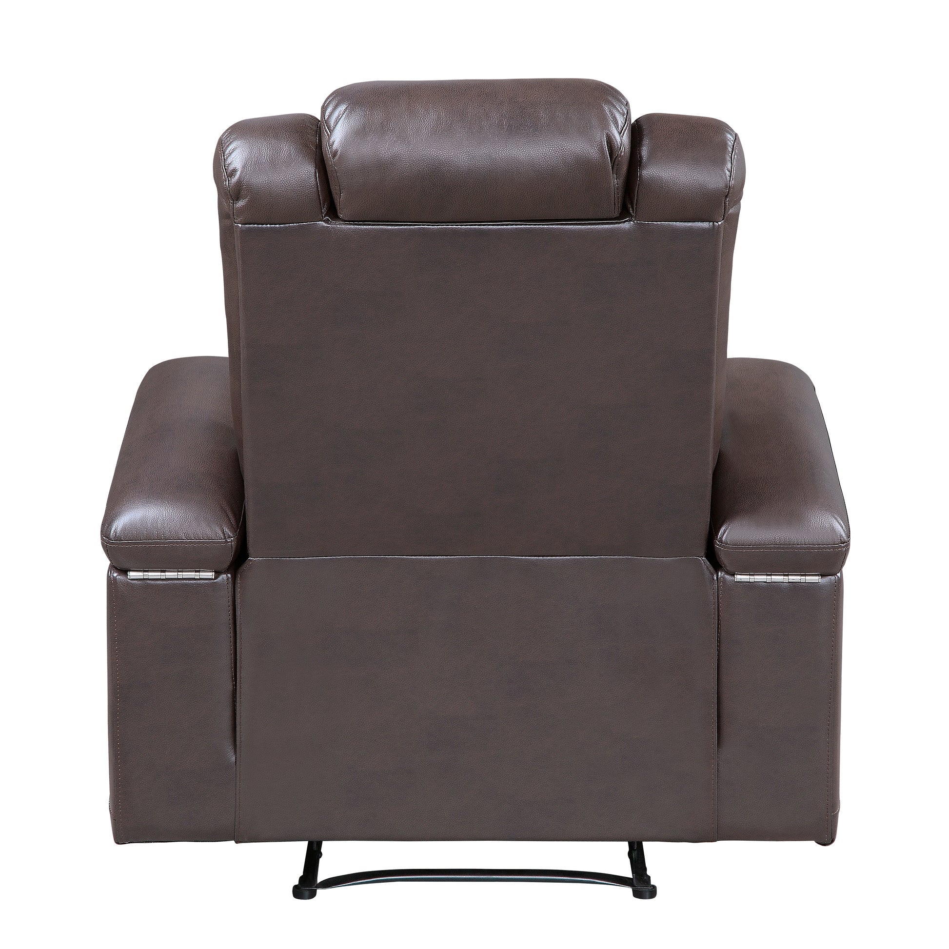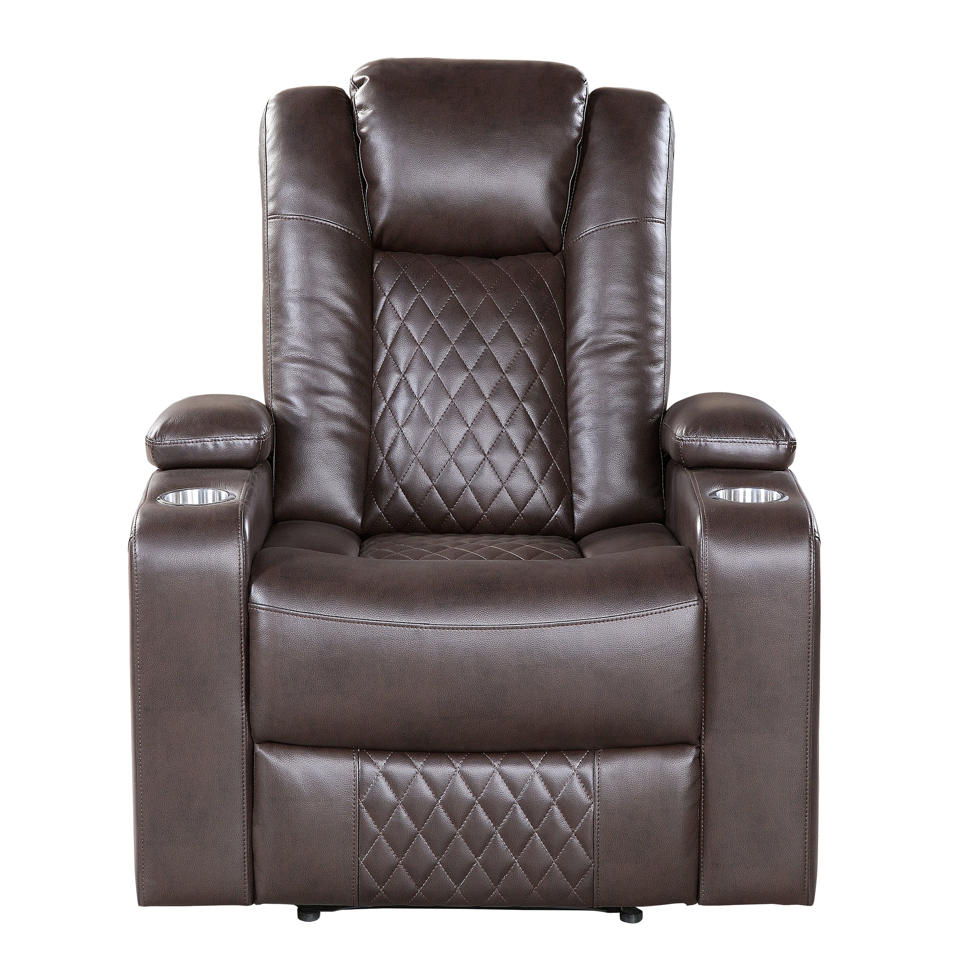 The well-appointed Caelan Collection pairs functional accessories with plush seating, allowing for your maximum efficiency while relaxing. The power motion reclining chair features a power headrest, storage arms, cupholder and USB ports. The collection is covered in dark brown premium faux leather upholstery and has diamond pattern stitching on the seatbacks that provide decorative accent to the group.