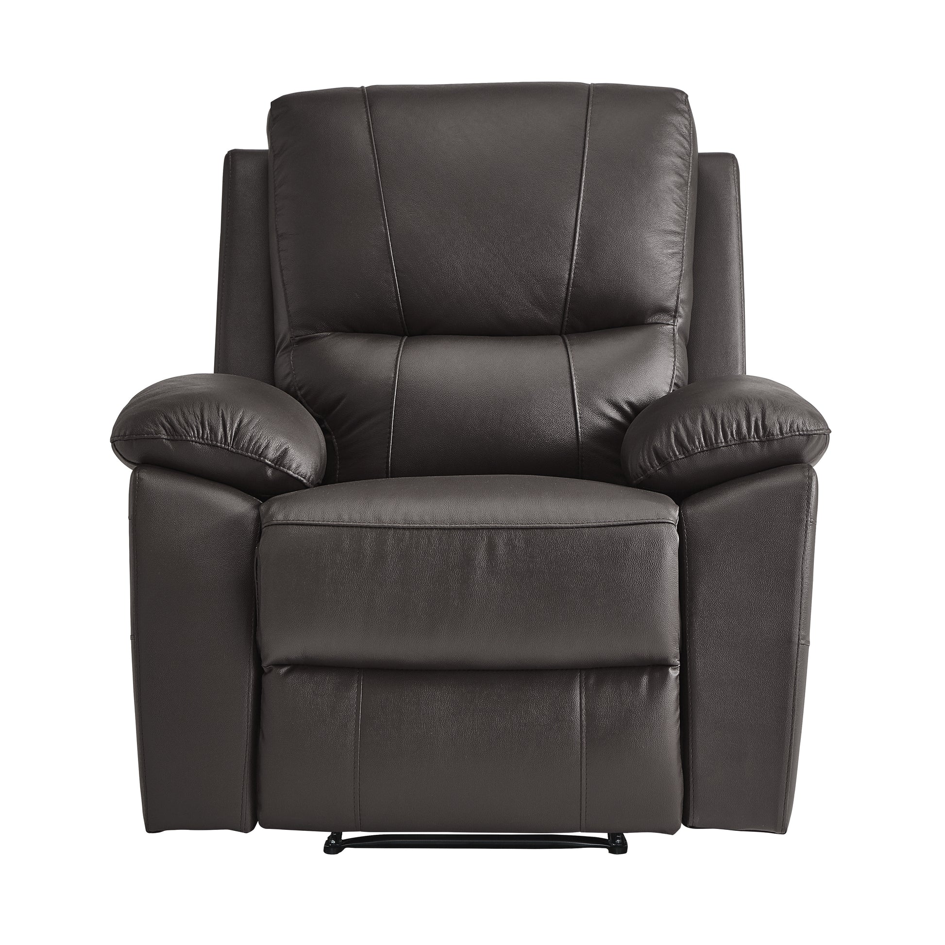 The Dawson Collection’s plush seating, pillow-top arms and versatile look make for the perfect addition to your home’s casual living space. Brown faux leather upholstery covers the chair. The Dawson Collection’s manual motion mechanism operates with the pull of a side-mounted tab, that once engaged, takes you from seated to reclined in an easy motion.