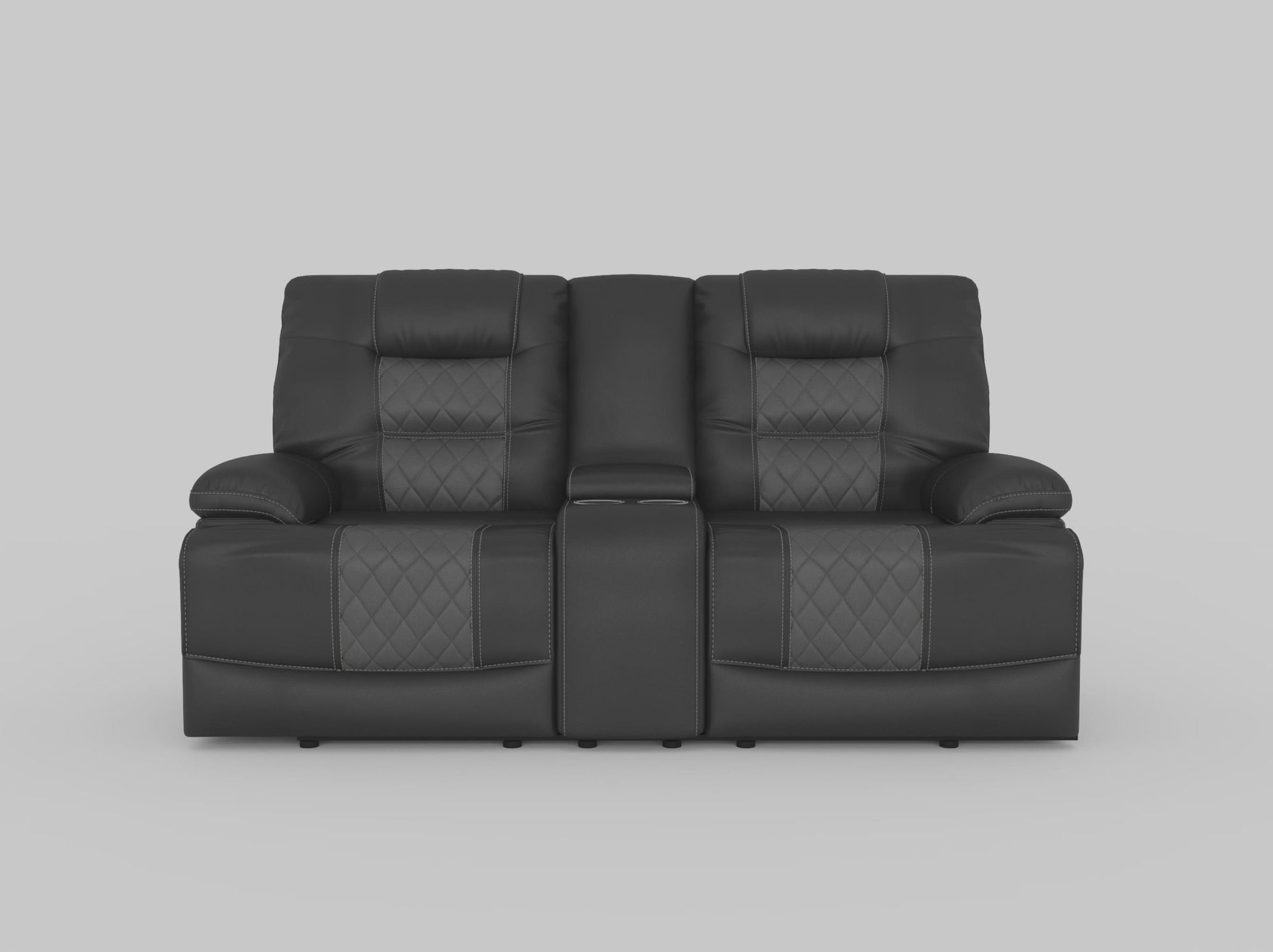 The transitional profile of the Fabian Collection is given a modern edge with the diamond stitching of the seats and electronic conveniences. The dual glider love seat features manual reclining mechanisms allowing for ease of motion when going from seated to reclined. Additional functionality comes in the form of the love seat’s console, its lift-top hidden compartment featuring USB ports, receptacles, and cupholders providing a convenient spot for beverage and accessory storage. Breathable faux leather upholstery is featured in a complementing contrast of two-tone gray for perfect pairing to your home’s décor.