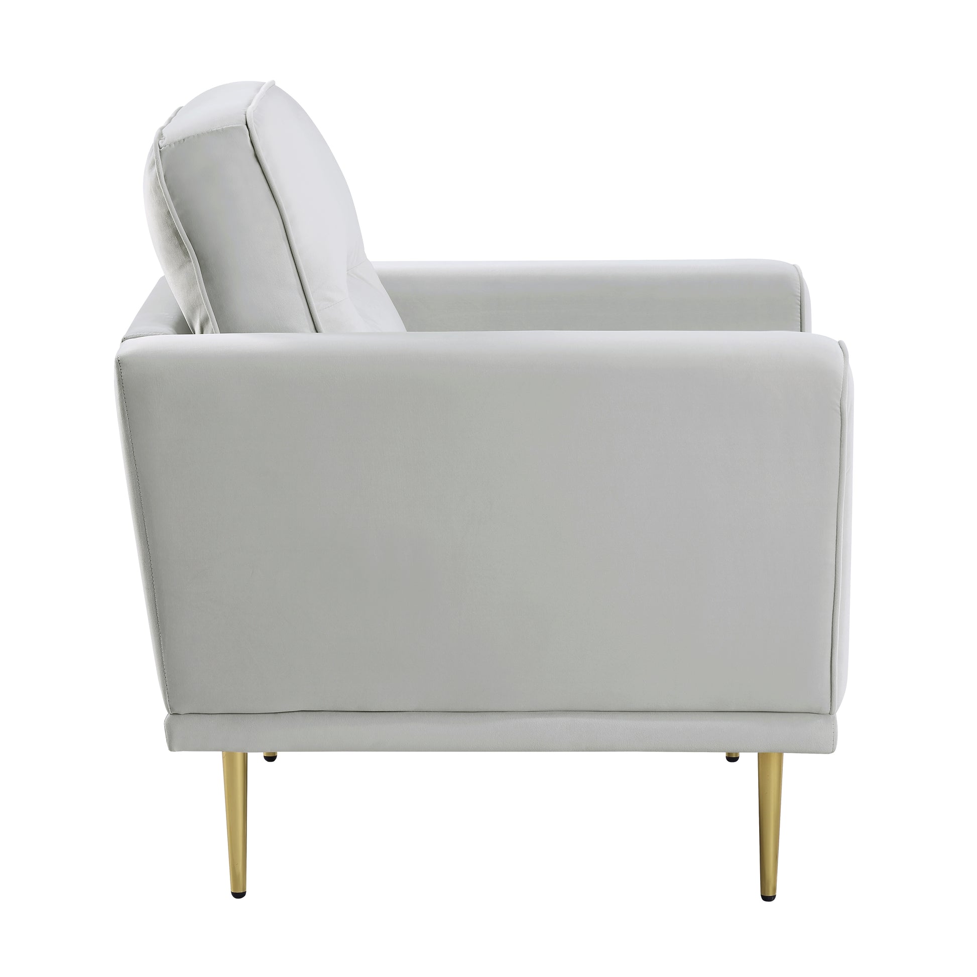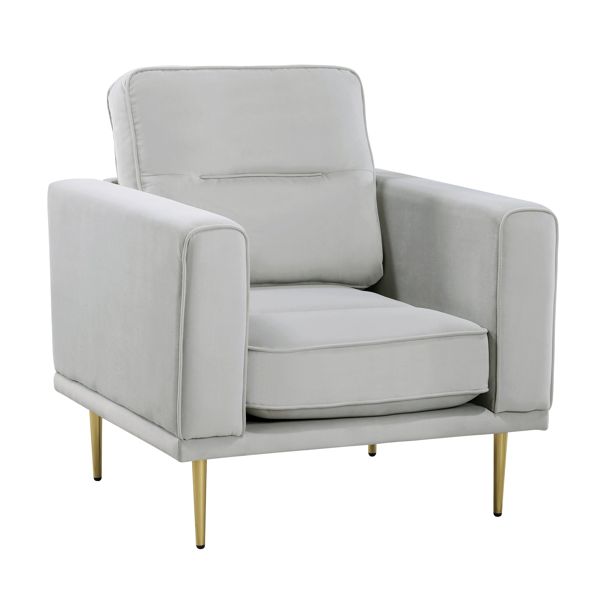 Modern lines, glamorous texture and exquisite style comprise the design of the Violetta Collection. Track style arms provide defining detail to the profile of the chair while gold finish metal legs lend support and stunning contrast. Gray velvet fabric upholstery lends a soft touch to your seated experience, while reversible back cushions further the functionality of the collection.