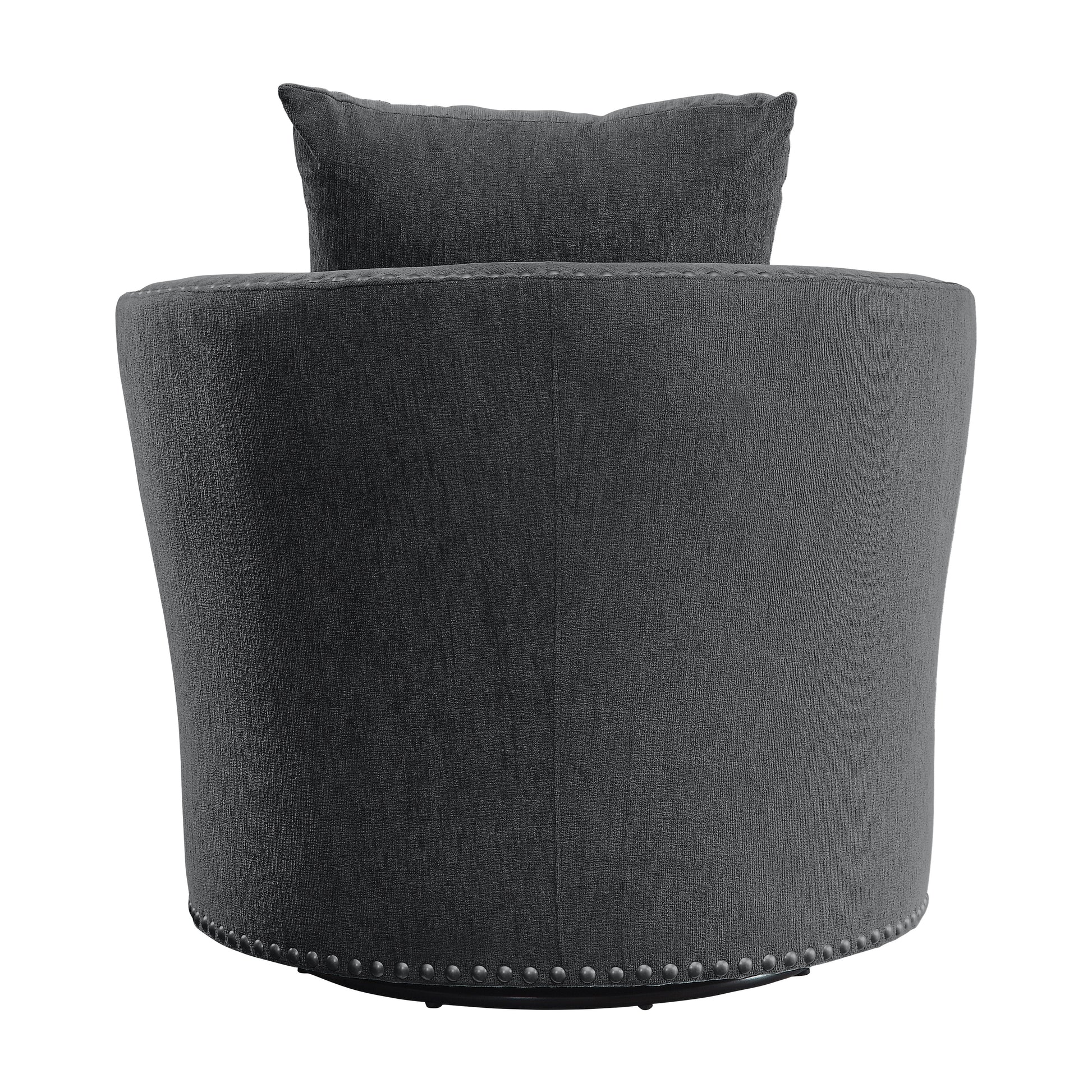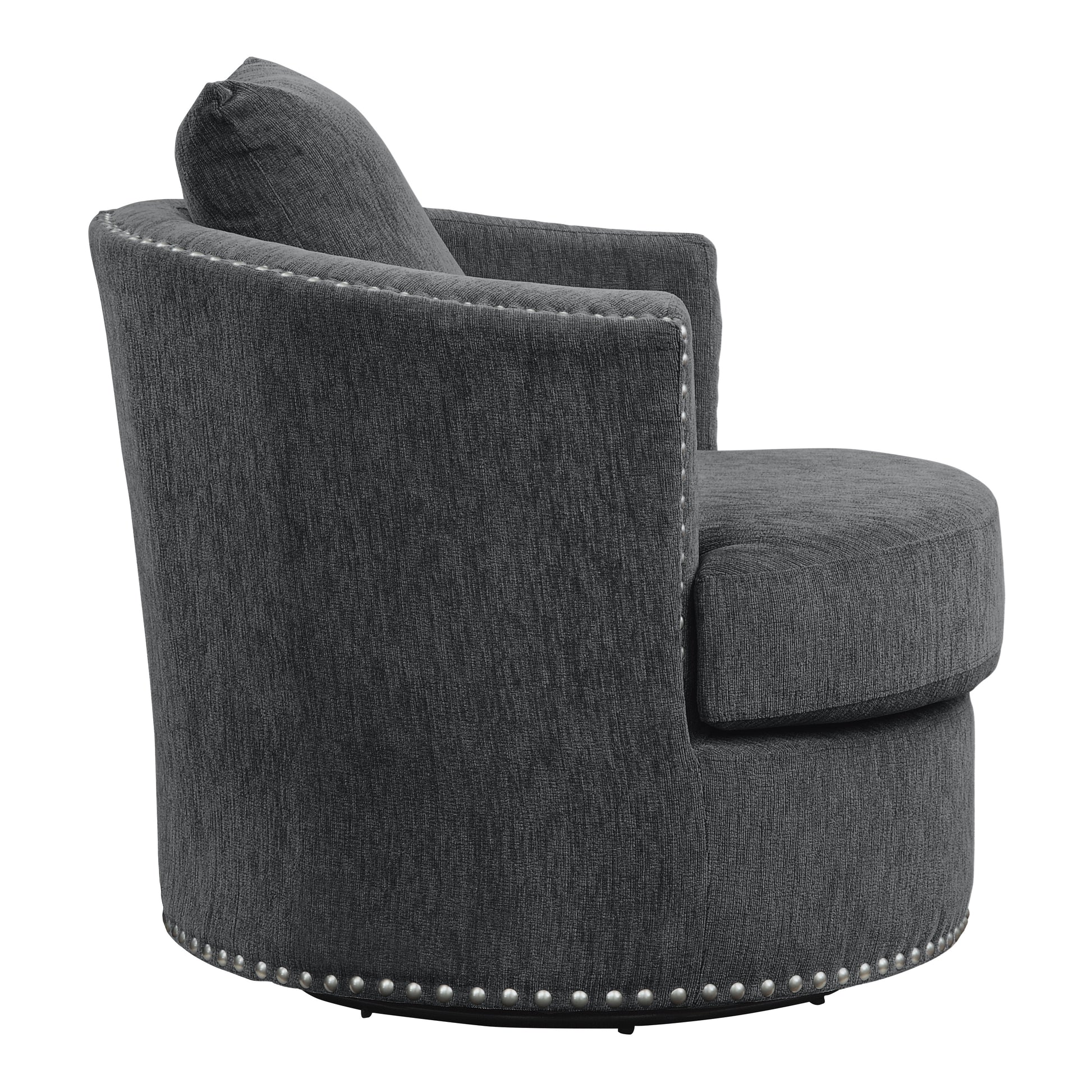 A perfect addition to your casual living room, the Morelia Collection’s decoratively flexible style allows for placement in myriad living room settings. Covered in charcoal-hued chenille, the profile of this swivel-base chair is defined by its nailhead trim, loose back cushions and track-style arms, creating a look that is perfect for your home’s living room.