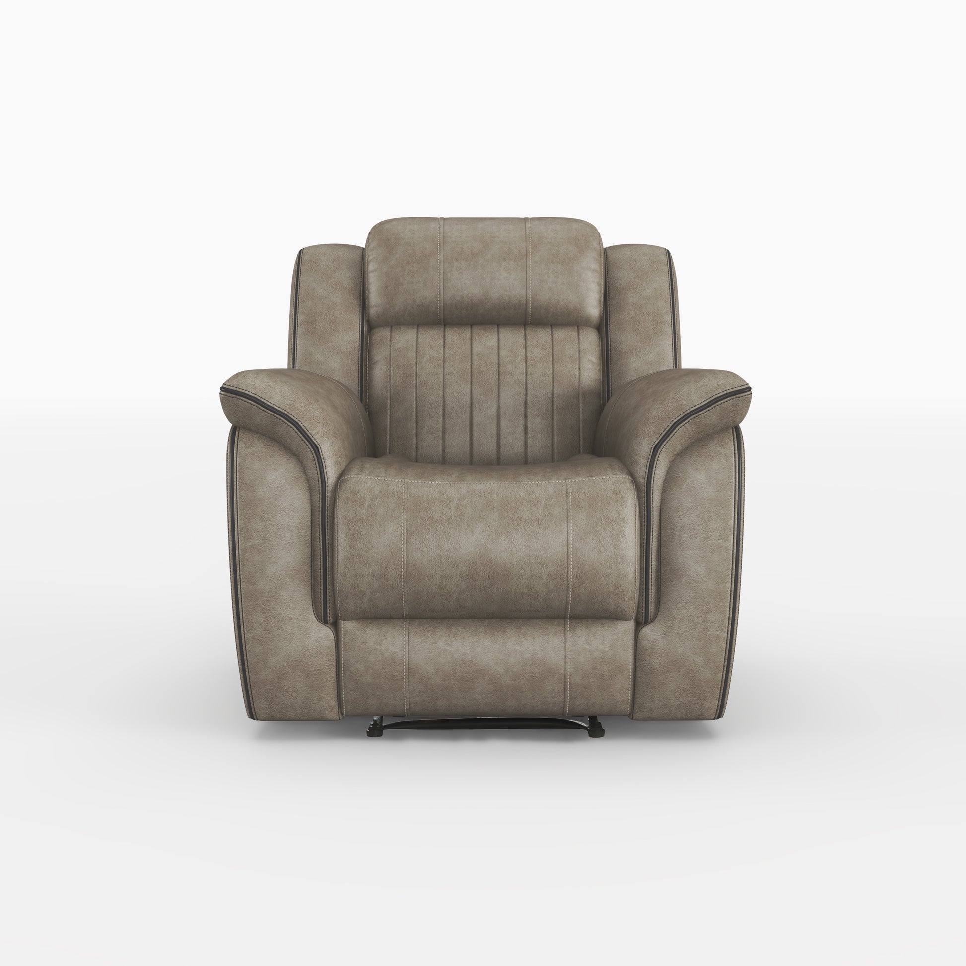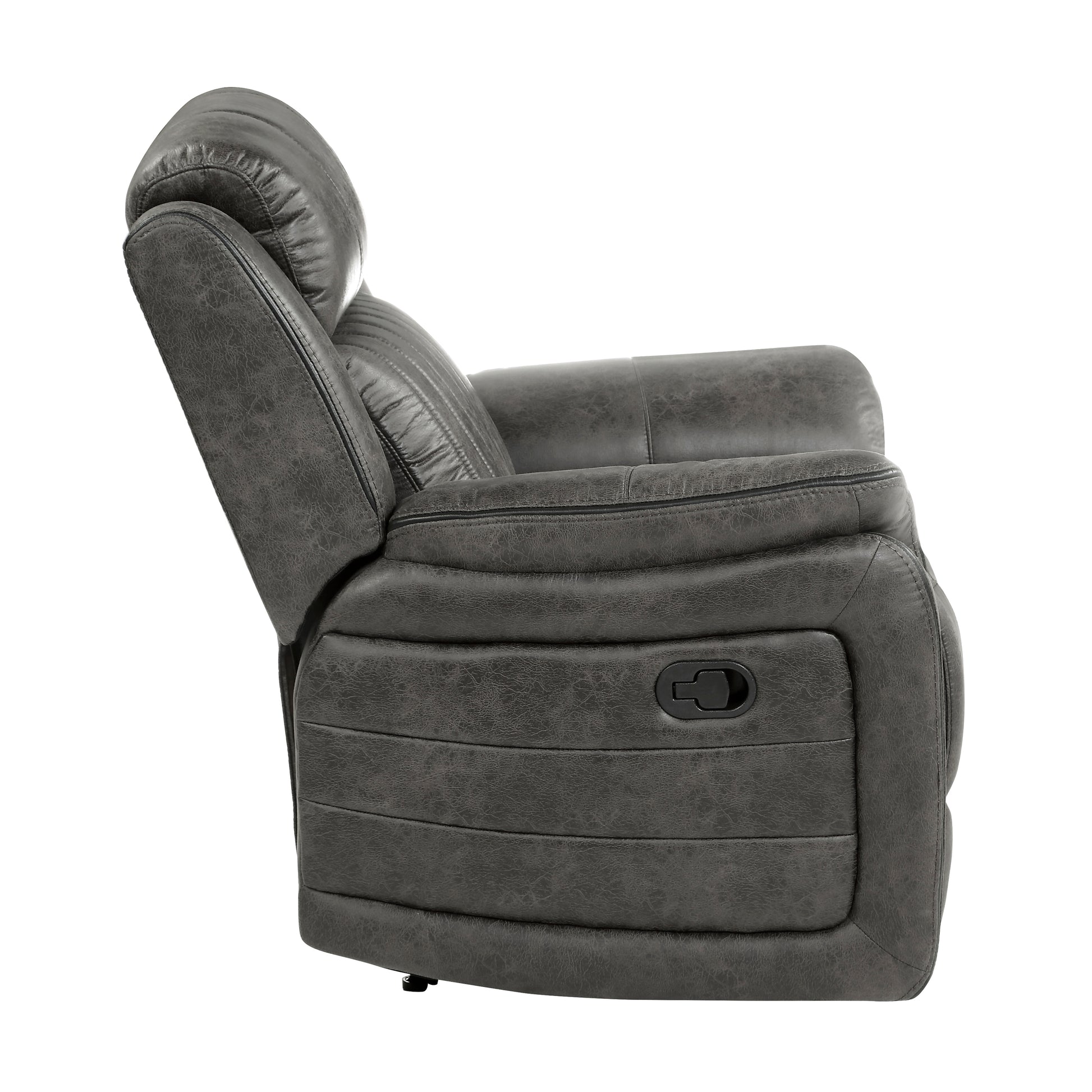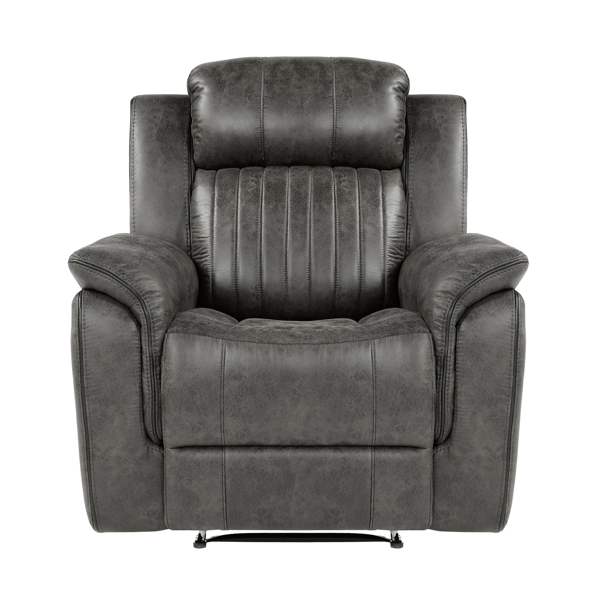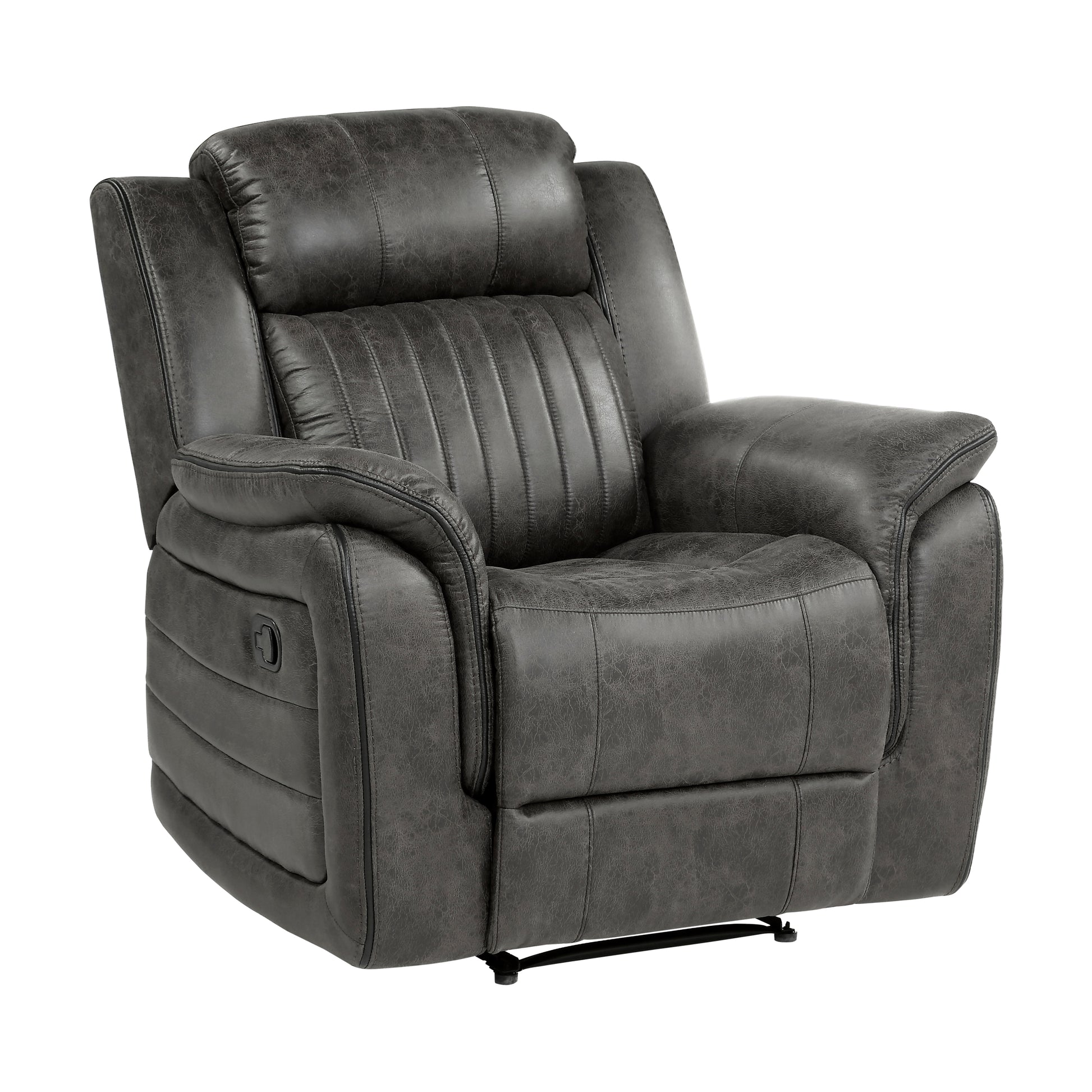 The design of the Centeroak Collection provides a platform for your relaxing downtime. From the classic transitional style to the versatile neutral color of the brown-ish gray polished microfiber fabric covering, this chair is the perfect addition to your living room. Plush seating features vertical tufting, pillow-top arms, enhanced by the reclining mechanism which is engaged with a pull of the side mounted tab, taking you from seated to prone in an easy motion.