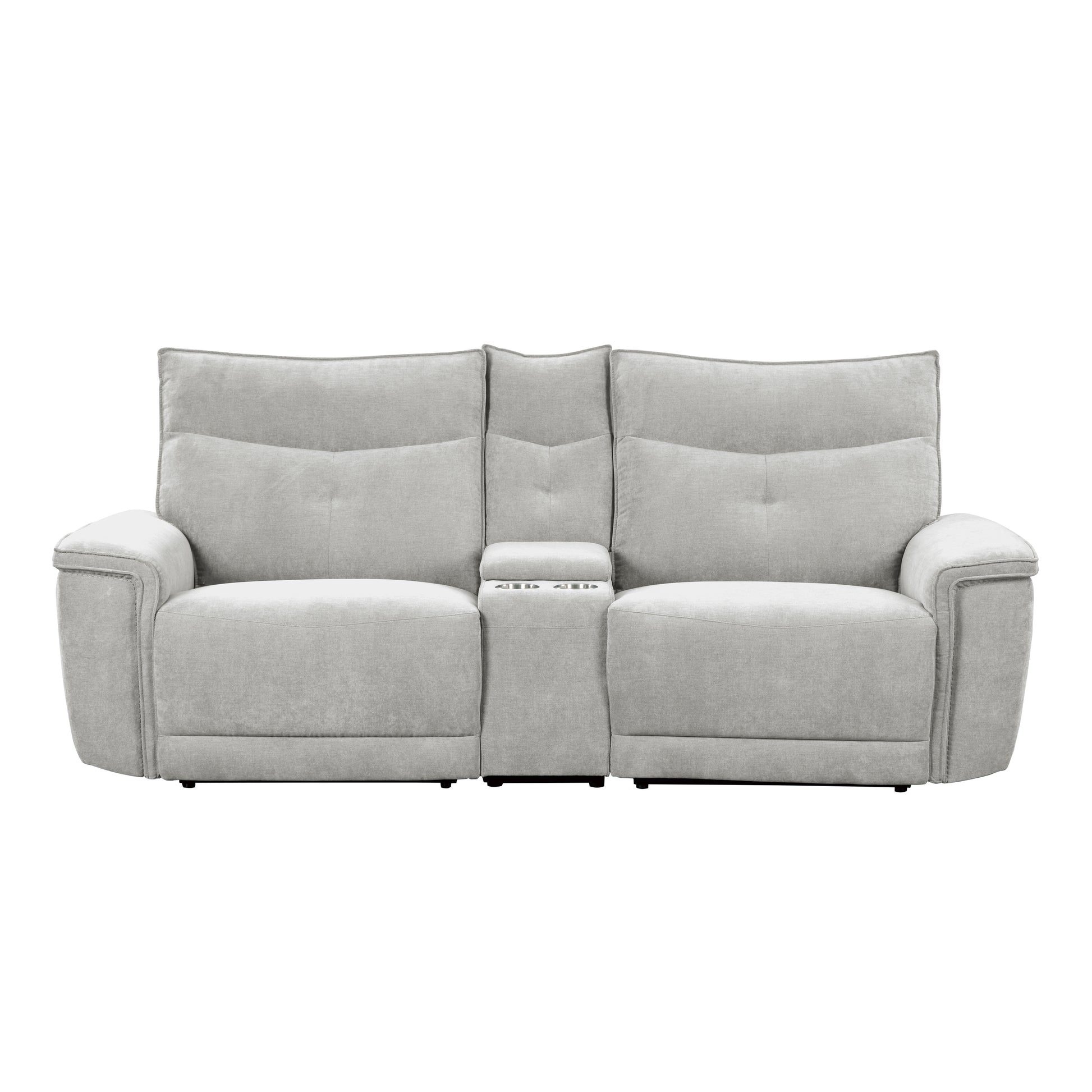 Providing ample seating in modern form the Tesoro Collection. The classic love seat is book-ended by USB port enhanced end power recliners – allowing for maximum versatility when planning the layout of your living room. Mist gray fabric provides a neutral palette for your decorative preferences. The power reclining mechanism of the reclining ends and armless chair brings you to your desired position with a touch of the button. Providing additional support is the USB enhanced ports, console unit - with storage and stainless steel cup holders - and the power operated headrest that allows you to further customize your comfort experience.