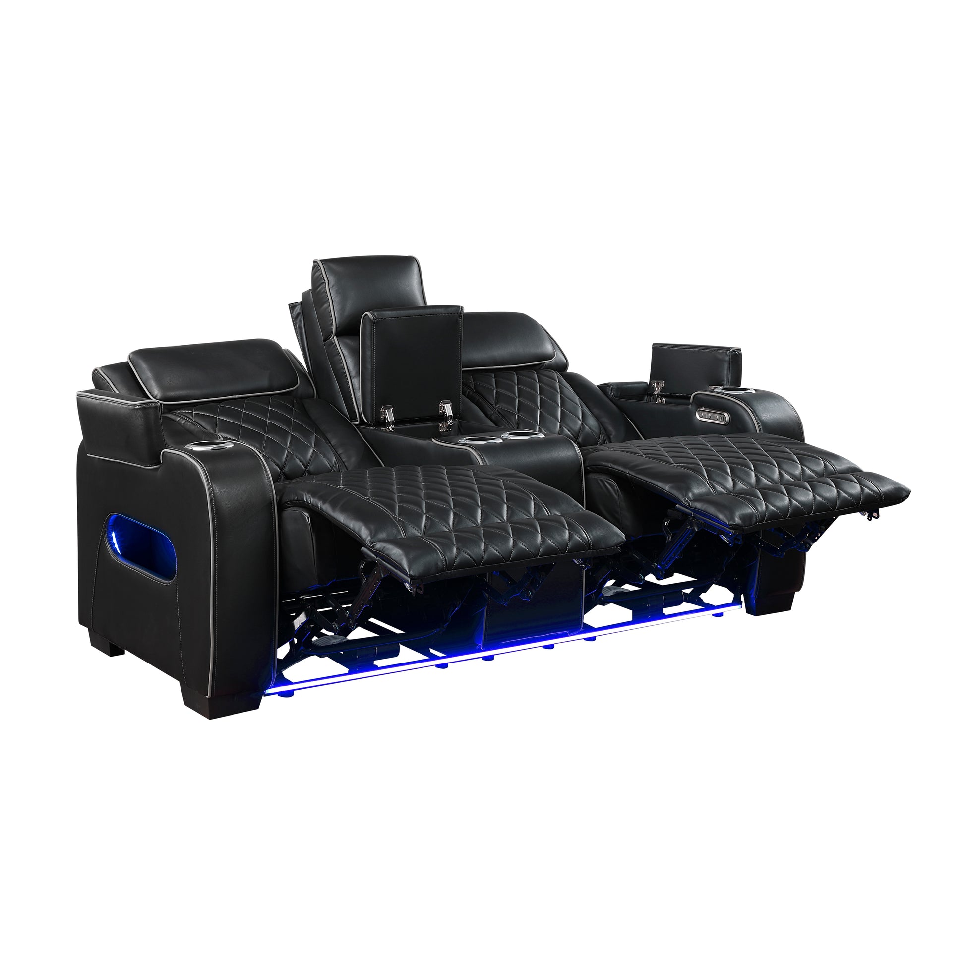 Experience unparalleled comfort and convenience with this black faux leather power double reclining loveseat. This luxurious loveseat is designed for ultimate relaxation with features like independent power reclining, adjustable power headrests, and ambient LED lighting. The center console provides storage and cup holders for added convenience, while built-in USB ports keep your devices charged. Top and side storage arms offer additional storage space for remotes or other essentials. The sleek black faux leather upholstery with diamond-stitched detailing adds a touch of modern sophistication, making this loveseat a perfect centerpiece for your home theater or living room.