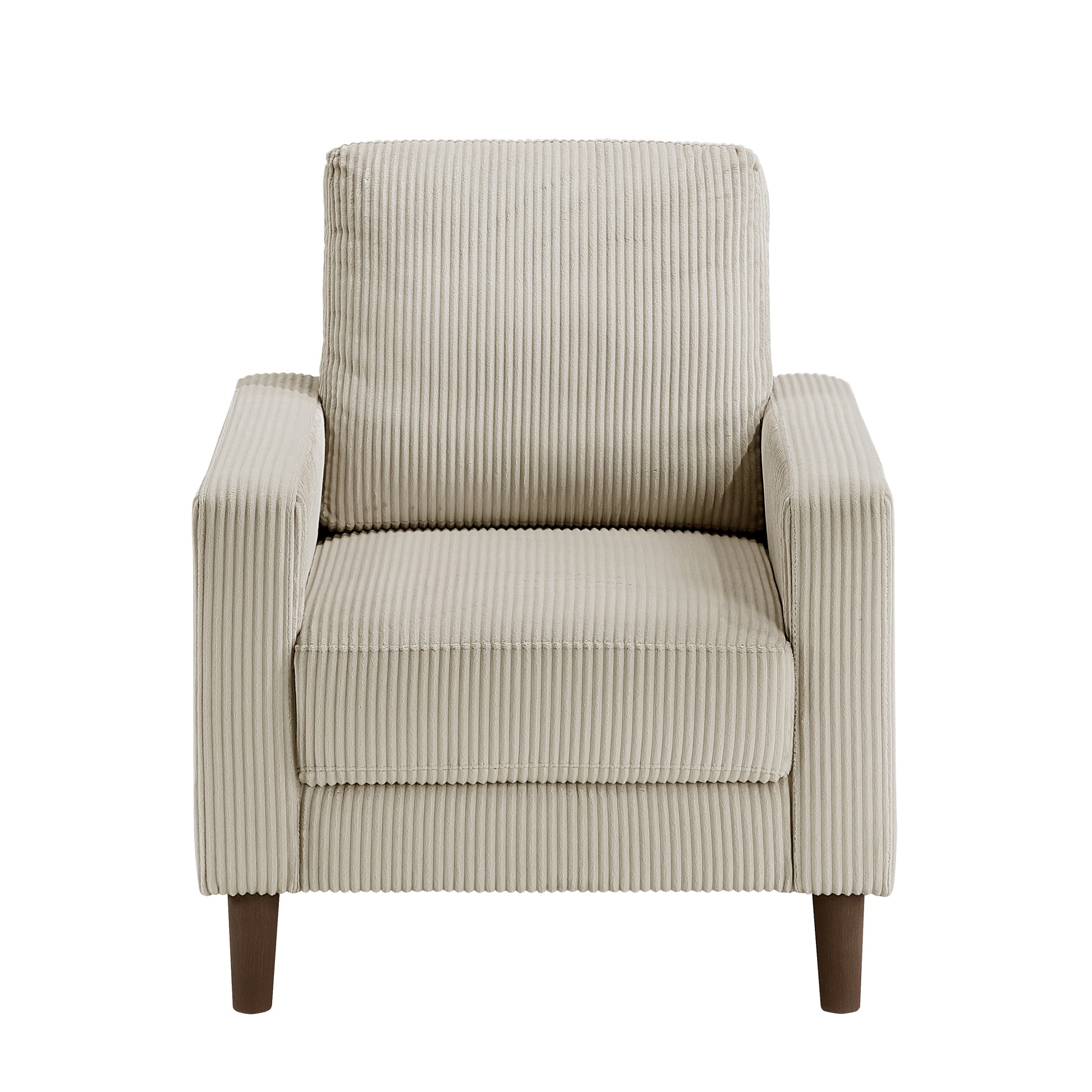 Add a touch of cozy sophistication to your living space with this Track Arm Side Chair. Featuring a soft, textured taupe corduroy upholstery, this chair brings a warm and inviting feel to any room. The clean, modern silhouette is complemented by sturdy brown faux wood finish legs, providing a touch of natural elegance. The generously cushioned seat and back offer exceptional comfort, making this chair perfect for relaxing, reading, or socializing. This versatile piece seamlessly complements a variety of décor styles, making it an ideal addition to your living room, bedroom, or reading nook.