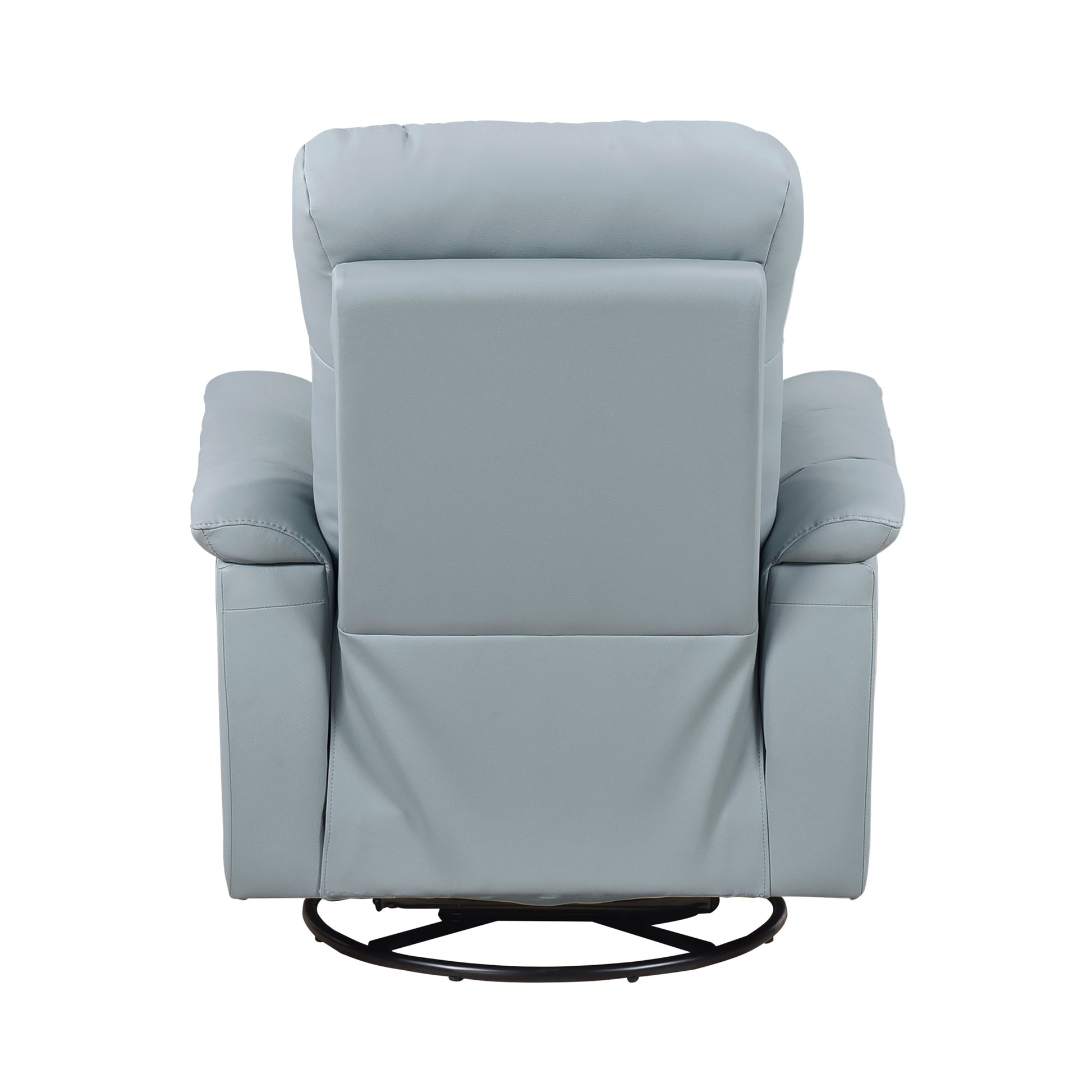 Indulge in luxurious comfort and sophisticated style with this Blue Swivel Glider Recliner. Crafted with 100% top grain leather match, this recliner offers the supple feel of genuine leather in the seating area, while ensuring durability and easy maintenance. The smooth gliding motion and convenient pull tab manual reclining mechanism allow you to effortlessly find your ideal relaxation position. The 360-degree swivel base provides added flexibility, making this recliner perfect for any living space. With its plush, padded cushions and sleek blue design, this recliner is the perfect blend of comfort and elegance.