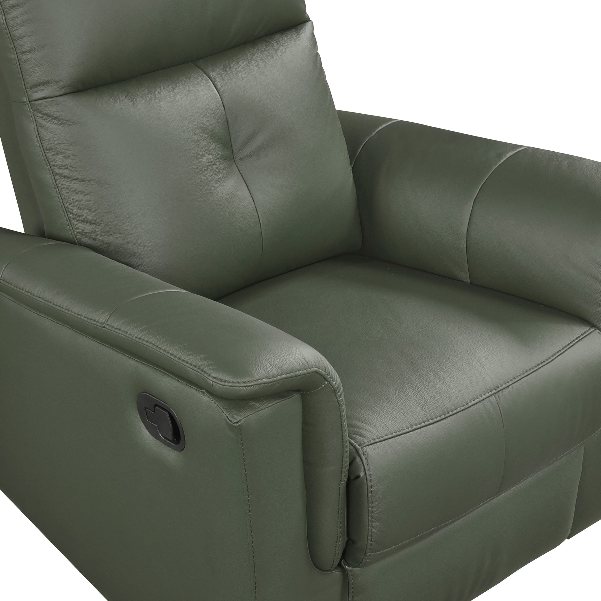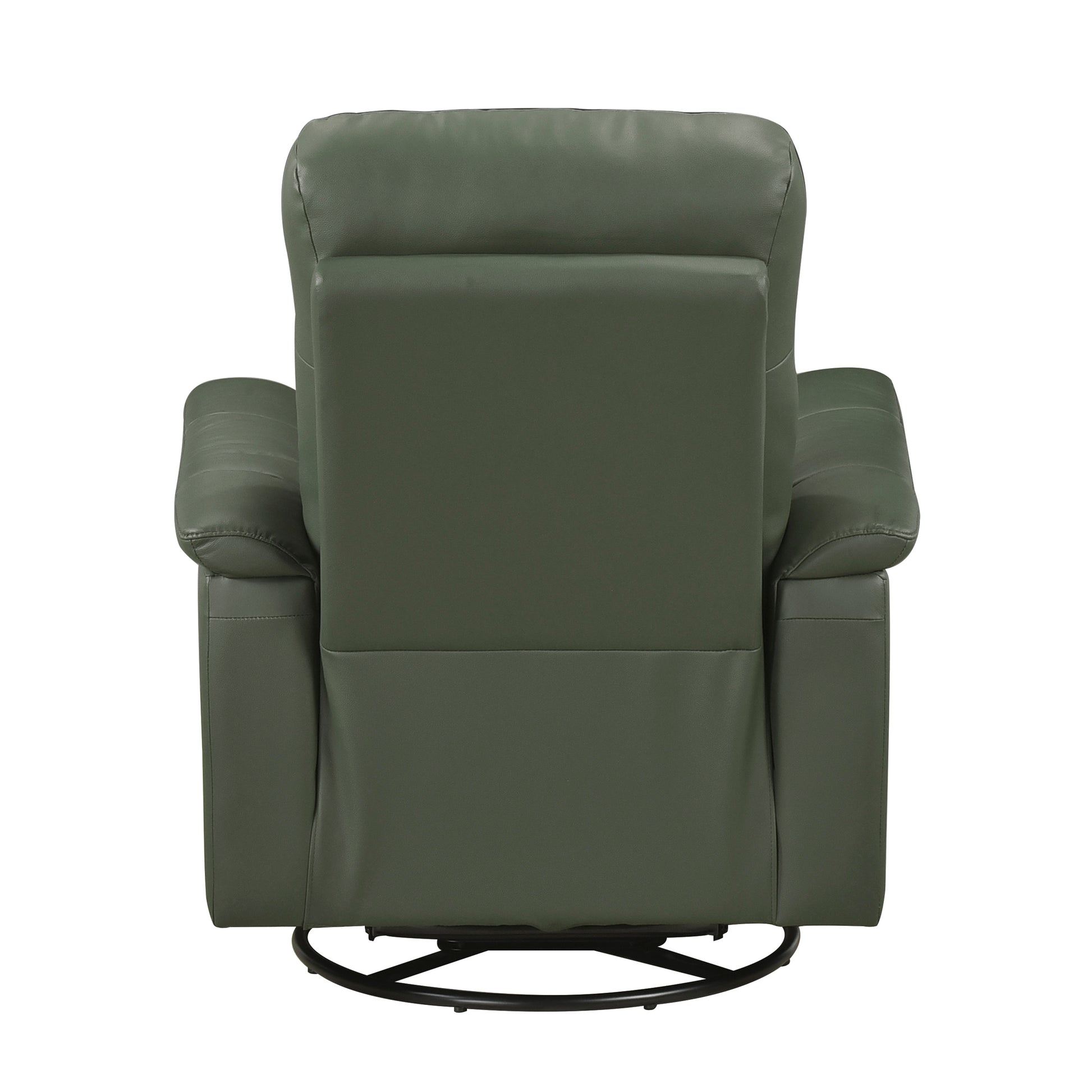 Indulge in luxurious comfort and sophisticated style with this Green Swivel Glider Recliner. Crafted with 100% top grain leather match, this recliner offers the supple feel of genuine leather in the seating area, while ensuring durability and easy maintenance. The smooth gliding motion and convenient pull tab manual reclining mechanism allow you to effortlessly find your ideal relaxation position. The 360-degree swivel base provides added flexibility, making this recliner perfect for any living space. With its plush, padded cushions and sleek green design, this recliner is the perfect blend of comfort and elegance.