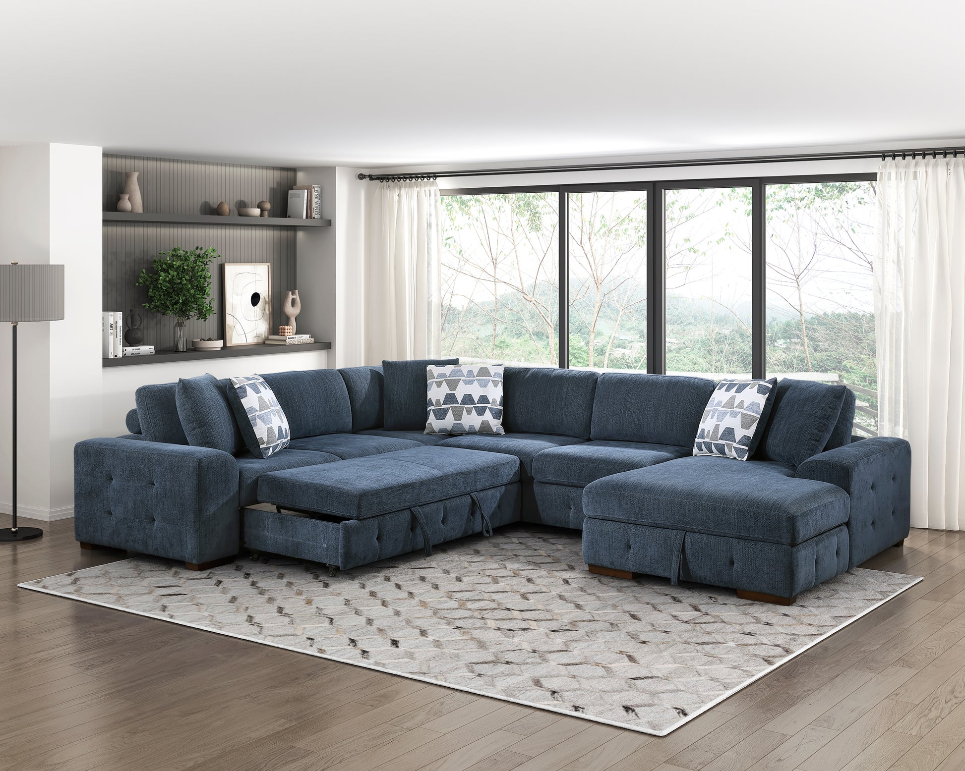The substantial seating space of the Raife Collection creates a comfortable spot perfect for entertaining or just relaxing. The configuration consists of a right-side chaise which is paired with an armless two seat unit, corner unit, and left-side two-seater – with pull out bed and one centimeter of memory foam on the seats. The pull-out bed that is stored beneath the left-side two-seat unit, pops up to create ample space for full leg extension. The lift-top seat of the chaises opens to reveal hidden storage perfect for blankets and pillows. Blue chenille fabric upholstery covers the seating group.