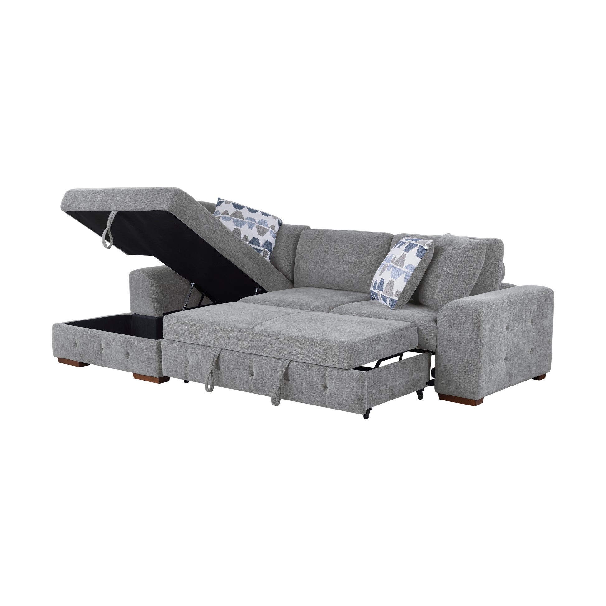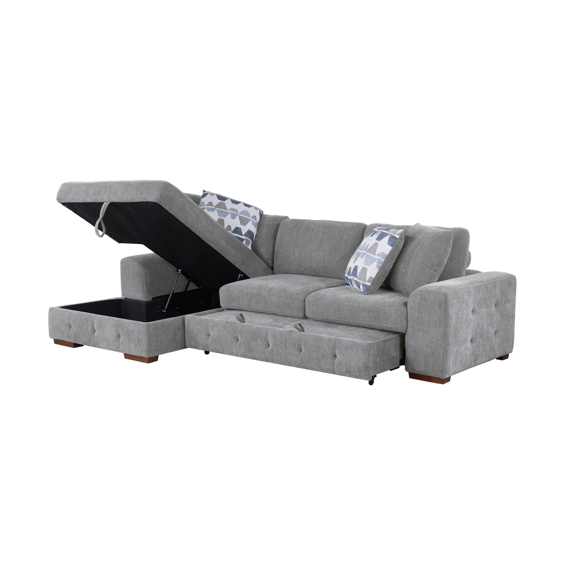The substantial seating space of the Raife Collection creates a comfortable spot perfect for entertaining or just relaxing. The configuration consists of a left-side chaise which is paired with a right-side two-seater – with pull out bed and one centimeter of memory foam on the seats. The pull-out bed that is stored beneath the right-side two-seat unit, pops up to create ample space for full leg extension. The lift-top seat of the chaises opens to reveal hidden storage perfect for blankets and pillows. Gray chenille fabric upholstery covers the seating group.