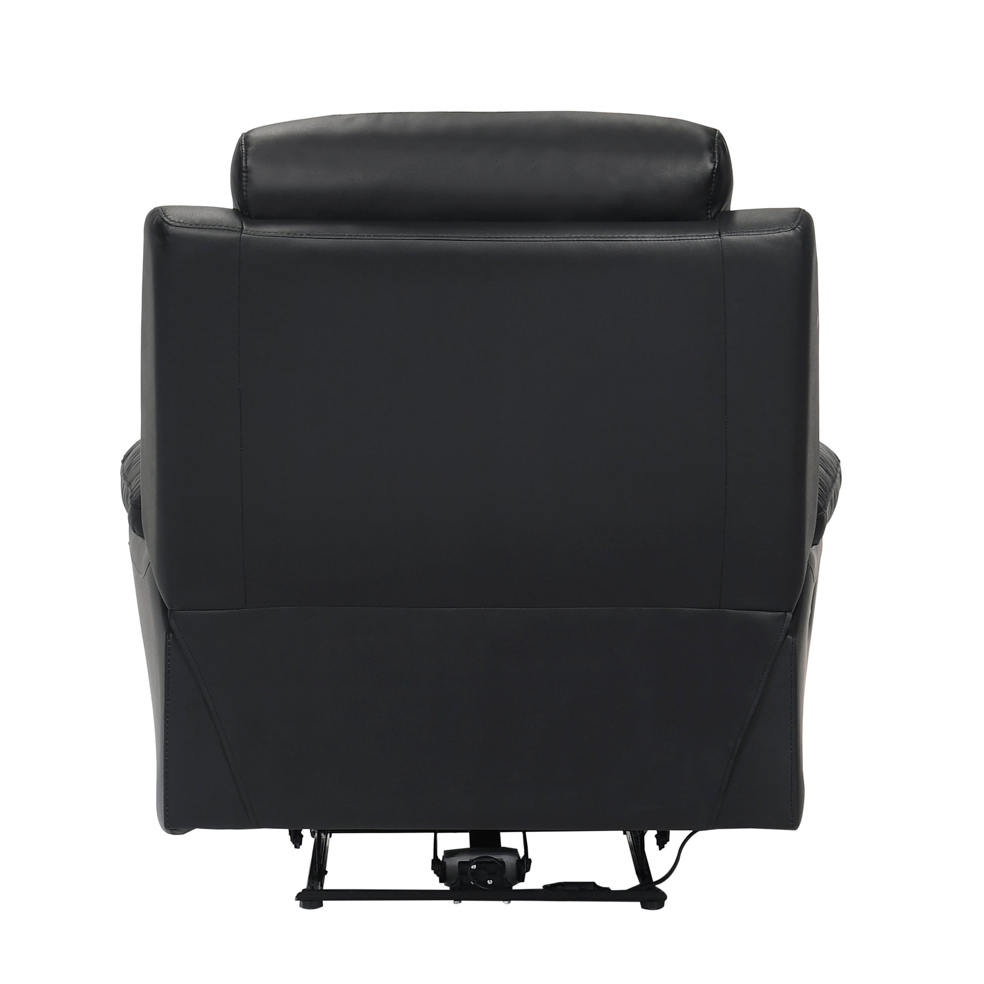 The Hancock Collection’s versatile look, paired with the feel of top grain leather and power reclining, will help to create a welcoming and comfortable space within your home. The reclining chair is engaged with a touch to the side mounted power control. The subtle modern frame of the is covered in 100 percent top grain leather where the body touches, with faux leather covering the remaining areas, its black hue complementing your home’s décor.