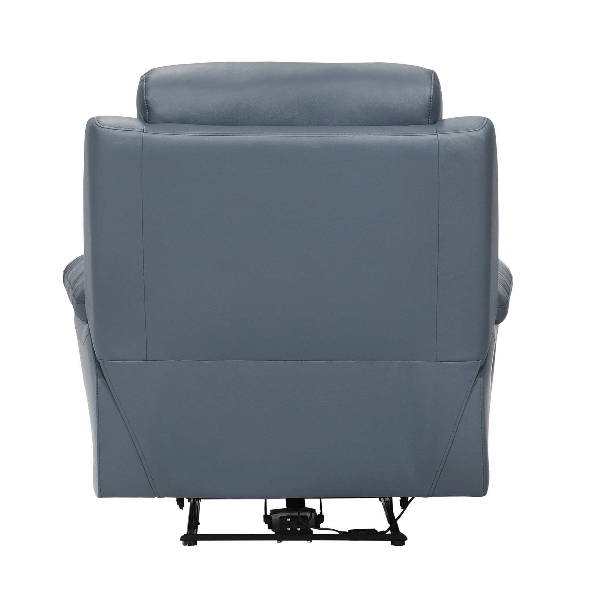 The Hancock Collection’s versatile look, paired with the feel of top grain leather and power reclining, will help to create a welcoming and comfortable space within your home. The reclining chair is engaged with a touch to the side mounted power control. The subtle modern frame of the is covered in 100 percent top grain leather where the body touches, with faux leather covering the remaining areas, its blue hue complementing your home’s décor.