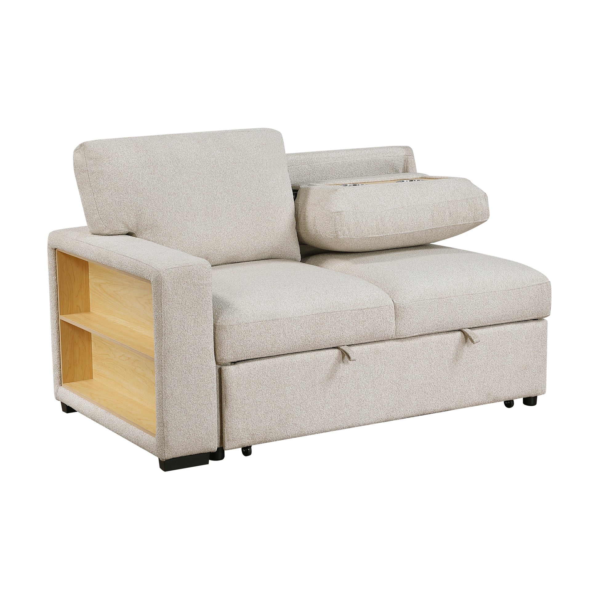 - Arm 2-seater with pull-out bed, drop down cup holders, storage rack and USB charging ports