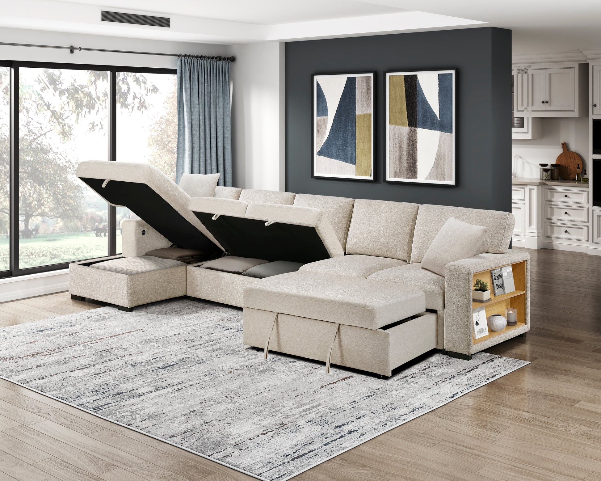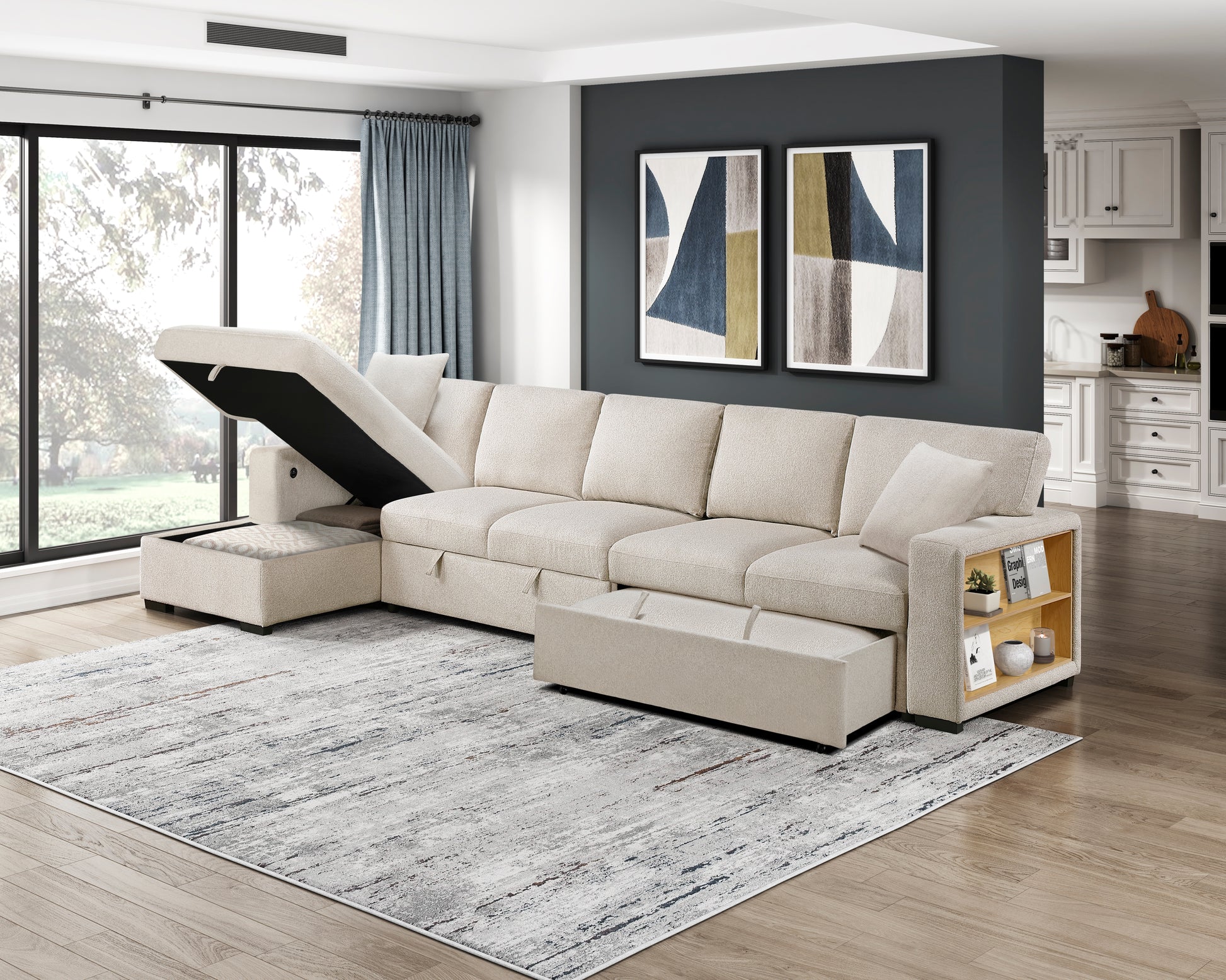 Upgrade your living space with this multi-functional contemporary sectional sofa, designed for ultimate comfort, smart storage, and modern convenience. Featuring a left-facing chaise lounge, a pull-out sleeper bed, and multiple hidden storage compartments, this sectional is perfect for lounging, hosting guests, and optimizing small spaces. The built-in open shelving on the armrest offers easy access to books, décor, or everyday essentials, while integrated USB charging ports keep your devices powered without messy cables. Upholstered in soft, durable fabric, this versatile sectional seamlessly combines style, practicality, and everyday convenience, making it an ideal choice for any living room, guest area, or entertainment space.