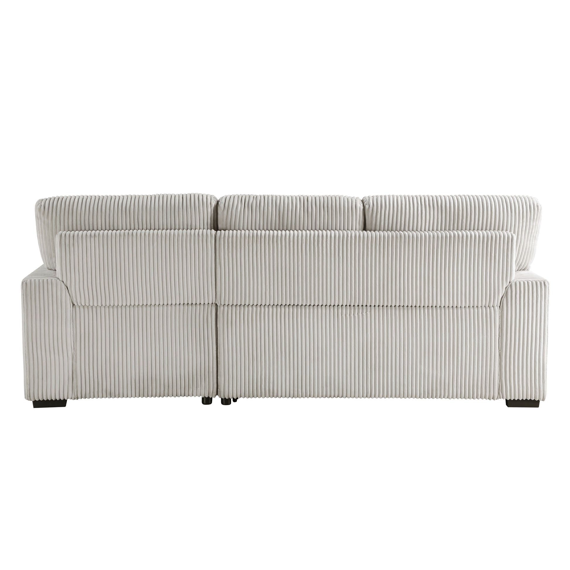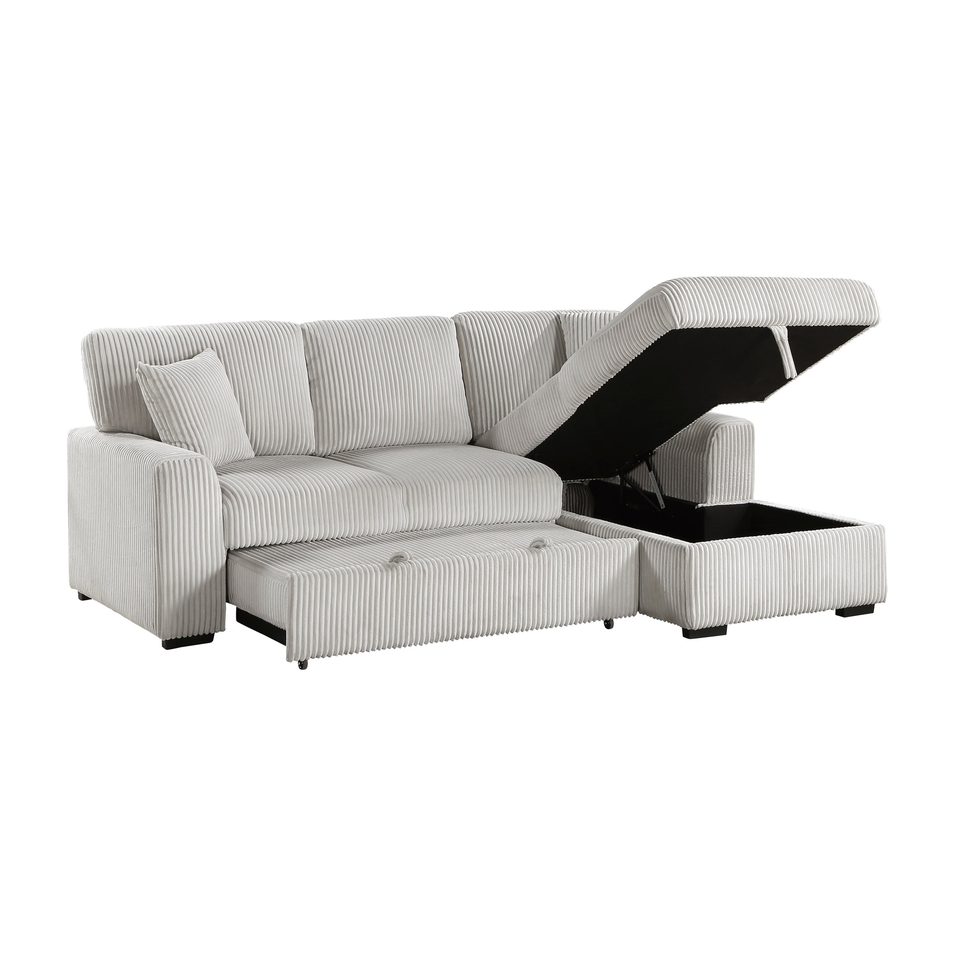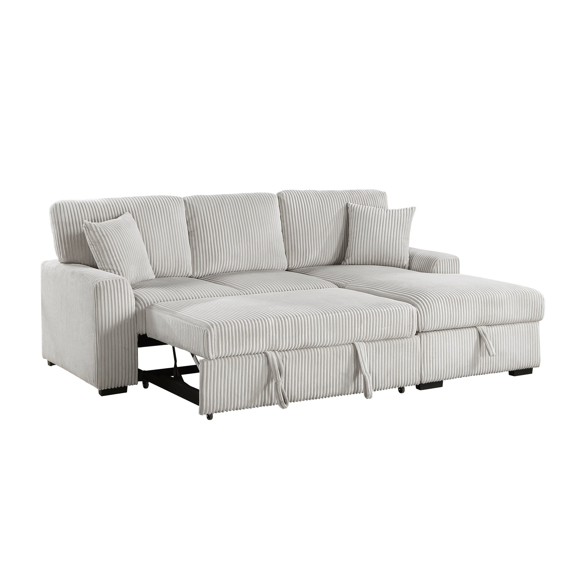 Configured for a perfect fit within your casual living room, the Marsh Collection's three seat sectional is a welcome combination of plush texture and convenient comfort. The pull-out bed that is stored beneath the left-side two-seat unit of the sofa, pops up to match length with the right-side storage chaise creating ample space for full leg extension. The lift-top seat of the chaise opens to reveal hidden storage perfect for blankets. Coordinating toss pillows are included and lend additional comfort to your seated experience. Plush corduroy upholstery covers the collection, its moonbeam-hue a neutral complement to your space.