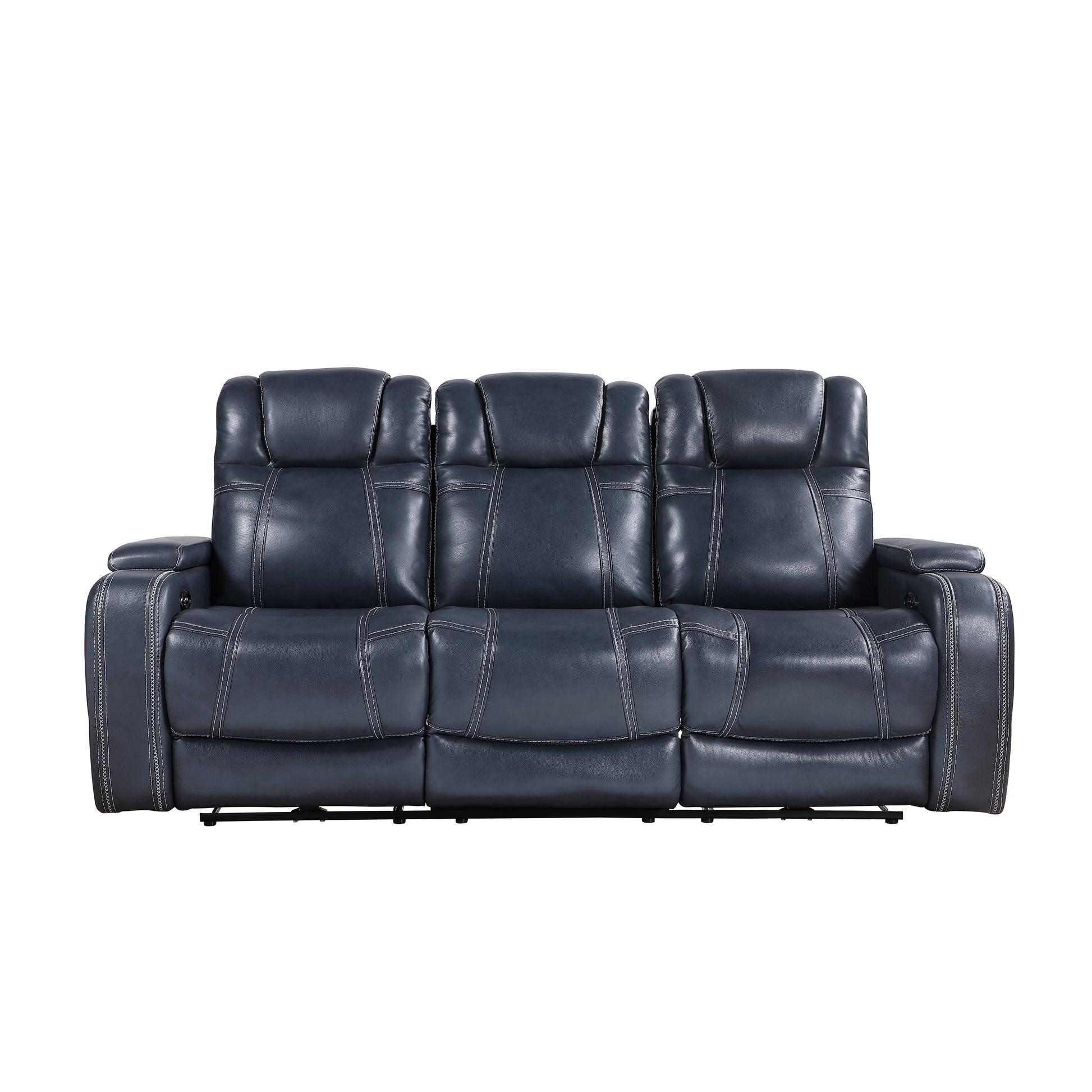 An amalgamation of modern lines, comfort, and functional comfort, the Keziah Collection is a bold choice for your living room. The sofa has a power motion mechanisms that allow for the extension of the footrests and headrests and are conveniently accessed with a touch of the side mounted one-touch control, while hidden armrests provide a convenient spot to place your remote control or electronic devices. Further enhancing your comfort is the 100 percent top grain leather cover - where the body touches, with faux leather-match everywhere else – its blue hue adding bold accent to your living room’s décor.