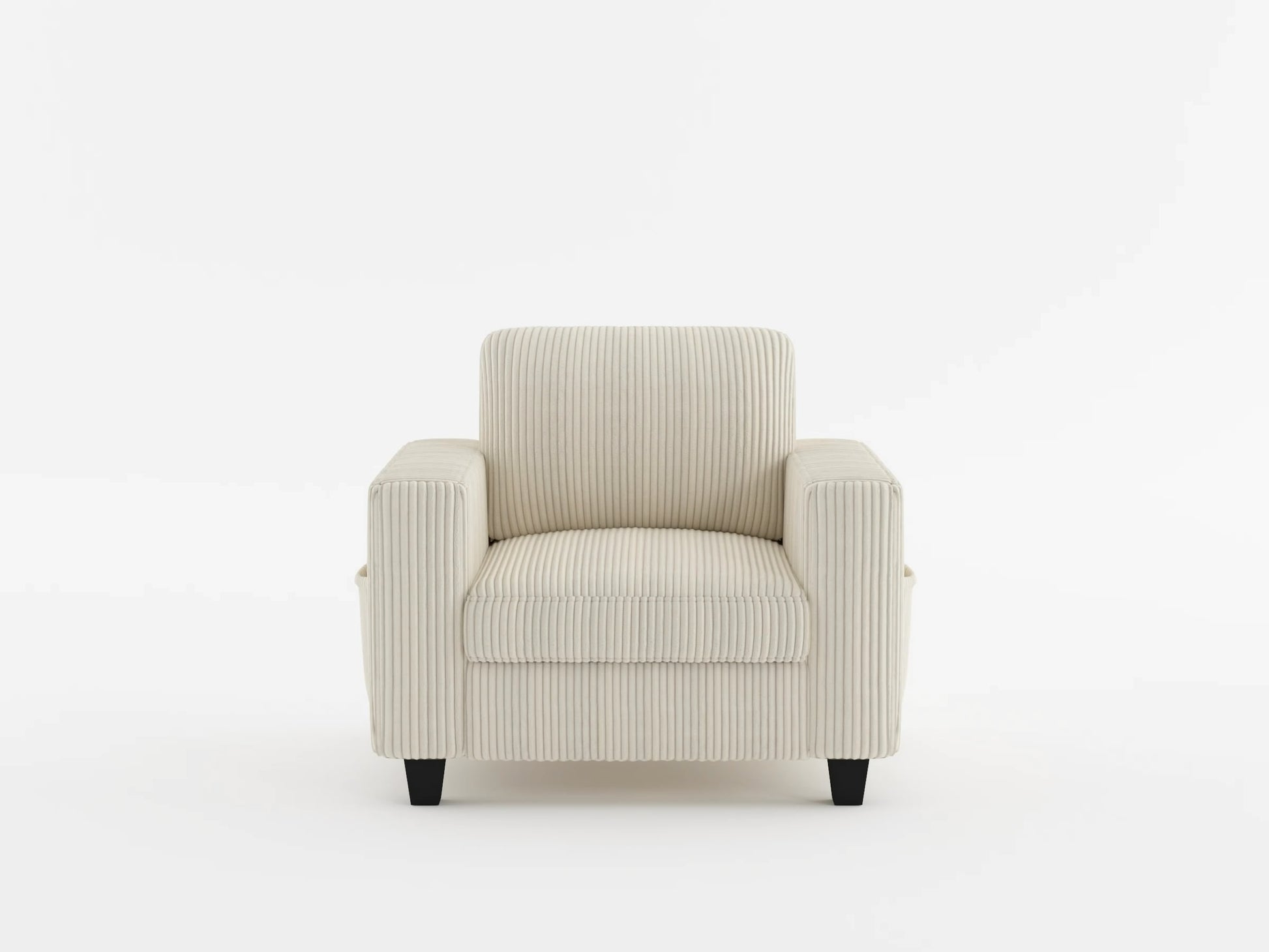 Experience the perfect blend of comfort and convenience with this beige corduroy track arm chair. Featuring a reversible back cushion, you can easily switch up the look and feel of your seating arrangement. The soft, textured corduroy upholstery provides a cozy and inviting feel, while the track arm design adds a touch of modern sophistication. Integrated storage pouches on the sides keep your essentials within reach, and built-in USB charging ports allow you to power your devices without leaving your seat. Perfect for reading nooks, home offices, or living rooms, this chair offers both style and functionality.
