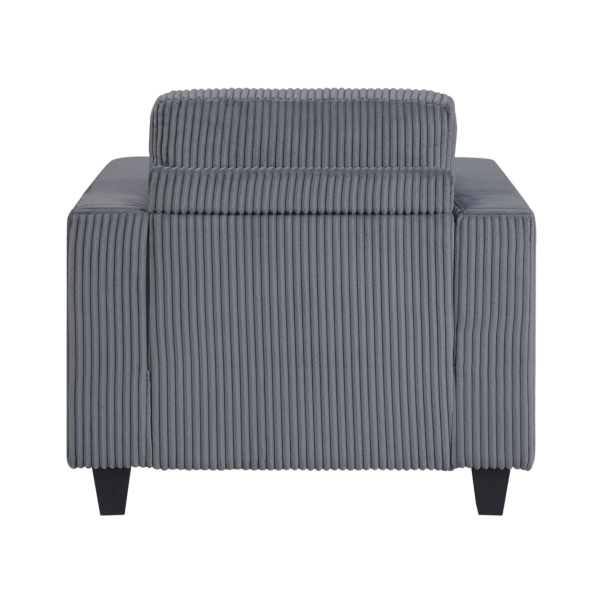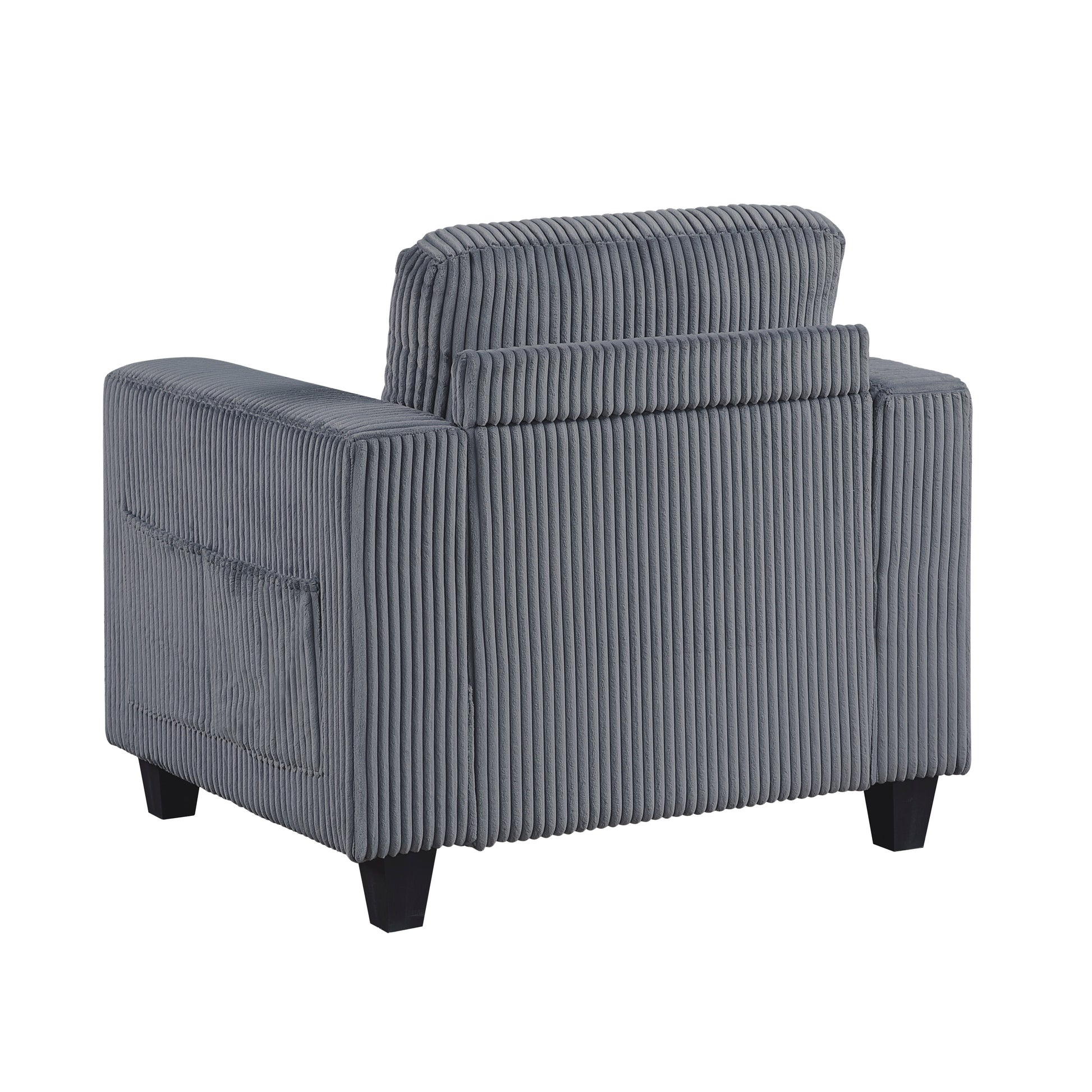 Experience the perfect blend of comfort and convenience with this gray corduroy track arm chair. Featuring a reversible back cushion, you can easily switch up the look and feel of your seating arrangement. The soft, textured corduroy upholstery provides a cozy and inviting feel, while the track arm design adds a touch of modern sophistication. Integrated storage pouches on the sides keep your essentials within reach, and built-in USB charging ports allow you to power your devices without leaving your seat. Perfect for reading nooks, home offices, or living rooms, this chair offers both style and functionality.