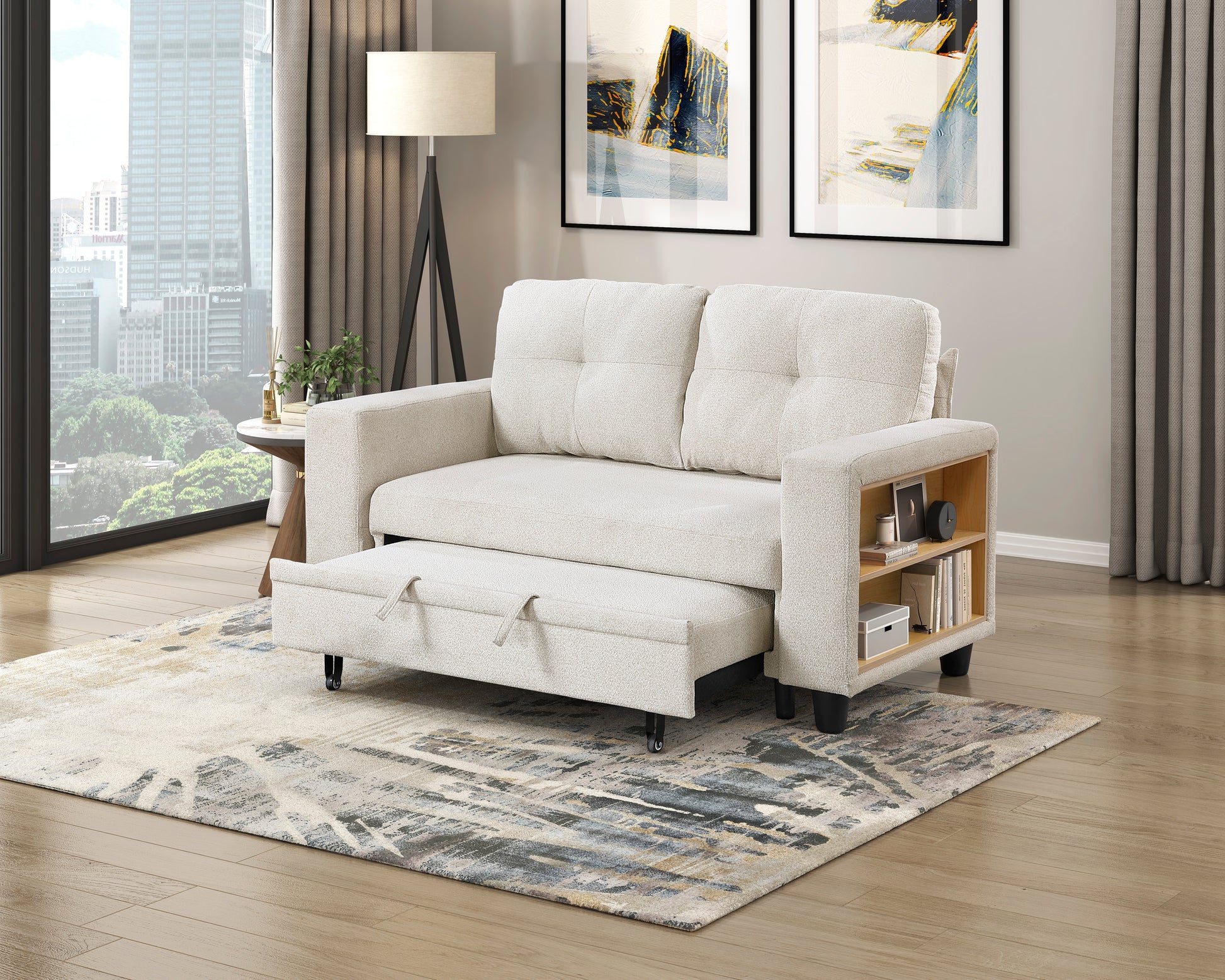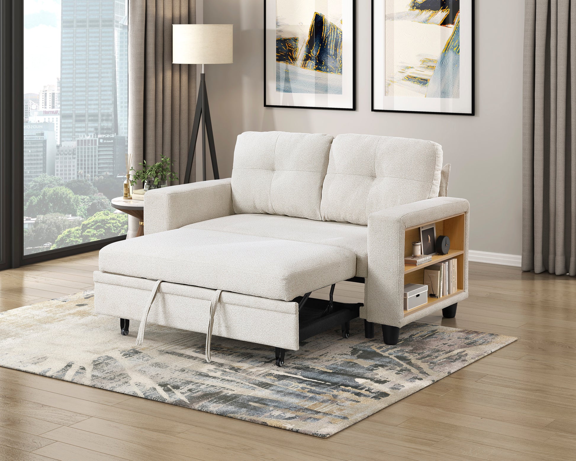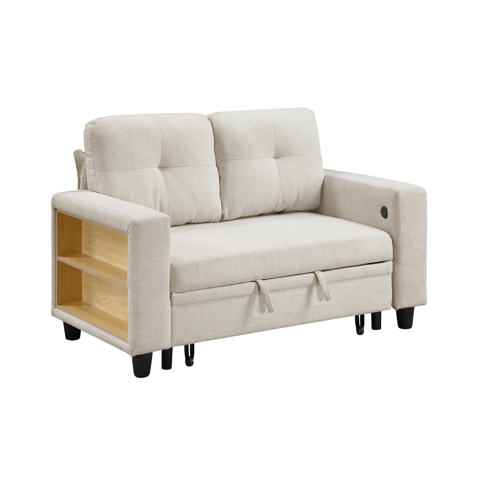 Maximize your living space with this versatile and stylish convertible loveseat. Perfect for apartments, guest rooms, or home offices, this loveseat seamlessly transitions from a comfortable seating area to a convenient pull-out bed, accommodating overnight guests with ease. The integrated side shelves provide storage and display space, while the built-in USB charging ports keep your devices powered up. The neutral beige fabric upholstery complements any décor, and the plush cushions ensure both comfort and functionality. This loveseat is the perfect blend of modern design and practical features, making it an essential addition to any home.
