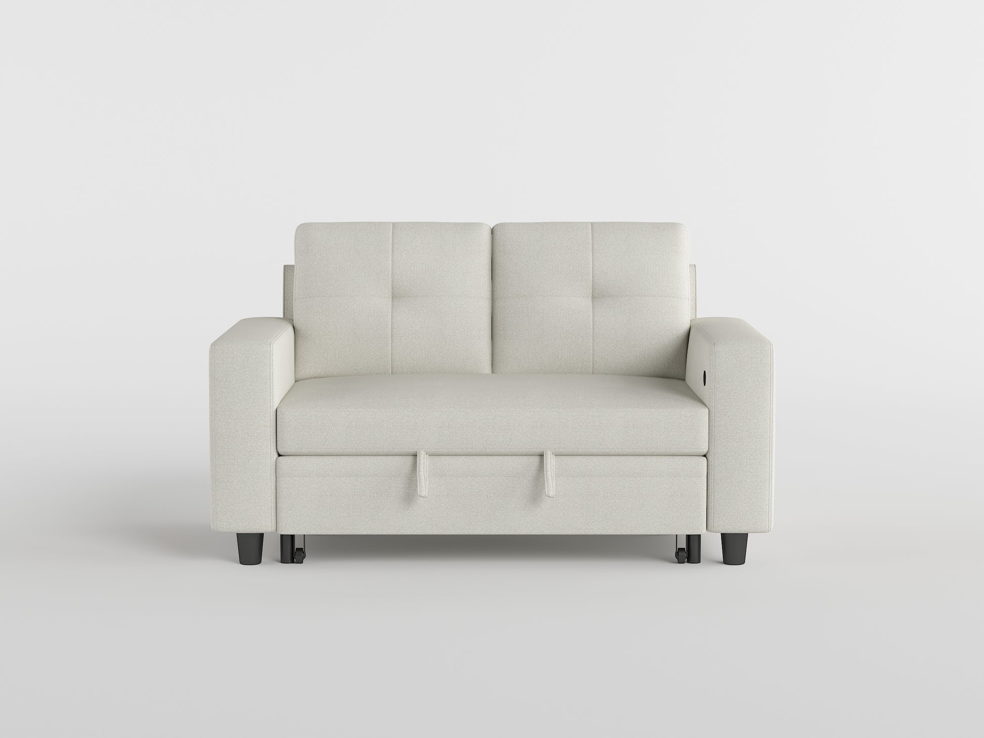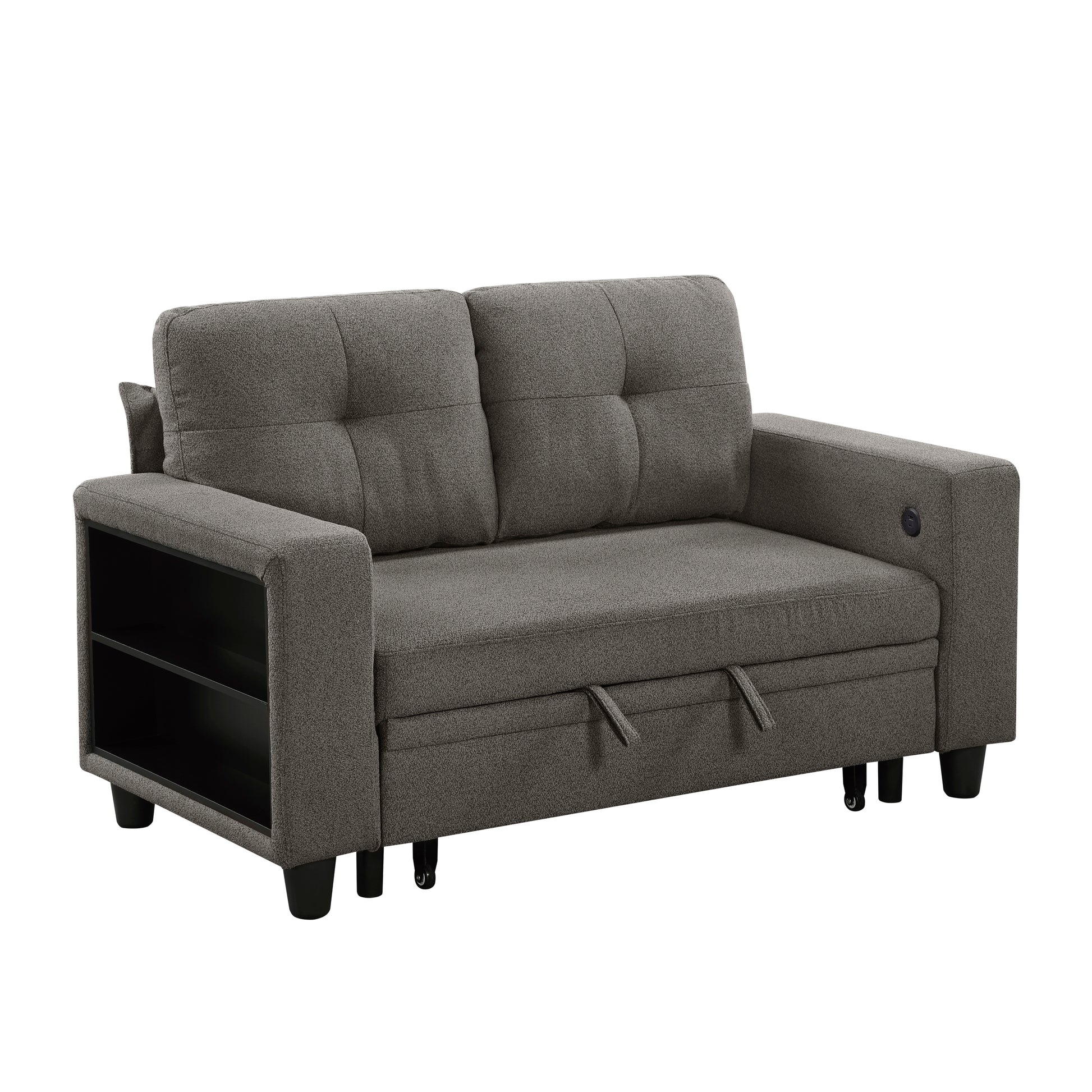 Maximize your living space with this versatile and stylish convertible loveseat. Perfect for apartments, guest rooms, or home offices, this loveseat seamlessly transitions from a comfortable seating area to a convenient pull-out bed, accommodating overnight guests with ease. The integrated side shelves provide storage and display space, while the built-in USB charging ports keep your devices powered up. The dark brown fabric upholstery complements any décor, and the plush cushions ensure both comfort and functionality. This loveseat is the perfect blend of modern design and practical features, making it an essential addition to any home.