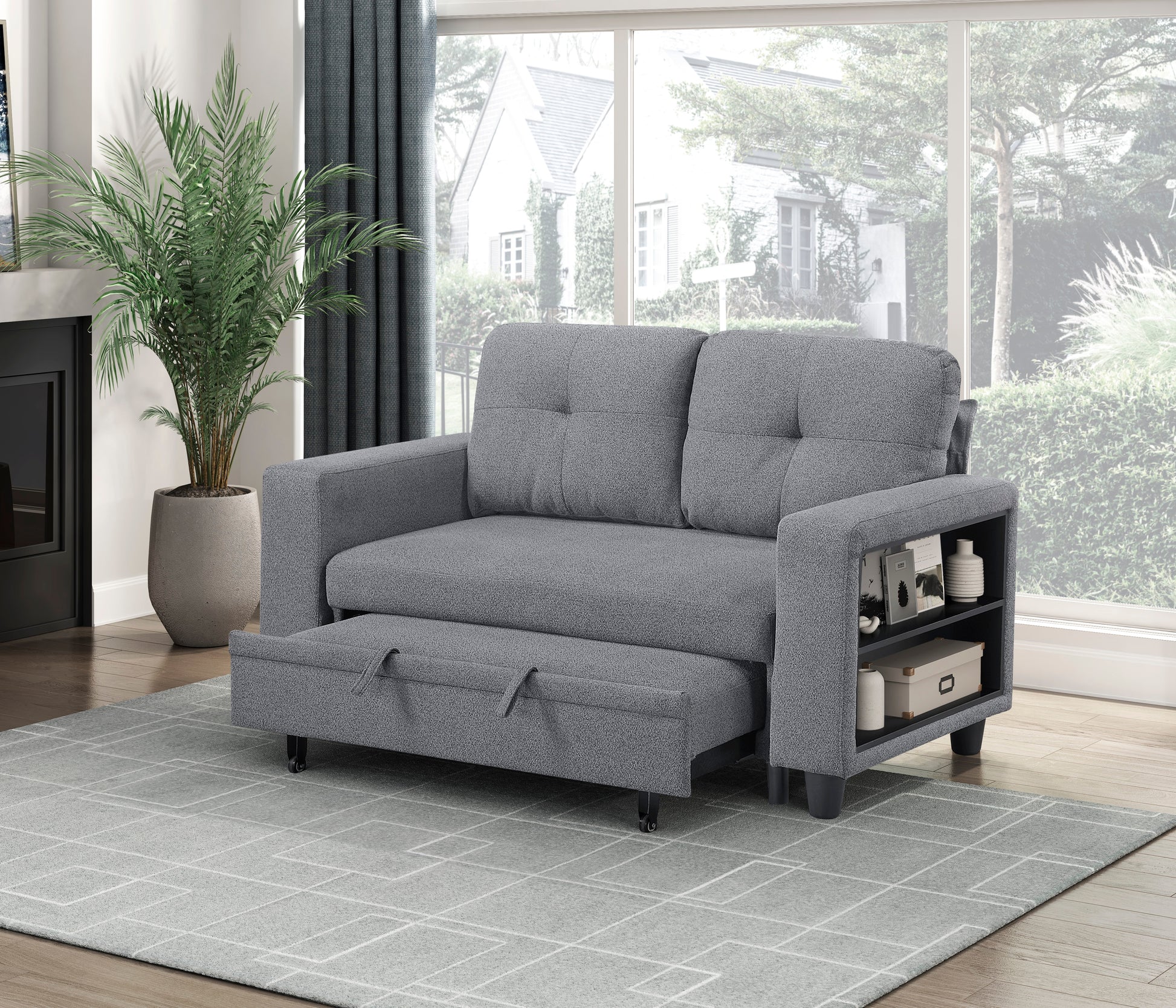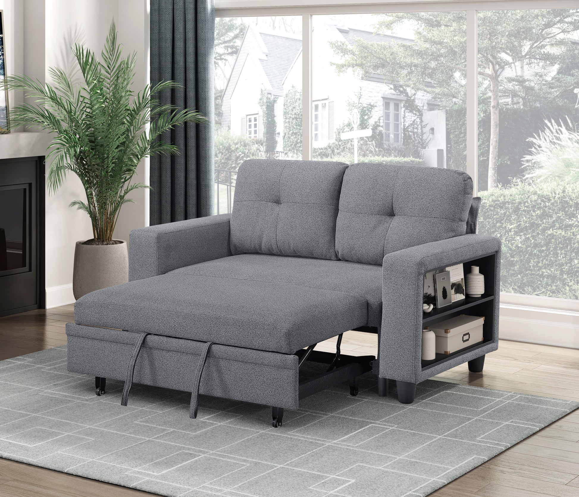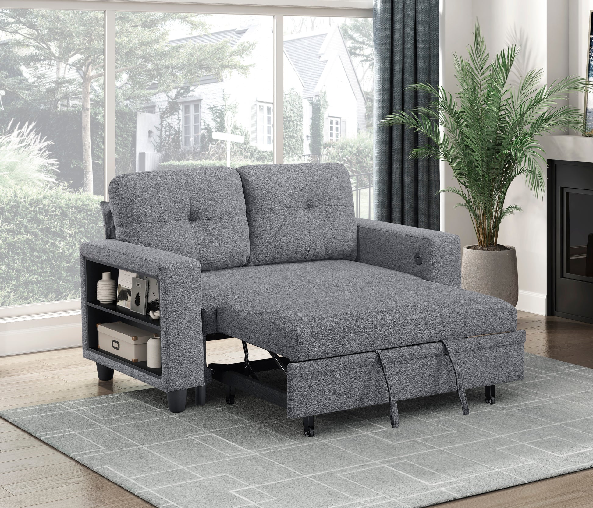 Maximize your living space with this versatile and stylish convertible loveseat. Perfect for apartments, guest rooms, or home offices, this loveseat seamlessly transitions from a comfortable seating area to a convenient pull-out bed, accommodating overnight guests with ease. The integrated side shelves provide storage and display space, while the built-in USB charging ports keep your devices powered up. The neutral gray fabric upholstery complements any décor, and the plush cushions ensure both comfort and functionality. This loveseat is the perfect blend of modern design and practical features, making it an essential addition to any home.
