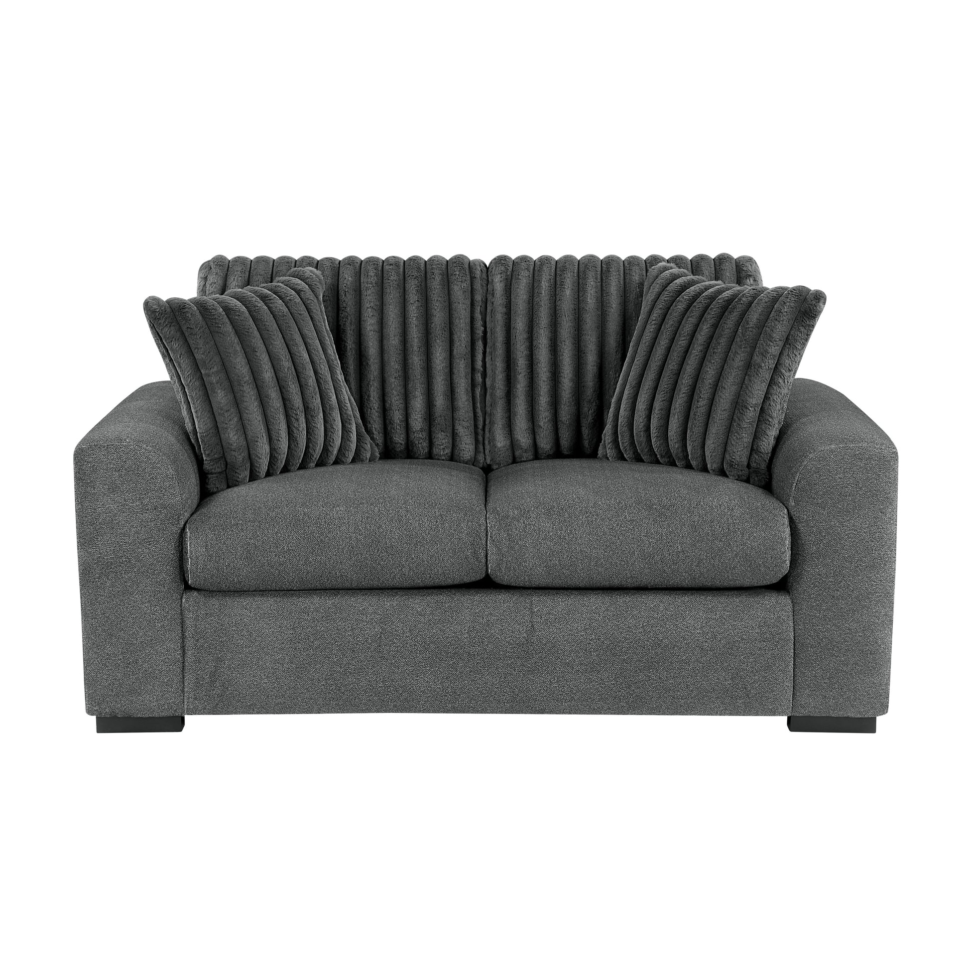 Create a cozy and stylish seating area with this two-tone dark gray loveseat, featuring a unique blend of textured microfiber and inviting corduroy fabrics. Built with a sturdy plywood frame, high-density foam padding over pocket coils, and reversible cushions, this loveseat offers both durability and exceptional comfort for two. The removable cushion covers with zippers make cleaning a breeze, while the solid wood feet in a sleek black finish provide a modern foundation. Two matching pillows are included to enhance both comfort and style. With a 300lb weight capacity per seat (600lb total) and easy assembly, this loveseat is perfect for apartments, small living rooms, or any space needing a touch of contemporary charm.