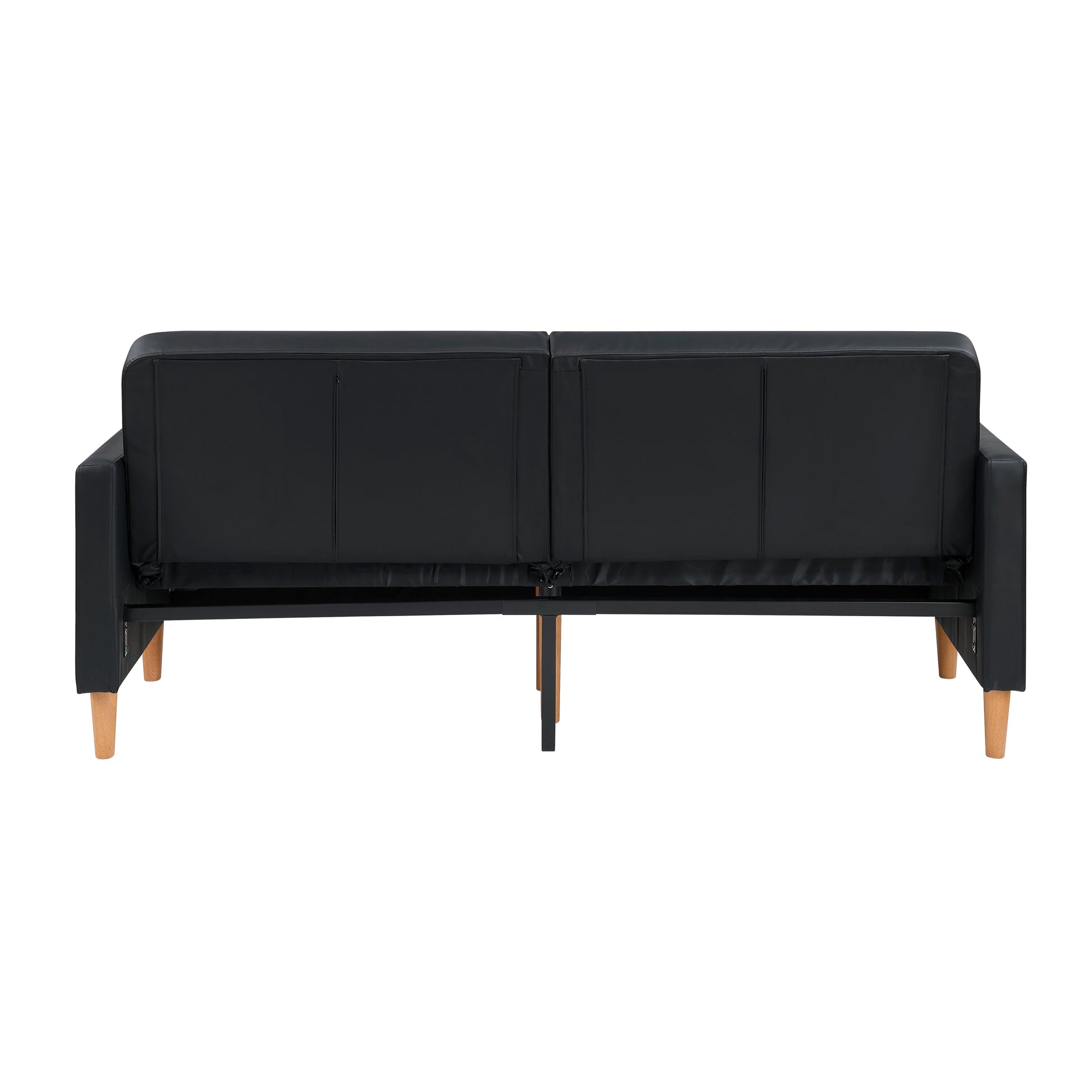 Maximize your living space with this stylish and functional convertible faux leather futon sofa. Featuring a durable plywood frame and foam padding over pocket coils, this futon offers both comfort and support for lounging or sleeping. The attached back and seat cushions provide a sleek, streamlined look, while the solid wood legs in a light walnut finish add a touch of modern warmth. Easily transform this futon from a comfortable sofa to a convenient sleeper with its simple drop-down back mechanism, perfect for accommodating overnight guests. With a robust 300lbs weight capacity per seat, this futon is designed for both style and durability. Assembly is required, but the versatility and comfort it brings to your home are well worth the effort.
