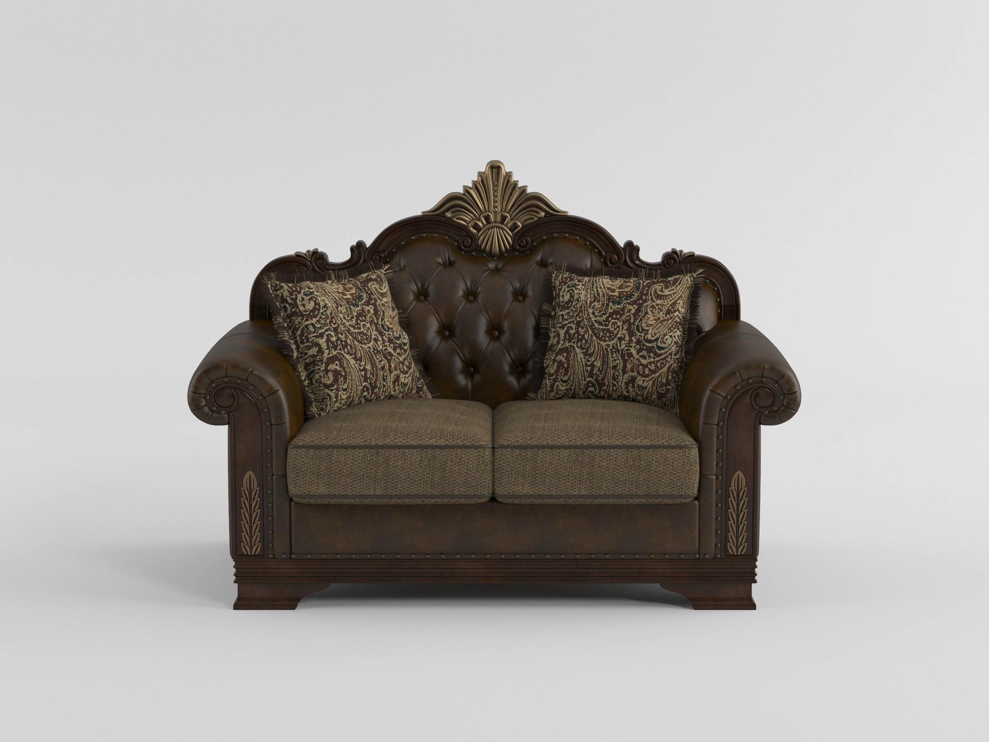 Elegantly designed for the traditional home, the Croydon Collection masterfully blends classic touches to create a seating offering that will be the perfect fit for your living room. Carvings are finished in a dark cherry and feature gold tipping for an added touch of elegance. The show wood frame defines the profile of the love seat while contrast toss pillows complete the look.