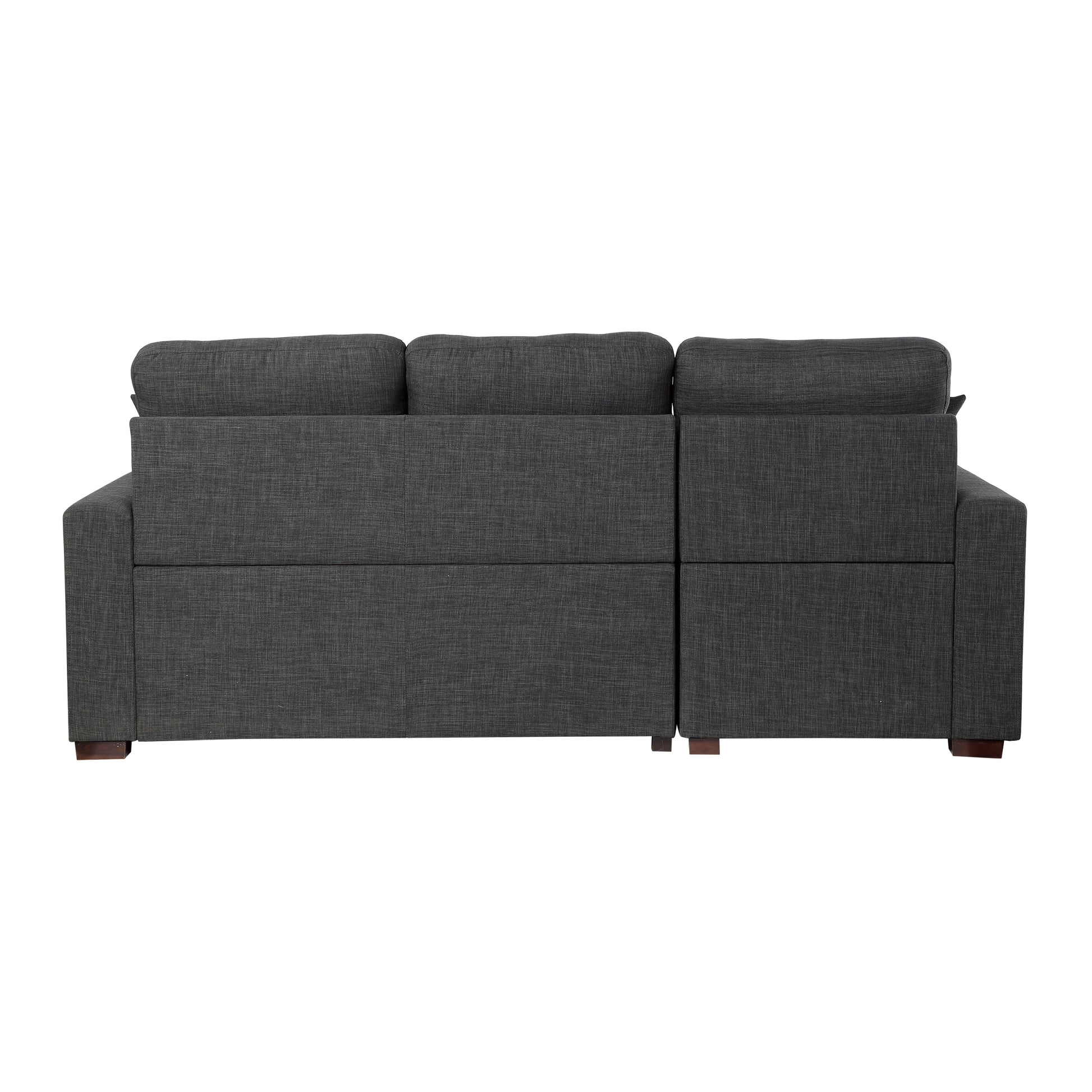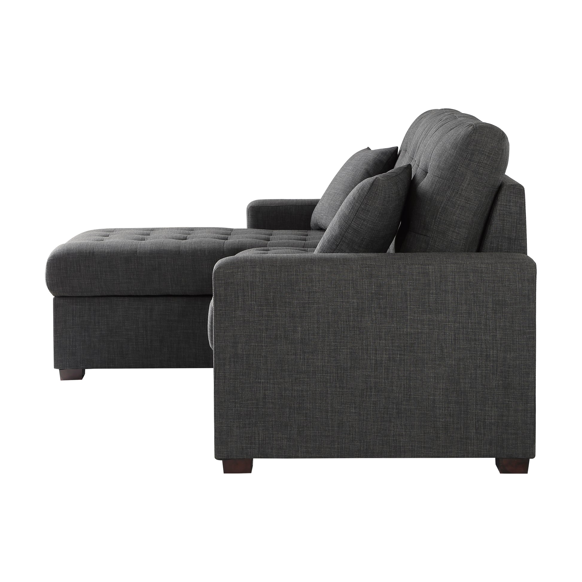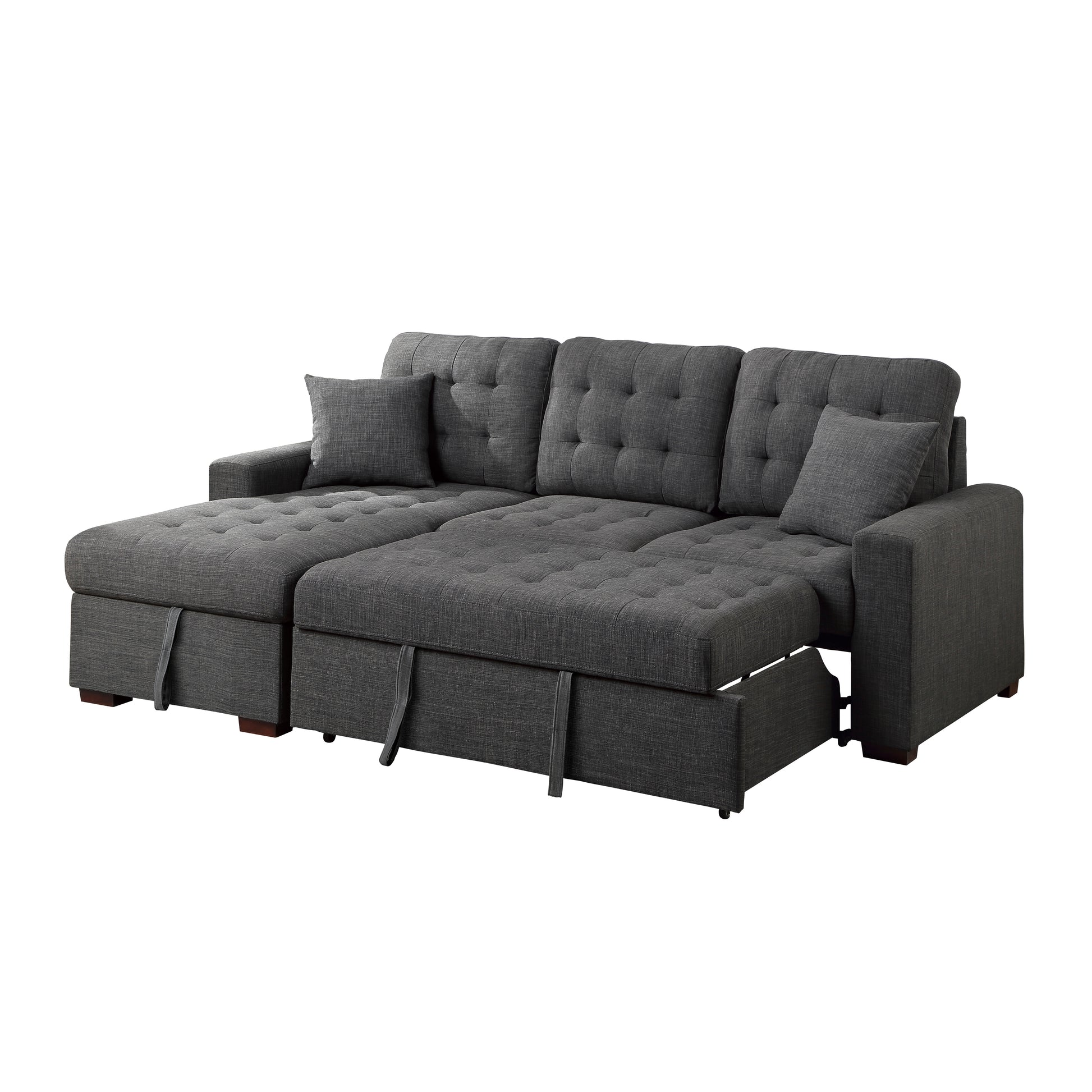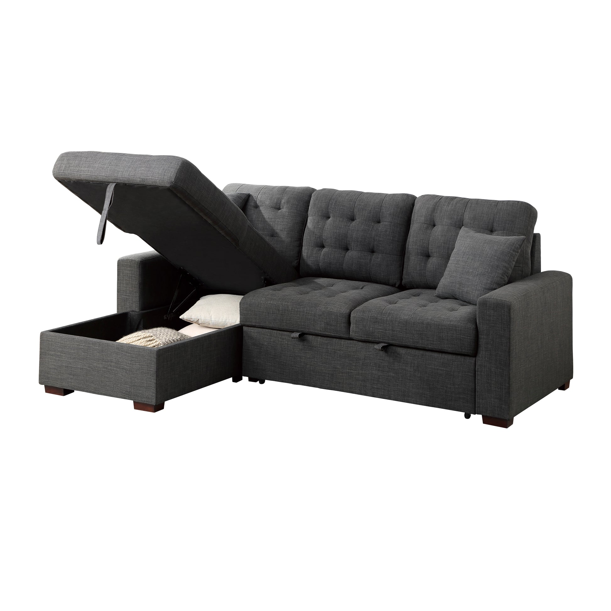 The versatility and functionality of the McCafferty Collection goes beyond that of a traditional sofa. Covered in dark gray fabric, the transitional profile of this seating group is complemented by stitch tufting and track-style arms. Conveniently stored beneath the right-side two-seat unit is a pull-out trundle that rises to create a bed while the top of the attached left-side chaise opens to reveal under-seat storage.