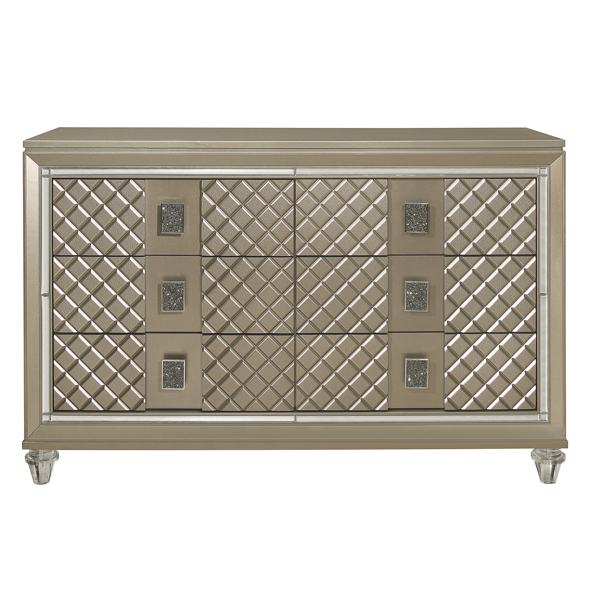 The glamour girl in your life will love the addition of the Loudon Collection to her bedroom. The champagne finish of the collection shimmers with LED backlighting the headboard and mirror while additional sparkle comes in the form of the black encrusted drawer pulls, embossed diamond pattern accent, mirrored framing and acrylic feet. The optional trundle allows for configuration as a toy box or twin-size bed.