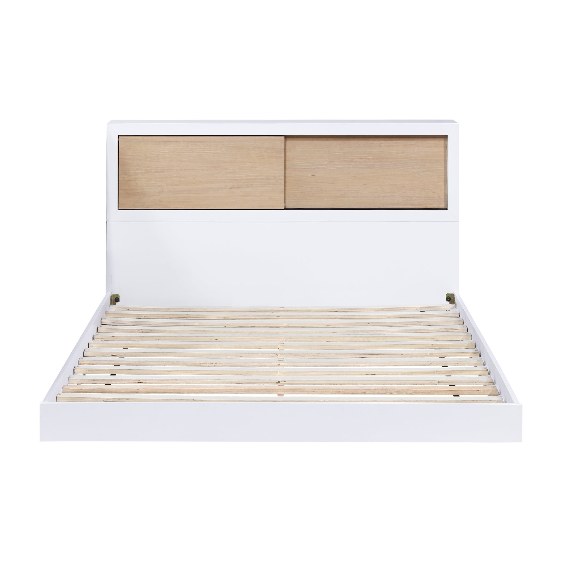 Providing the perfect landing pad for your child’s bedroom, the Asker Collection is a fun and functional addition to their space. The two-tone white and natural finish of the pine veneer is paired with the mid-century modern design to create a classic profile. The full-size bed’s floor level ultra-low profile platform features a sliding door bookcase headboard which provides an enclosed storage space.