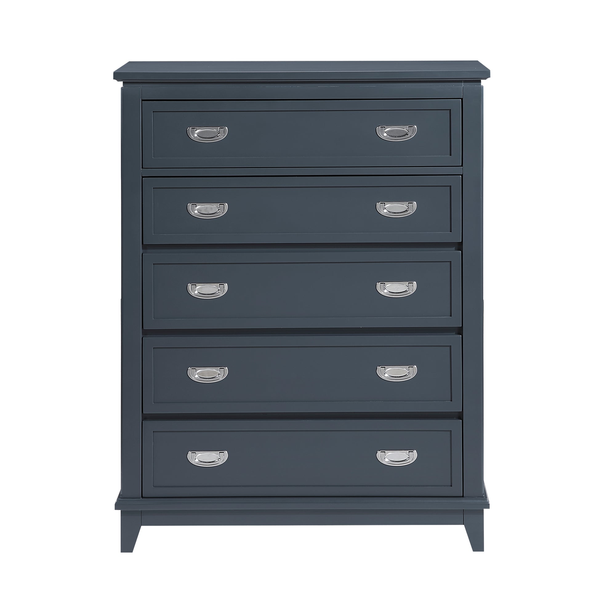 Add stylish and efficient storage to your bedroom with this navy blue 5-drawer chest. Crafted from wood and engineered wood with a sleek navy blue finish, this chest features five dovetail drawers with smooth ball-bearing glides for easy access to your clothing and belongings. Polished nickel-tone flush ring pulls add a touch of sophistication, and with no assembly required, this chest is ready to enhance your bedroom décor right out of the box.