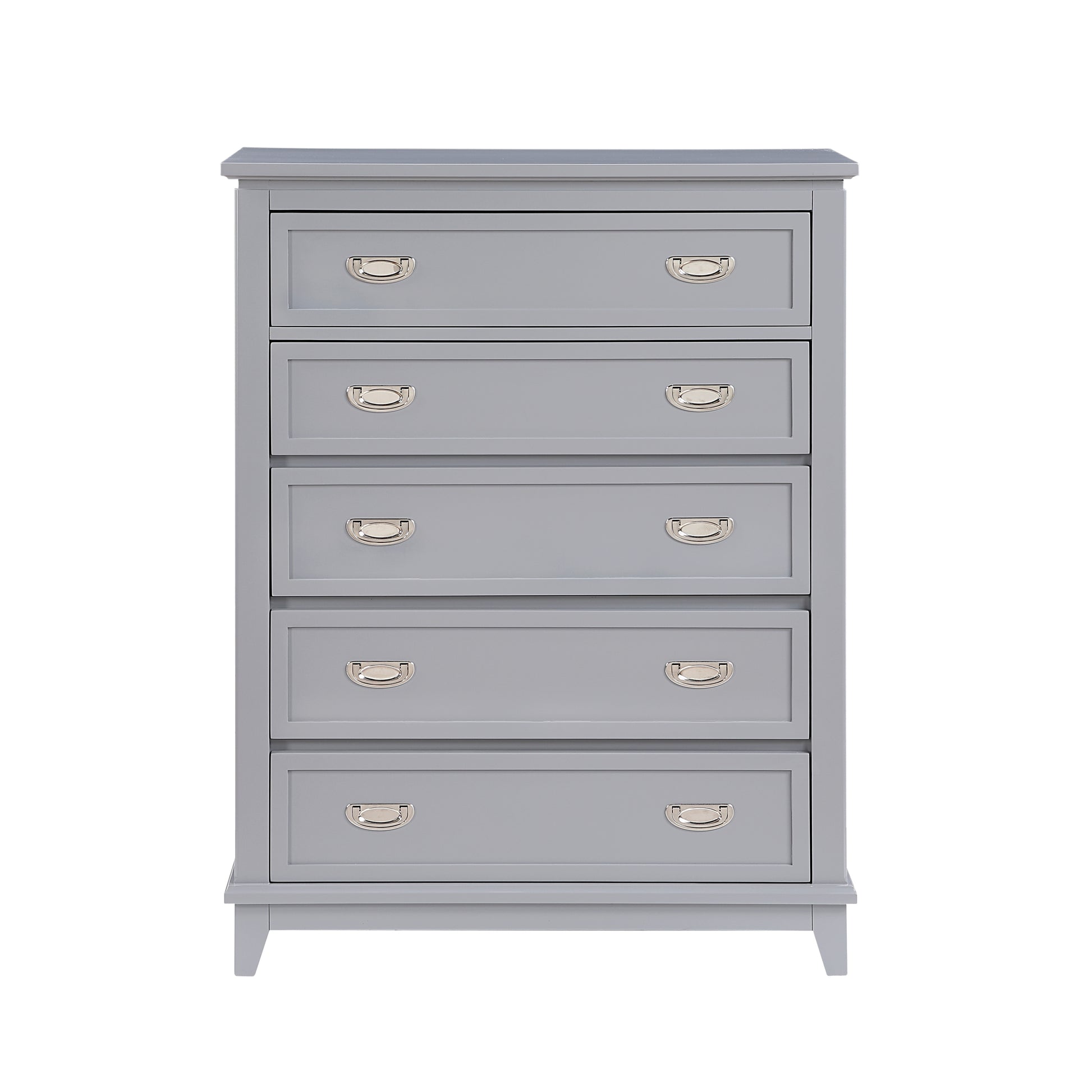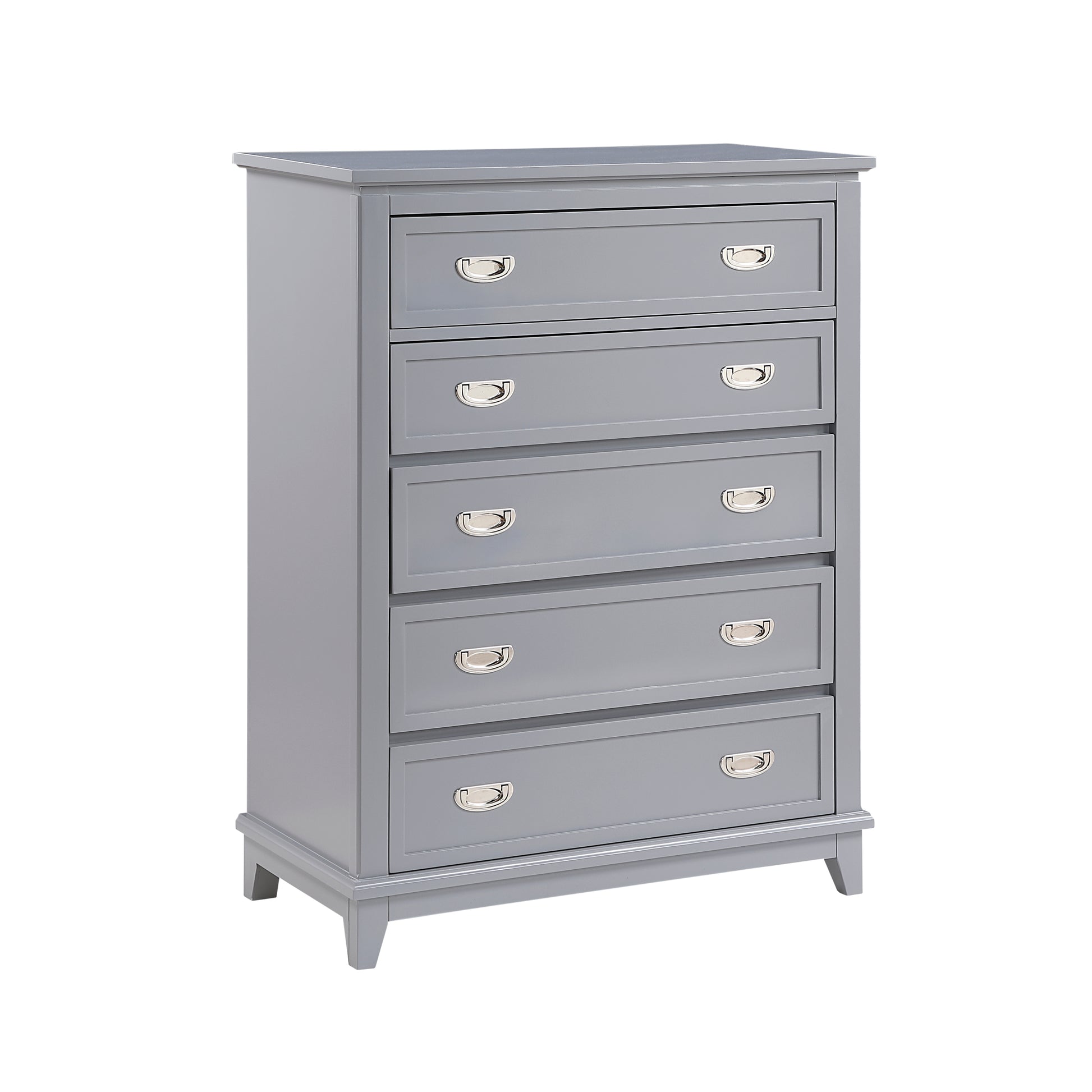 Add stylish and efficient storage to your bedroom with this gray 5-drawer chest. Crafted from wood and engineered wood with a sleek gray finish, this chest features five dovetail drawers with smooth ball-bearing glides for easy access to your clothing and belongings. Polished nickel-tone flush ring pulls add a touch of sophistication, and with no assembly required, this chest is ready to enhance your bedroom décor right out of the box.