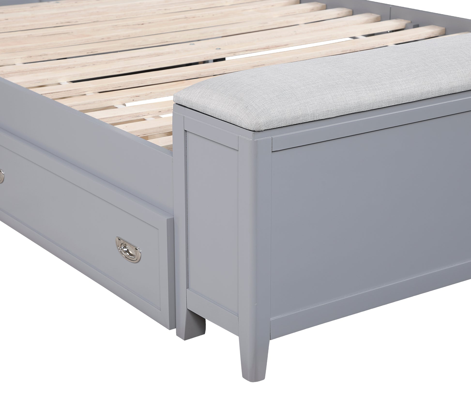 Maximize your child's bedroom space with this multifunctional gray bookcase bed, designed for both style and practicality. Crafted from wood and engineered wood with a sleek gray finish, this bed features a bookcase headboard with a hidden desk and foam-cushioned stool, perfect for study or creative activities. The footboard includes a convenient storage bench, while the headboard offers three dovetail drawers with smooth ball-bearing glides for organized storage. Polished nickel-tone flush ring pulls add a touch of sophistication, and the design eliminates the need for a foundation or box spring, making it a space-saving and efficient choice for any bedroom.