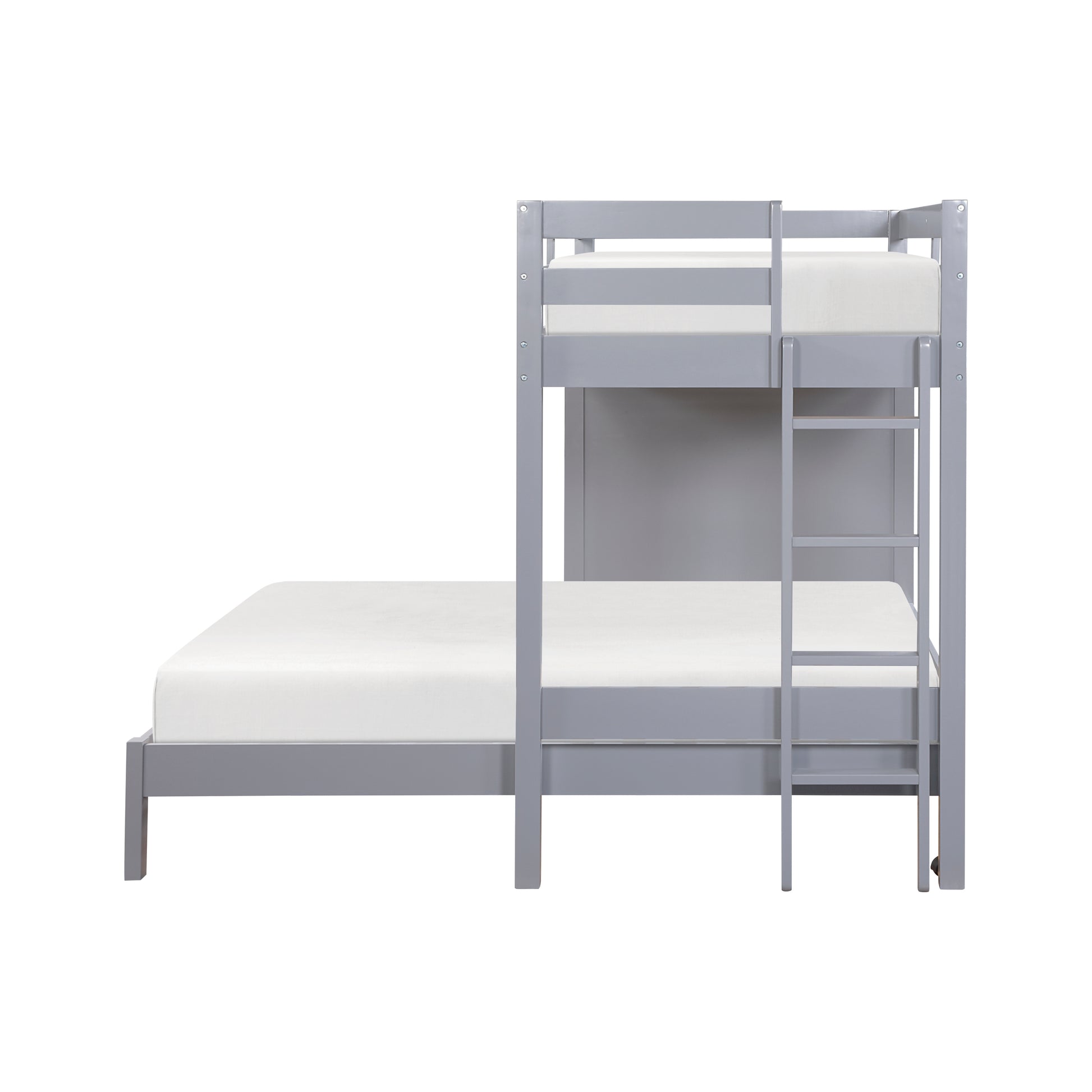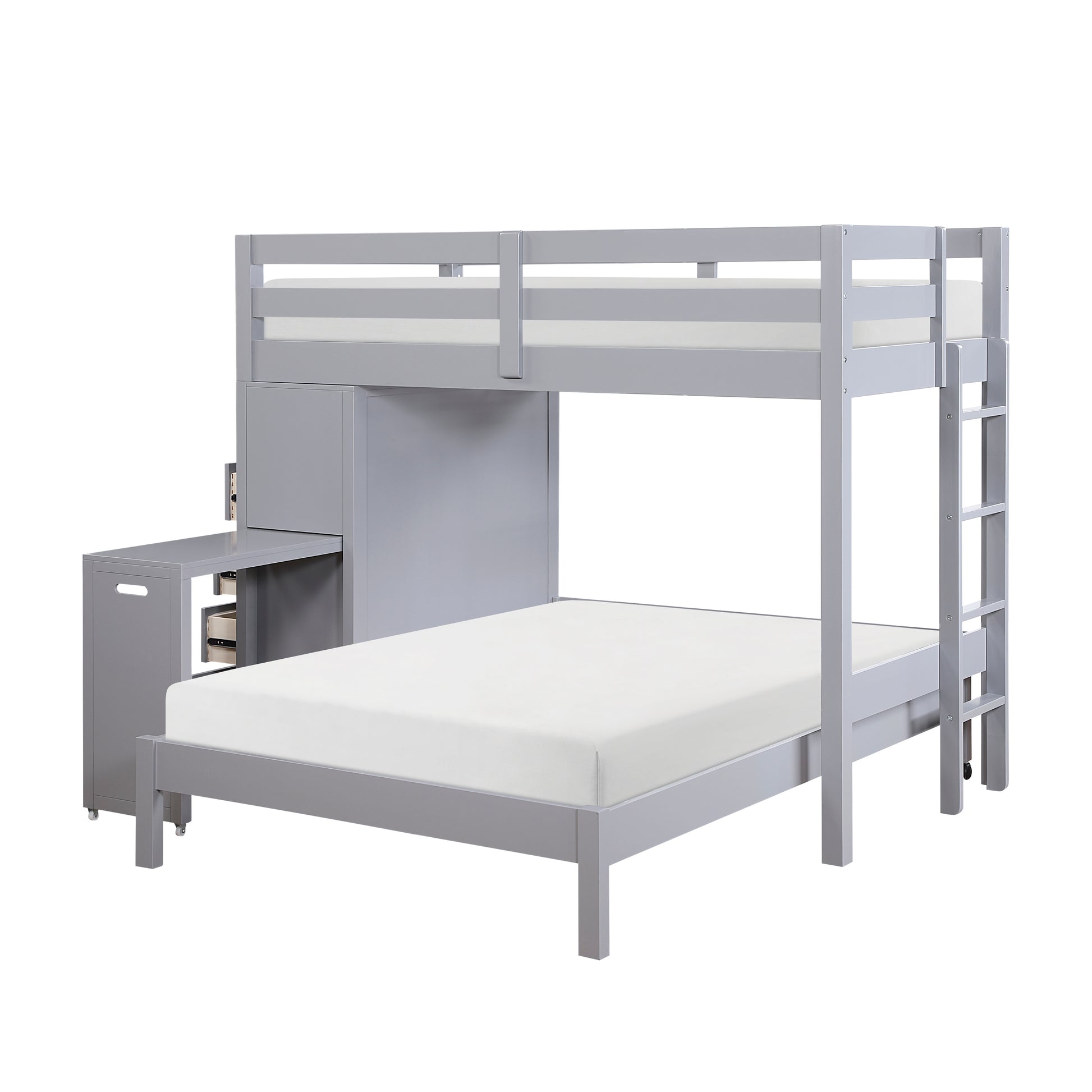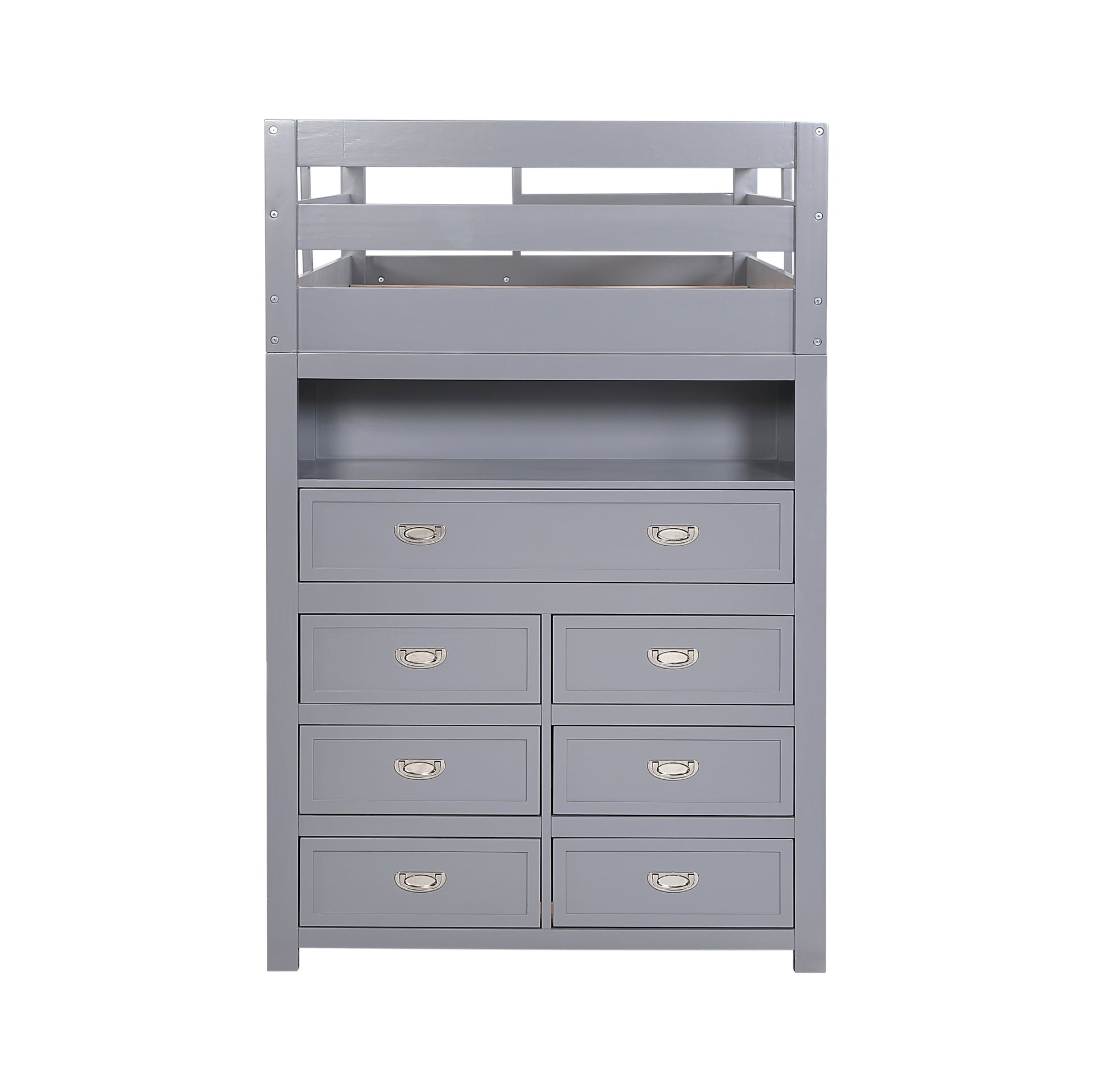 Maximize your child's bedroom space with this multifunctional gray loft bunk bed, designed for both style and practicality. Crafted from wood and engineered wood with a sleek gray finish, this bunk bed features a top twin bunk with guard rails for safety and a full-size lower bed. The built-in storage unit includes seven dovetail drawers with smooth ball-bearing glides for organized storage, and a hidden desk on casters that easily rolls out for study or creative activities. Polished nickel-tone flush ring pulls add a touch of sophistication, and the design eliminates the need for a foundation or box spring, making it a space-saving and efficient choice for any bedroom.