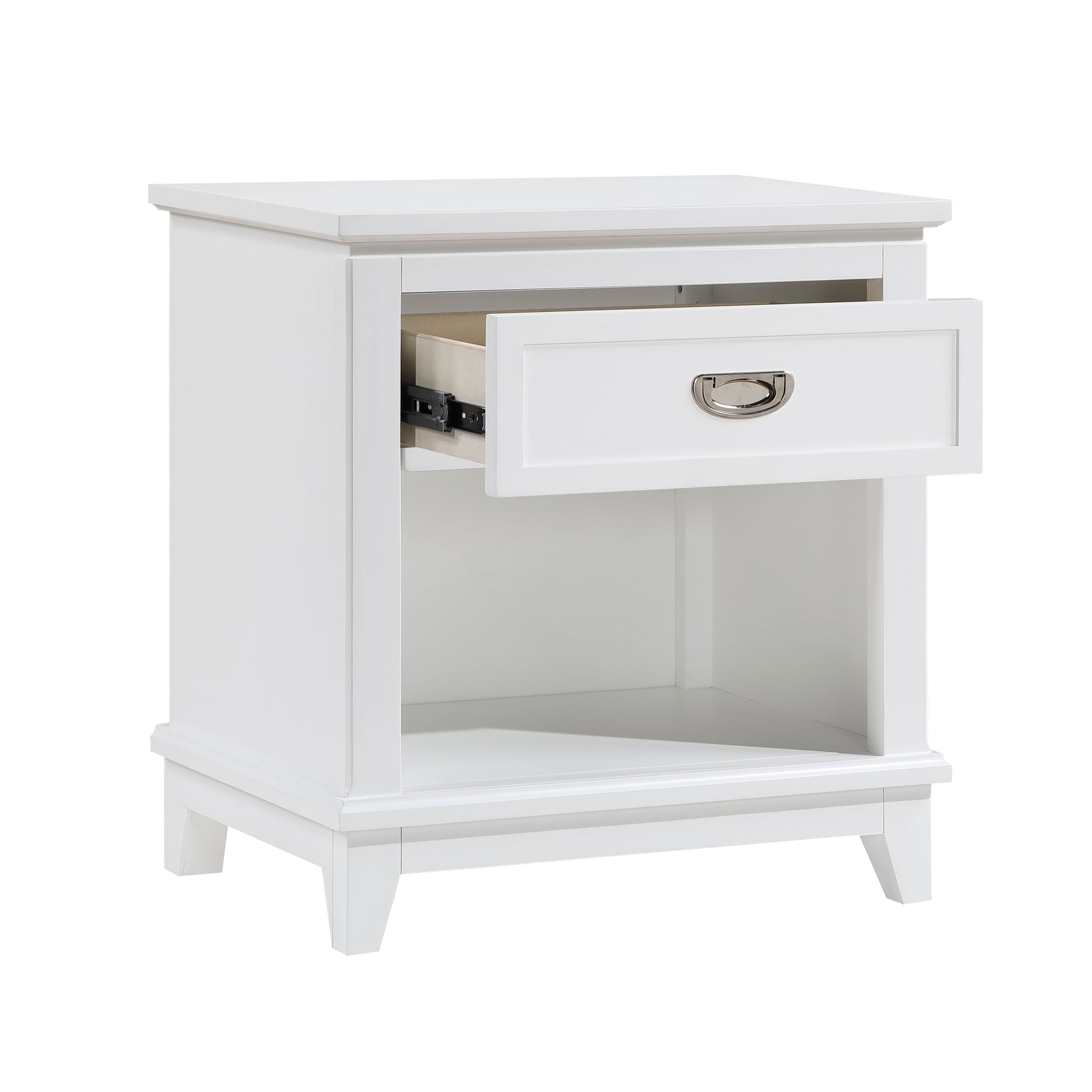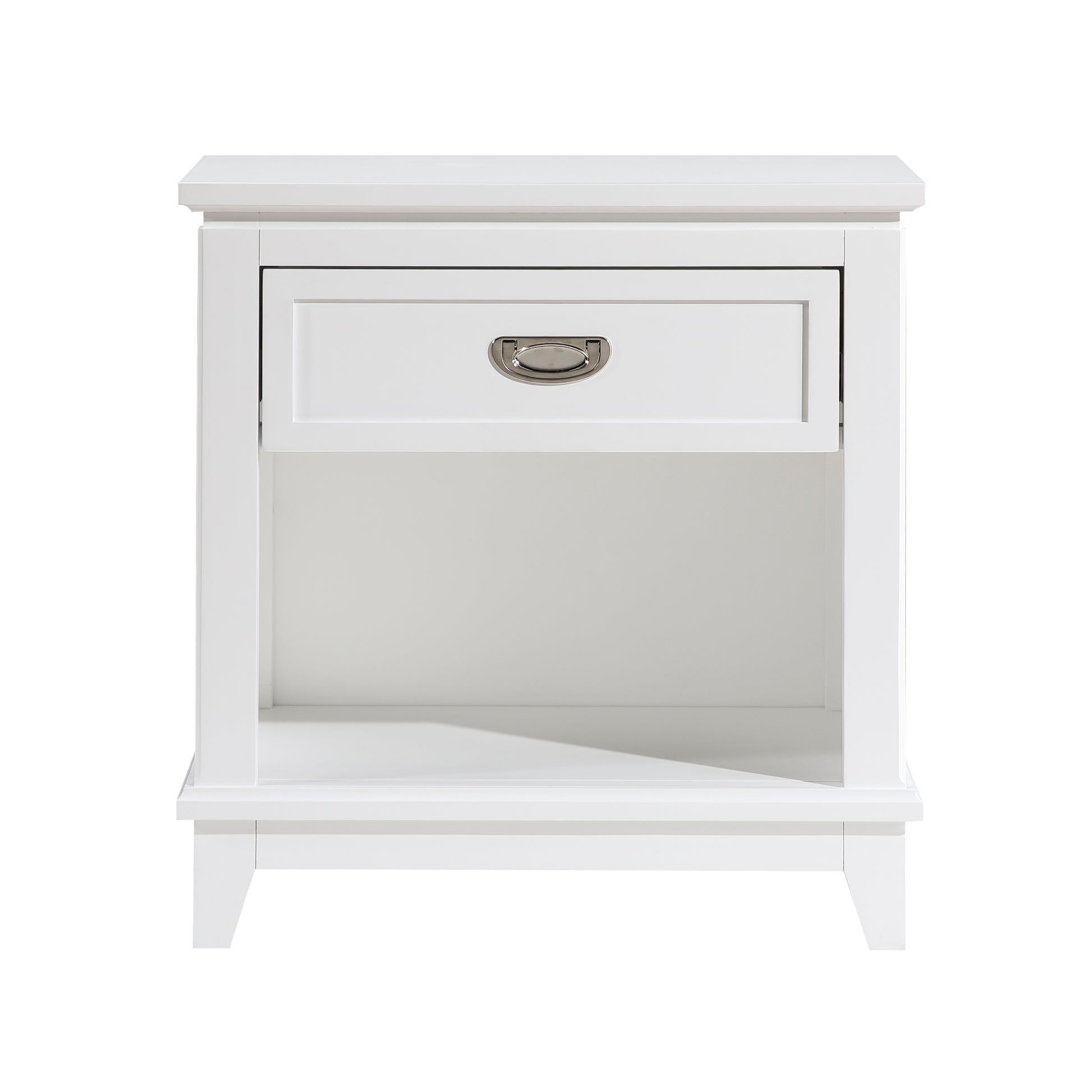 Add a touch of classic style and practical storage to your bedside with this white nightstand. Crafted from wood and engineered wood with a sleek white finish, this nightstand features a dovetail drawer with smooth ball-bearing glides for easy access to your essentials, and a lower storage cubby for books or other items. Polished nickel-tone flush ring pulls add a touch of sophistication, and with no assembly required, this nightstand is ready to enhance your bedroom décor right out of the box.