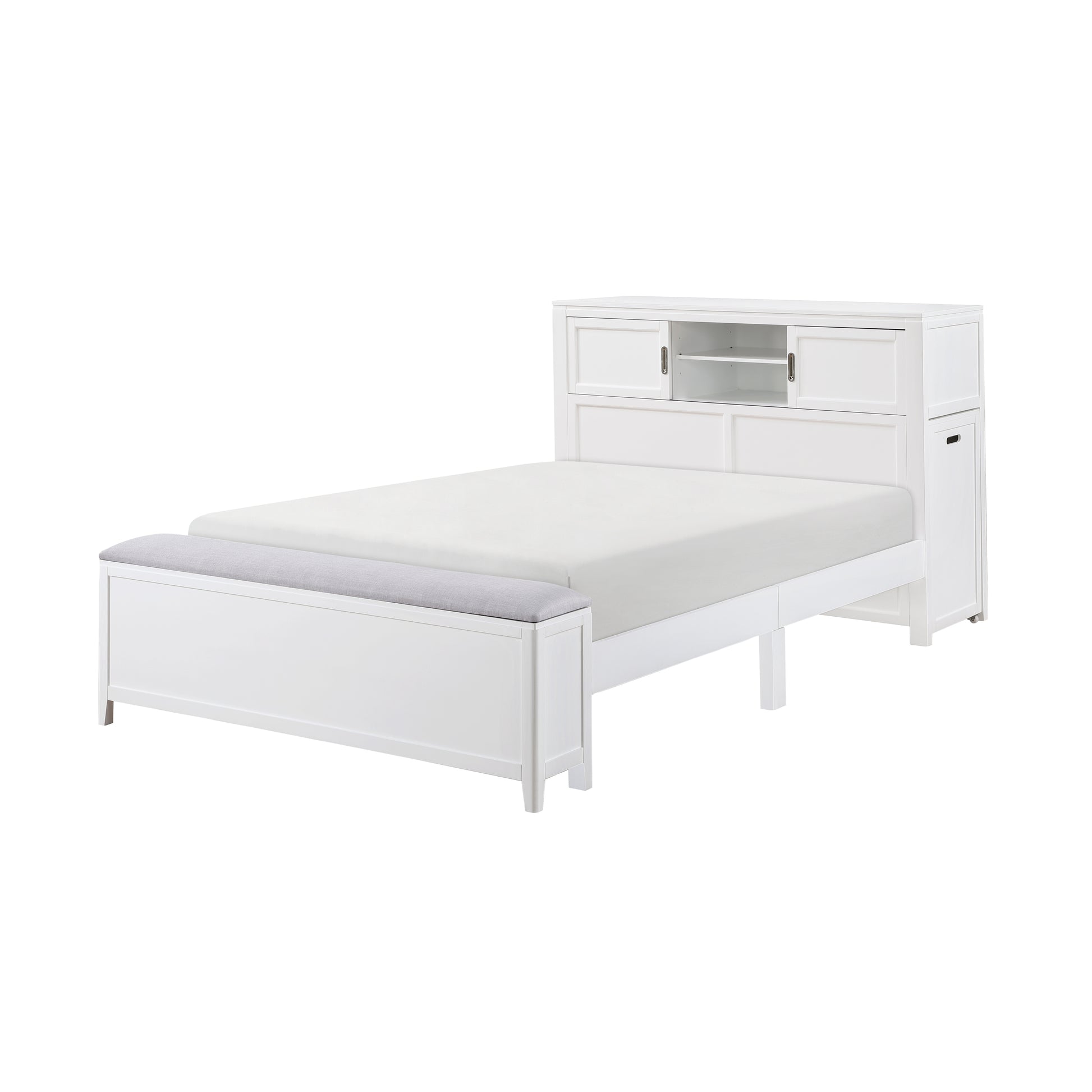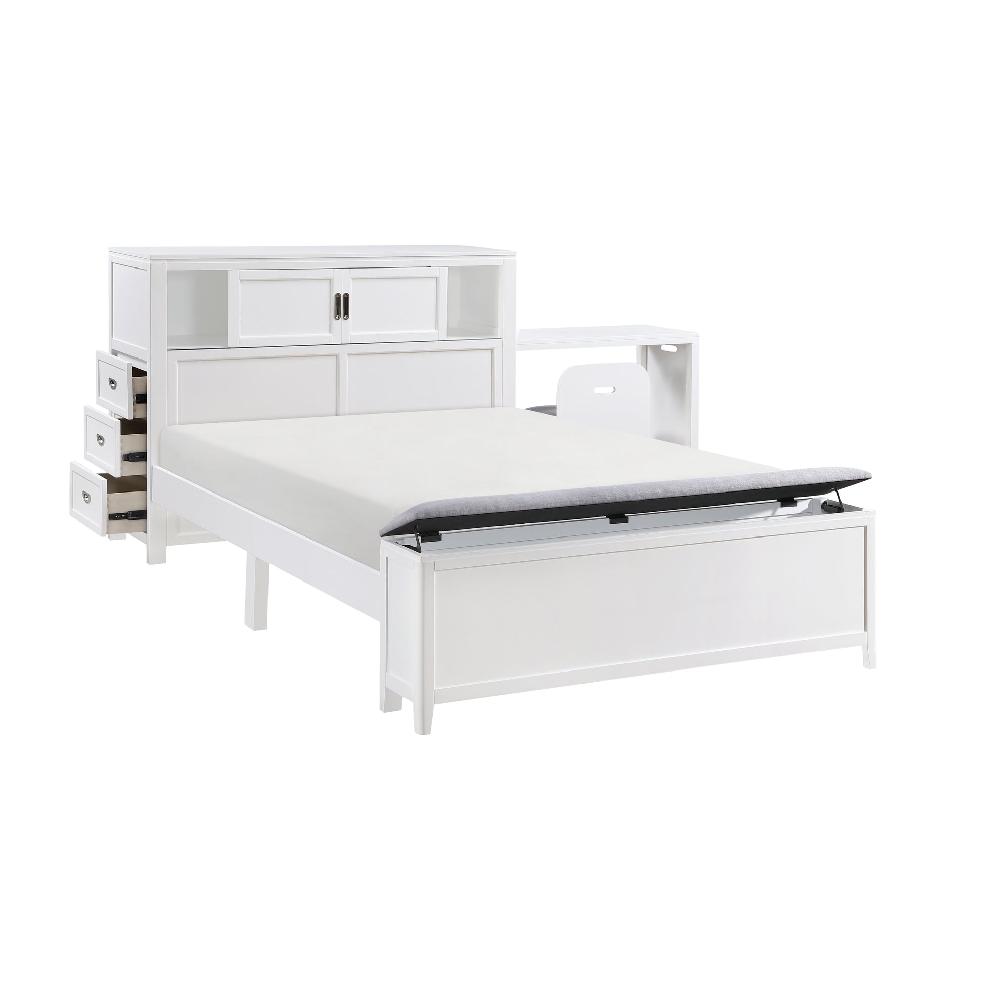 Maximize your child's bedroom space with this multifunctional white bookcase bed, designed for both style and practicality. Crafted from wood and engineered wood with a sleek white finish, this bed features a bookcase headboard with a hidden desk and foam-cushioned stool, perfect for study or creative activities. The footboard includes a convenient storage bench, while the headboard offers three dovetail drawers with smooth ball-bearing glides for organized storage. Polished nickel-tone flush ring pulls add a touch of sophistication, and the design eliminates the need for a foundation or box spring, making it a space-saving and efficient choice for any bedroom.