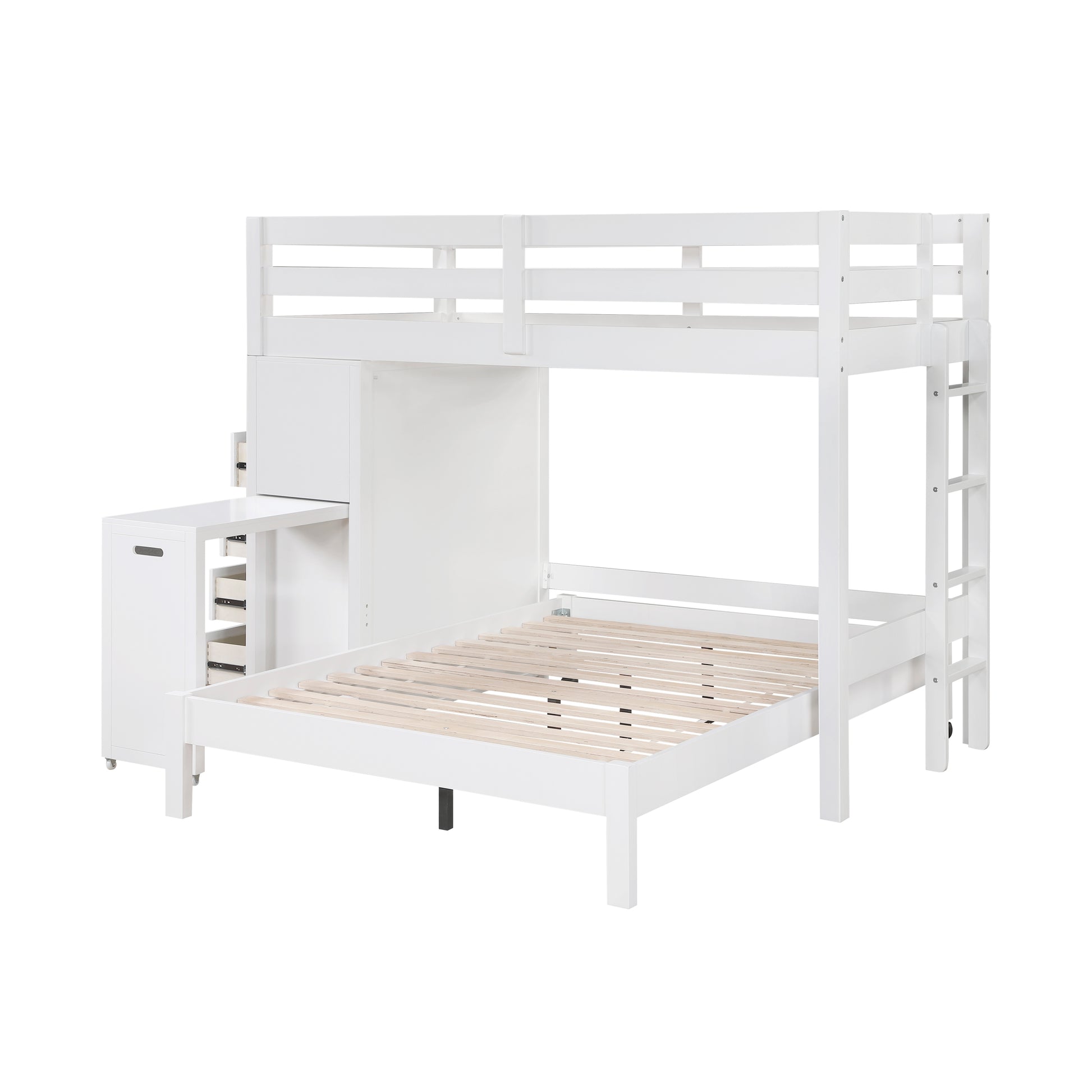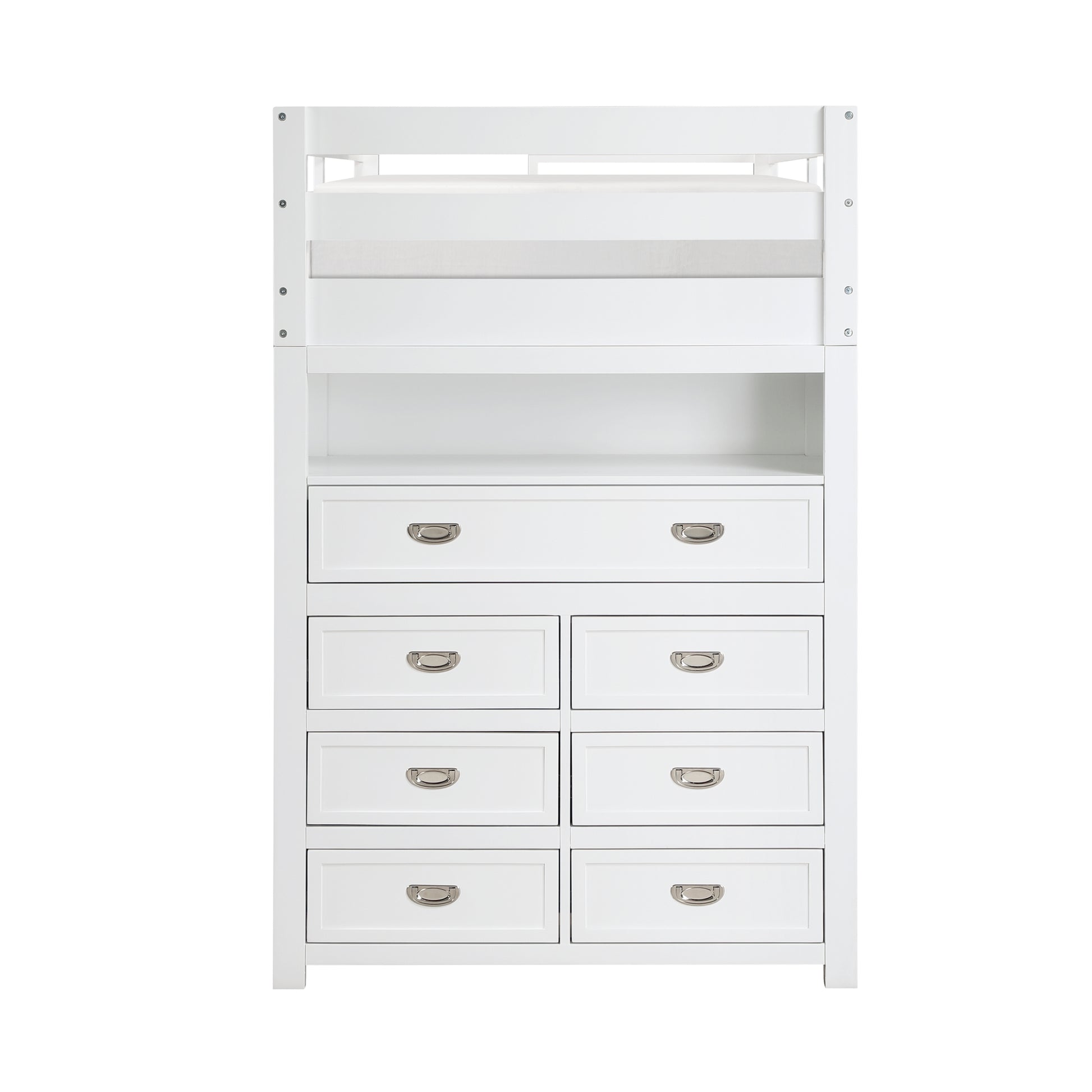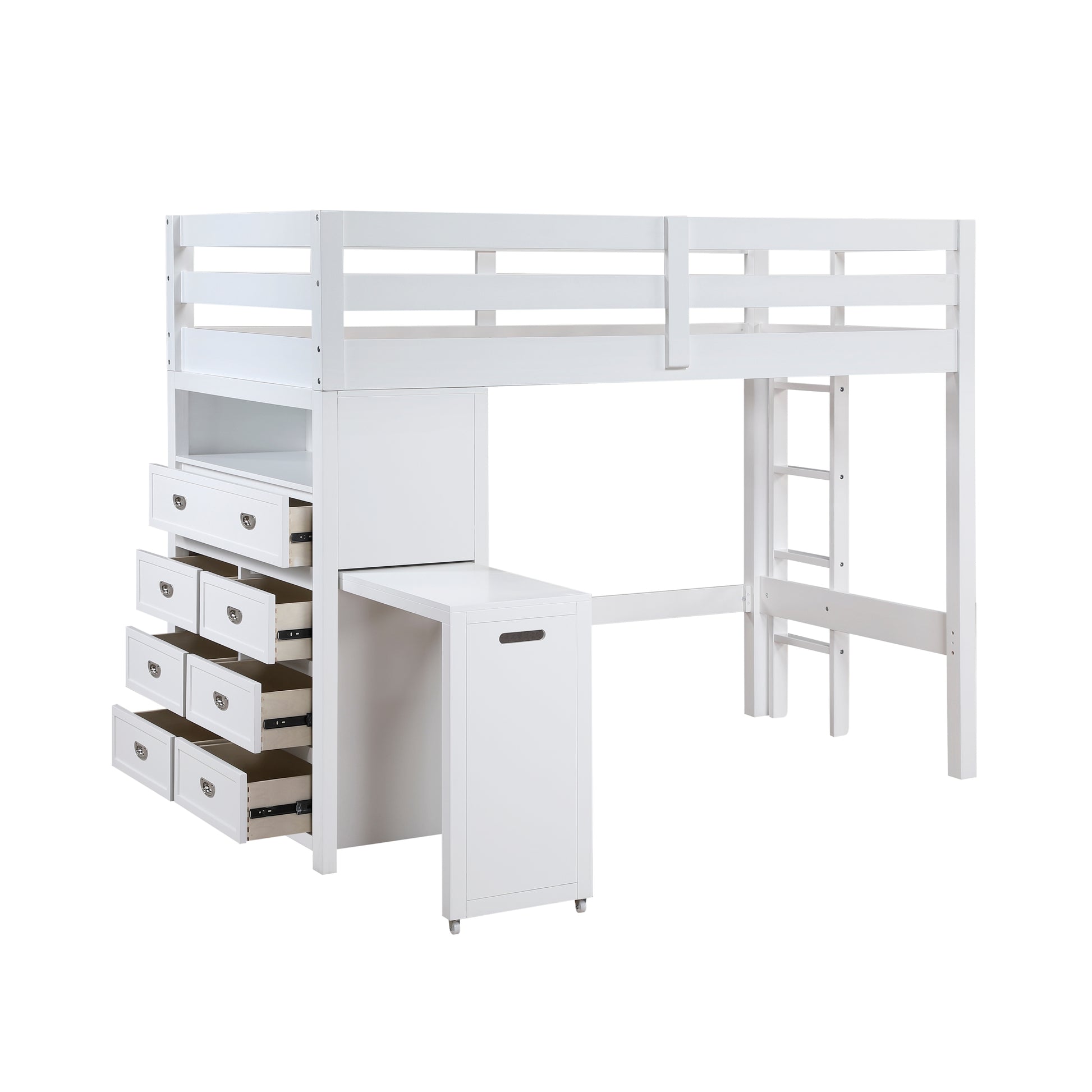 Maximize your child's bedroom space with this multifunctional white loft bunk bed, designed for both style and practicality. Crafted from wood and engineered wood with a sleek white finish, this bunk bed features a top twin bunk with guard rails for safety and a full-size lower bed. The built-in storage unit includes seven dovetail drawers with smooth ball-bearing glides for organized storage, and a hidden desk on casters that easily rolls out for study or creative activities. Polished nickel-tone flush ring pulls add a touch of sophistication, and the design eliminates the need for a foundation or box spring, making it a space-saving and efficient choice for any bedroom.