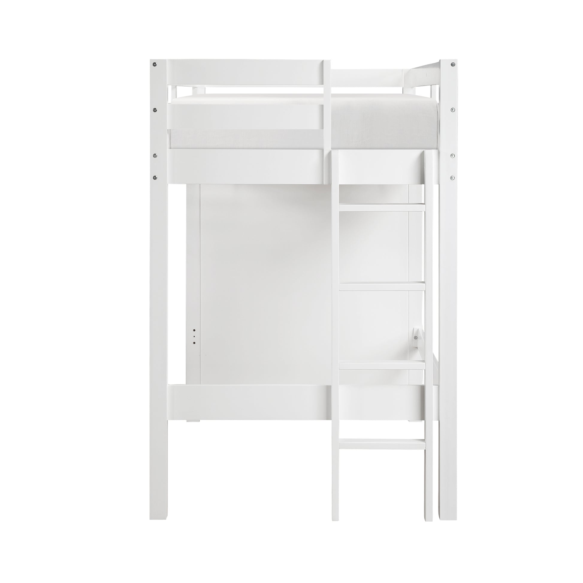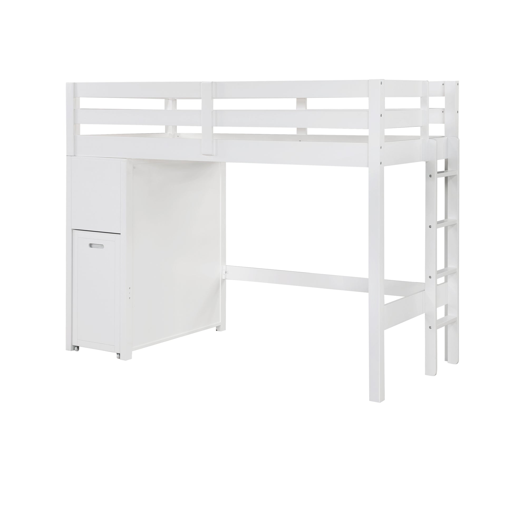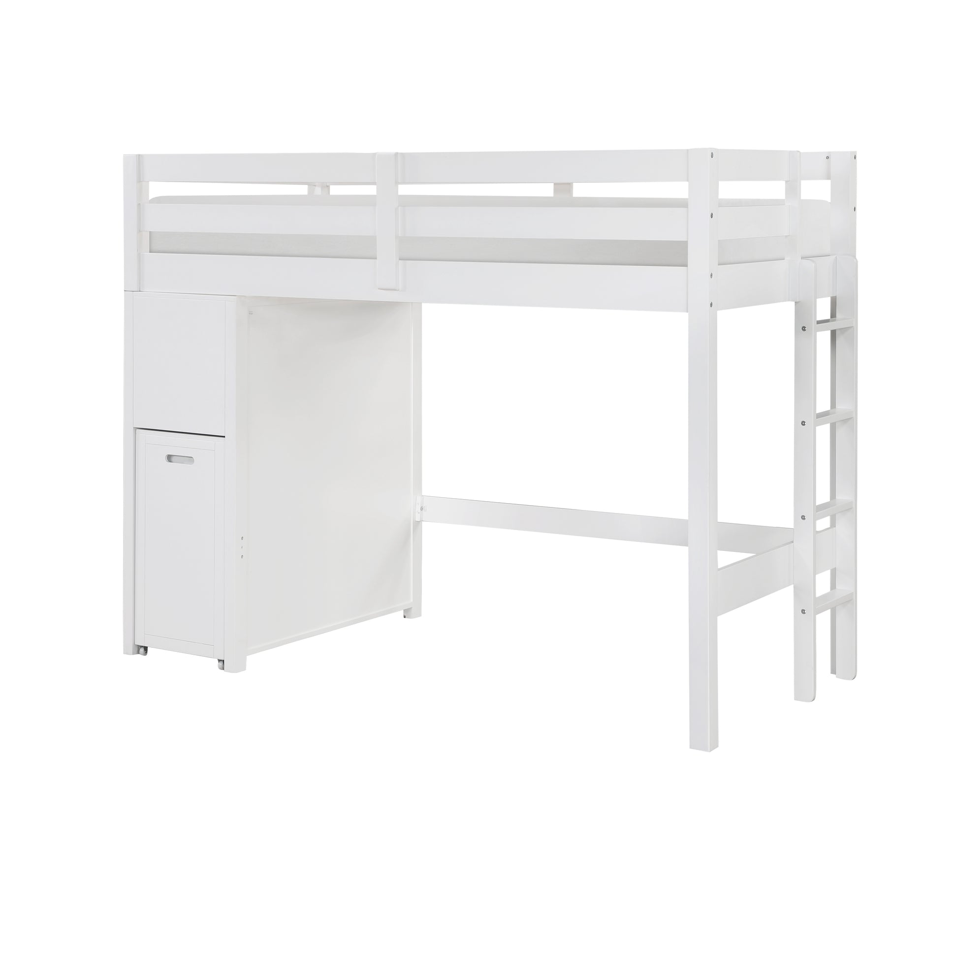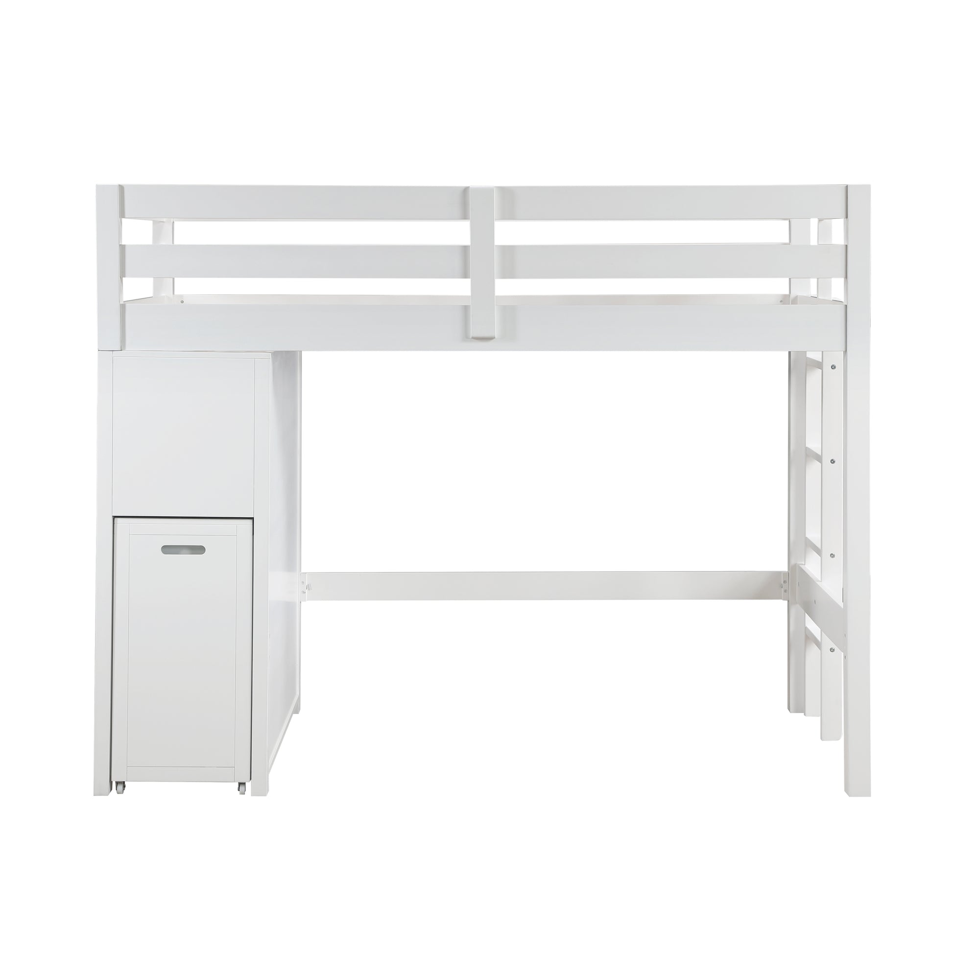 Maximize your child's bedroom space with this multifunctional white loft bunk bed, designed for both style and practicality. Crafted from wood and engineered wood with a sleek white finish, this bunk bed features a top twin bunk with guard rails for safety and a full-size lower bed. The built-in storage unit includes seven dovetail drawers with smooth ball-bearing glides for organized storage, and a hidden desk on casters that easily rolls out for study or creative activities. Polished nickel-tone flush ring pulls add a touch of sophistication, and the design eliminates the need for a foundation or box spring, making it a space-saving and efficient choice for any bedroom.