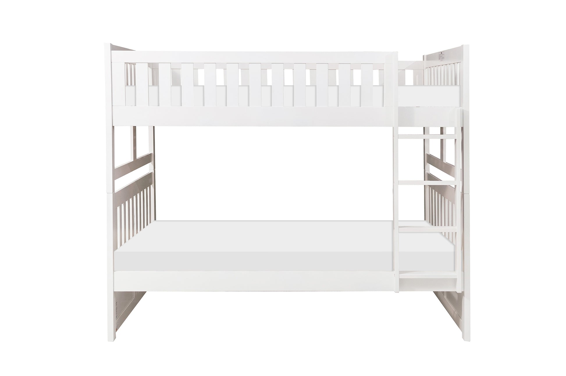 Maximizing sleep space is achieved with the stylish Galen Collection. This transitional full over full bunkbed is featured in a white finish making it an appropriate choice for a number of youth bedroom settings. Also available: twin over twin bunkbed, twin over full bunkbed, twin over twin trundle bed with two built-in drawers, twin/twin bunk with reversible storage stair steps, underbed dual toy boxes, twin trundle, nightstand, dresser, mirror and chest.