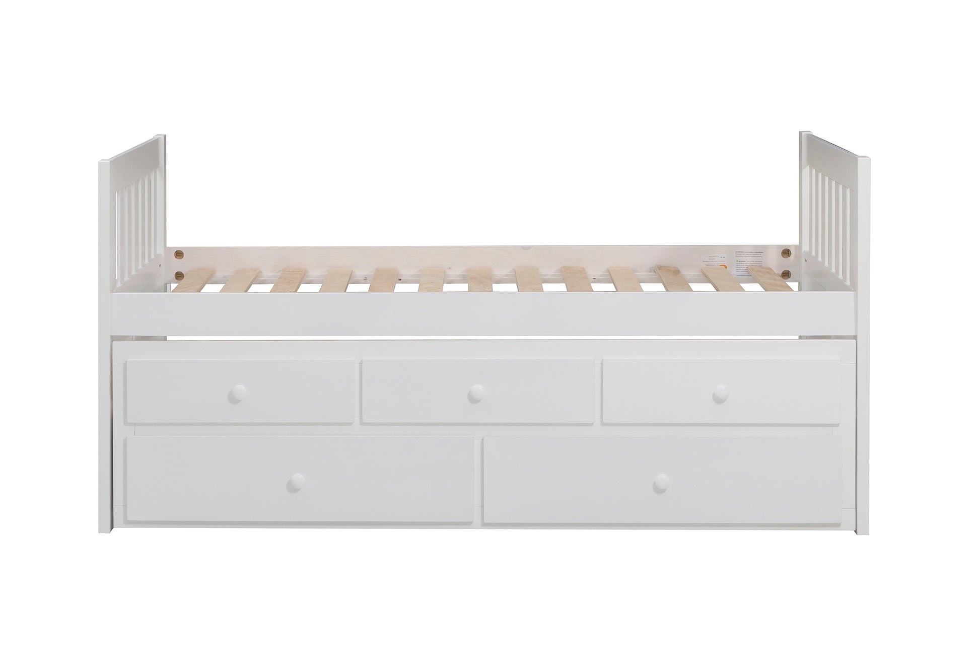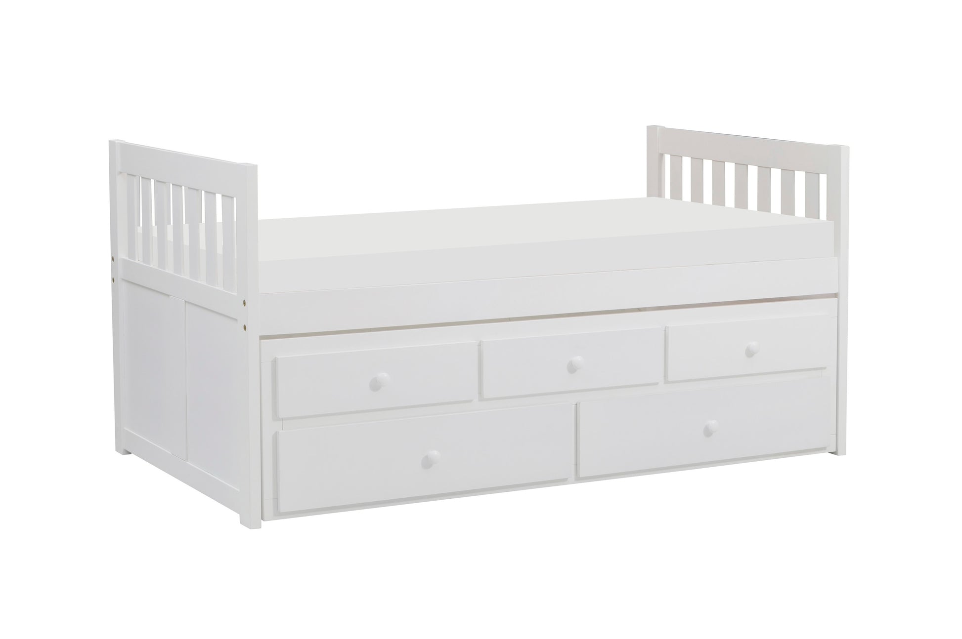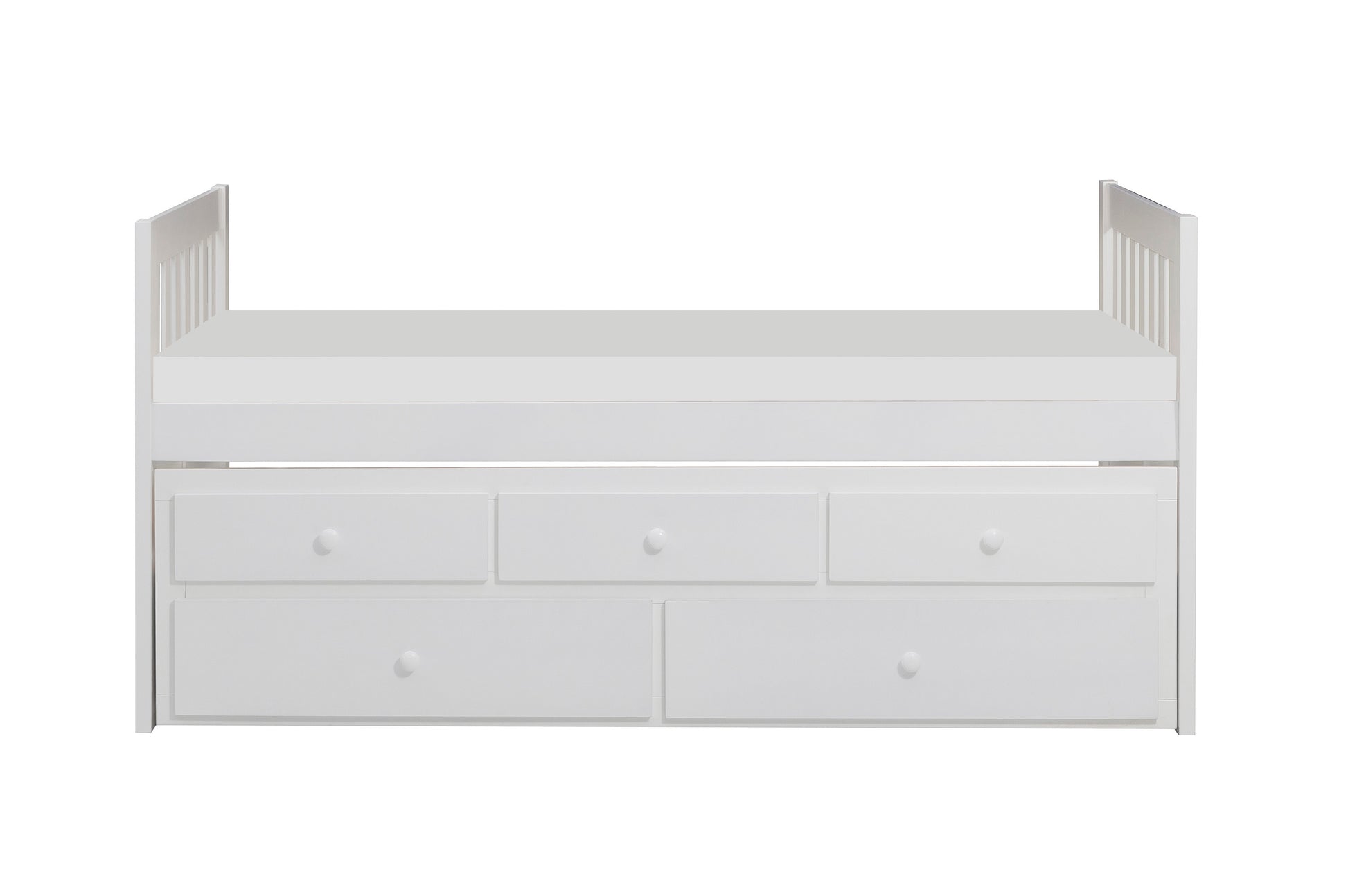 Maximizing sleep space is achieved with the stylish Galen Collection. This transitional twin over twin trundle bed – with two built-in storage drawers - is featured in a white finish making it an appropriate choice for a number of youth bedroom settings. Also available: twin over twin bunkbed, twin over full bunkbed, full over full bunkbed, twin over twin bunk with reversible storage stair steps, underbed dual toy boxes, twin trundle, nightstand, dresser, mirror and chest.