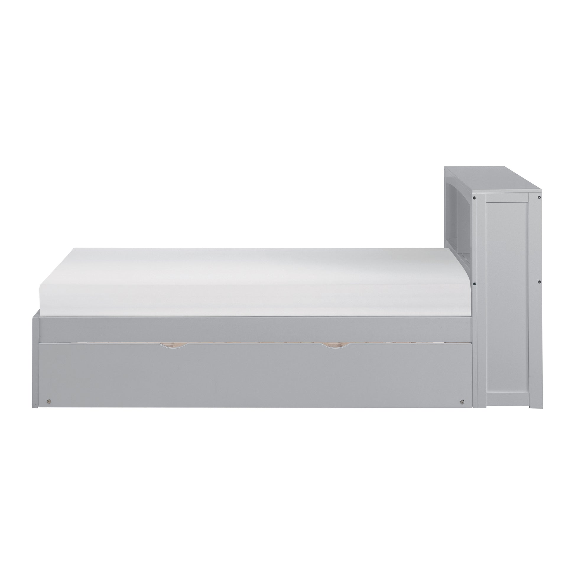 Maximizing sleep space is achieved with the stylish Orion Collection. This transitional twin bed is featured in a gray finish making it an appropriate choice for a number of youth bedroom settings. The bookcase headboard allows for convenient storage within arm’s reach. Also available is a twin trundle unit that neatly stores beneath the main bed creating the additional sleep space you need.