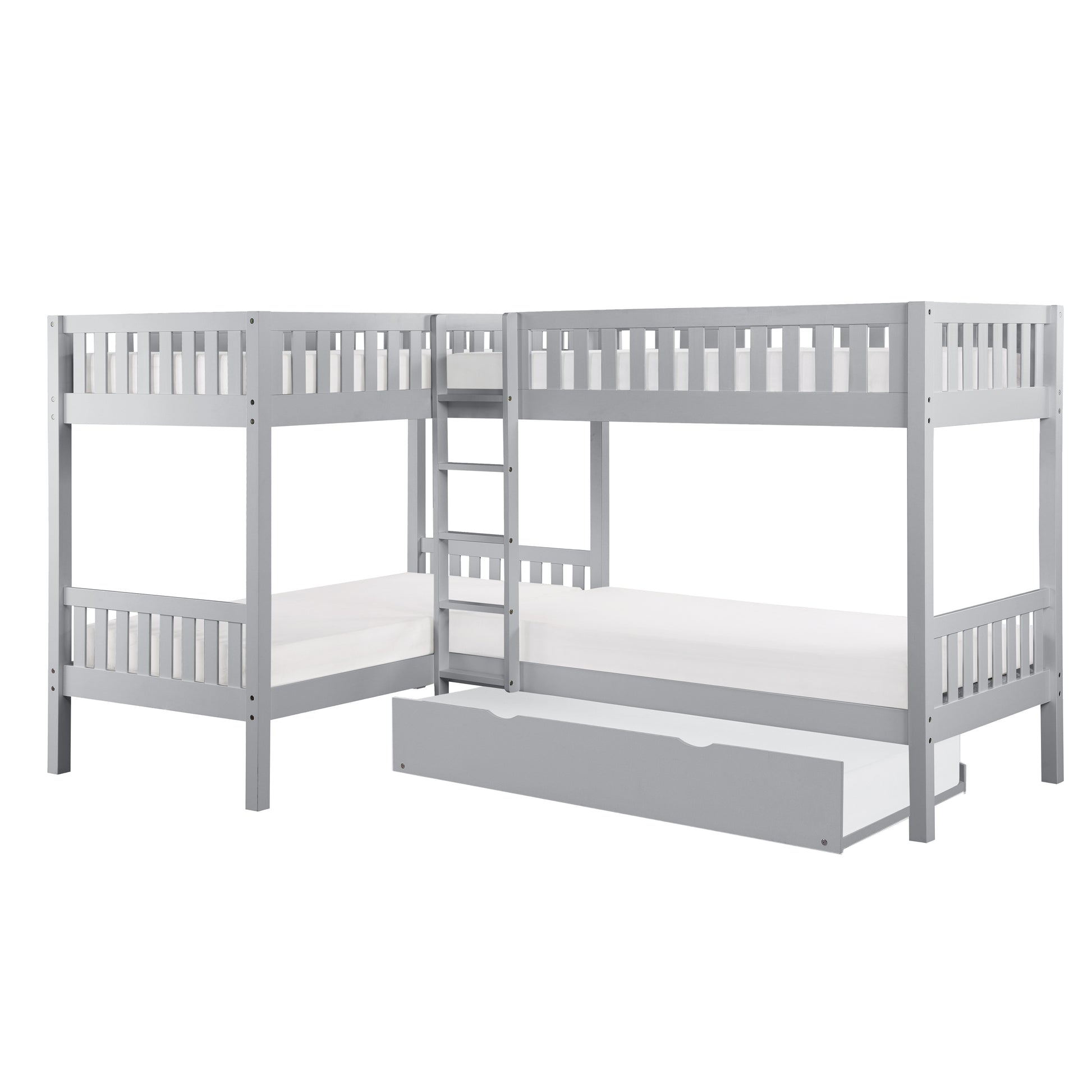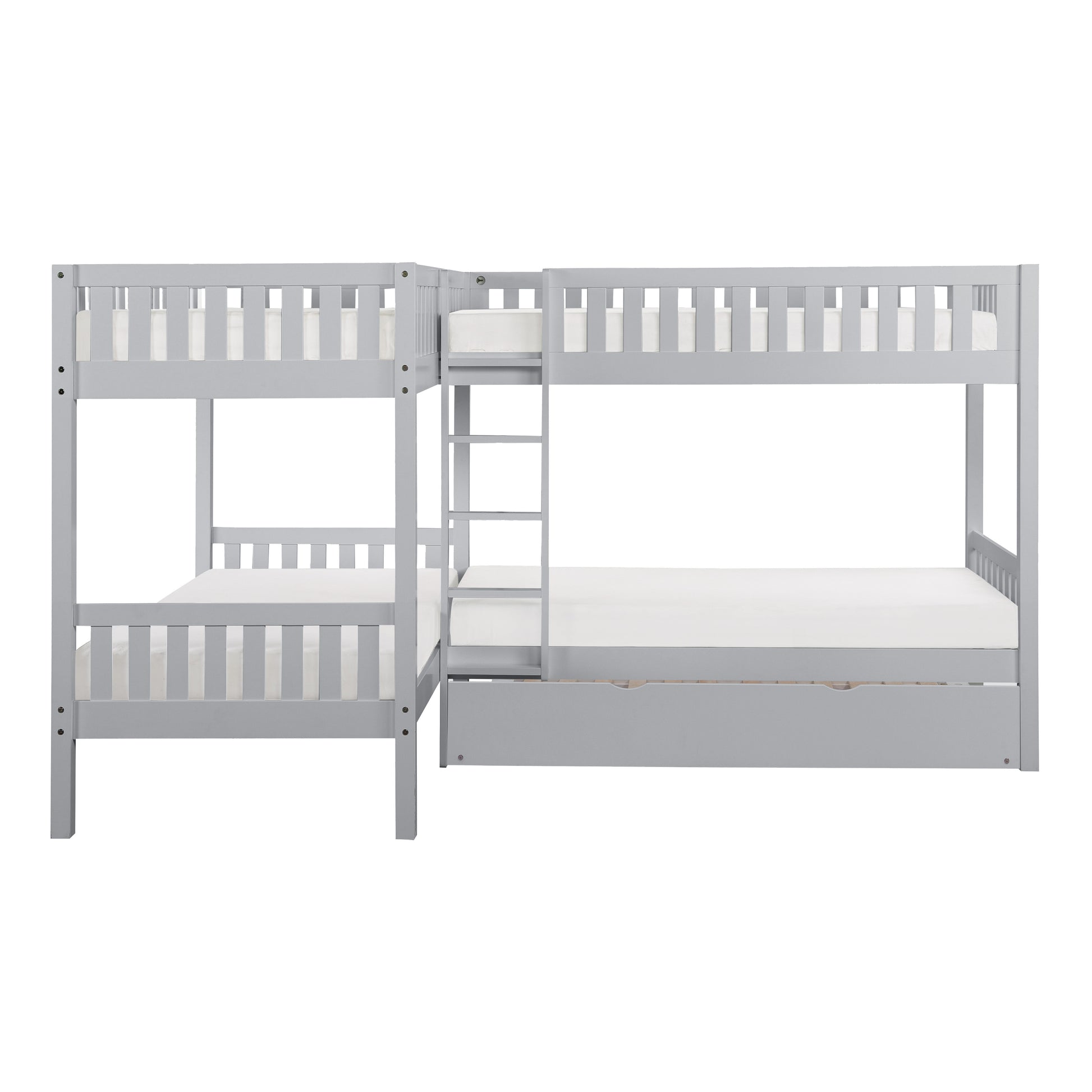 Maximizing sleep space is achieved with the stylish Orion Collection. This transitional corner bunkbed is featured in a gray finish making it an appropriate choice for a number of youth bedroom settings. The four twin beds that comprise the unit conjoin to fit perfectly within your available space. The available twin trundle unit expands the sleep space to accommodate 5 people further maximizing the occupancy of your bedroom.